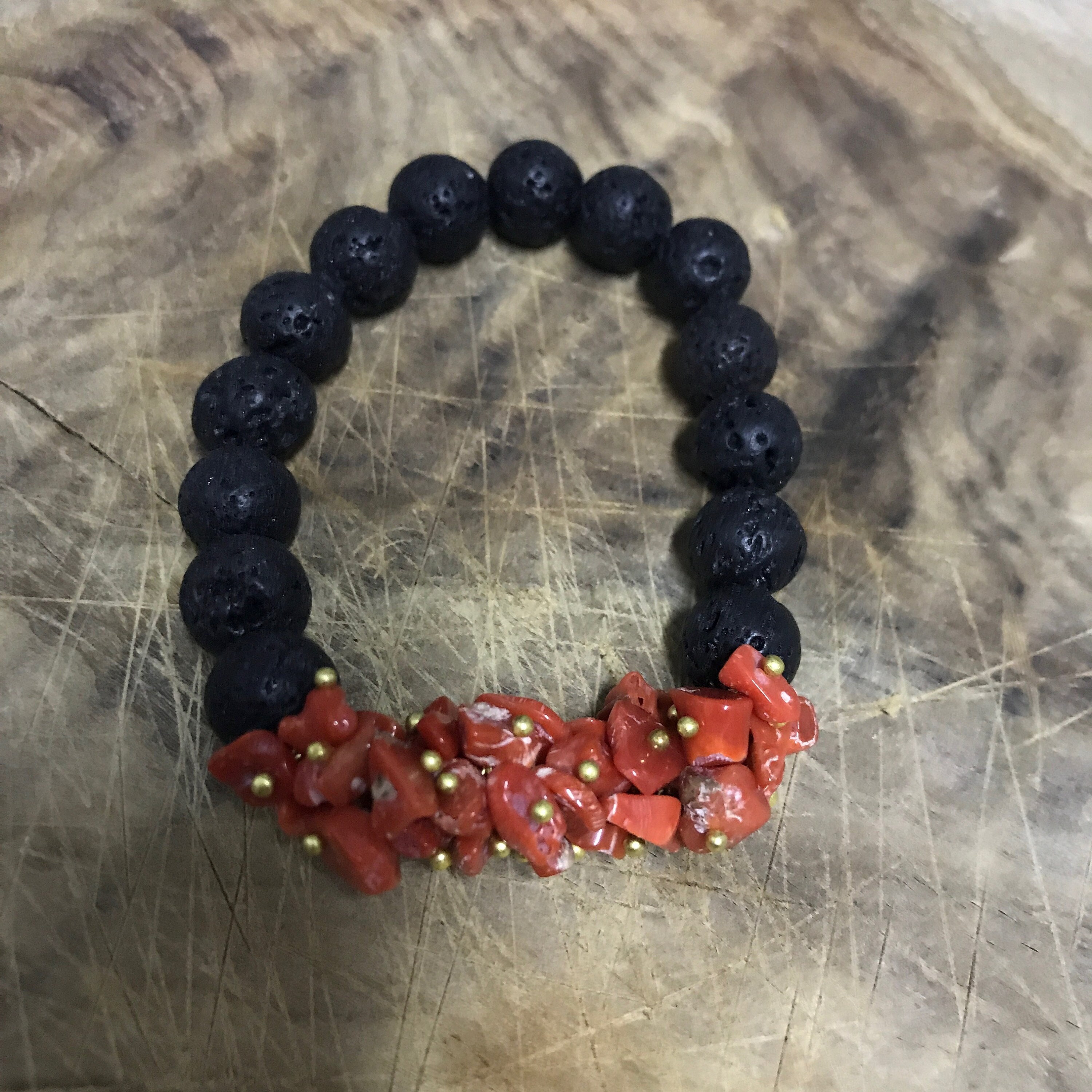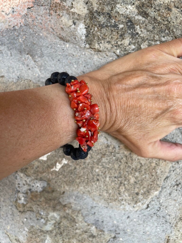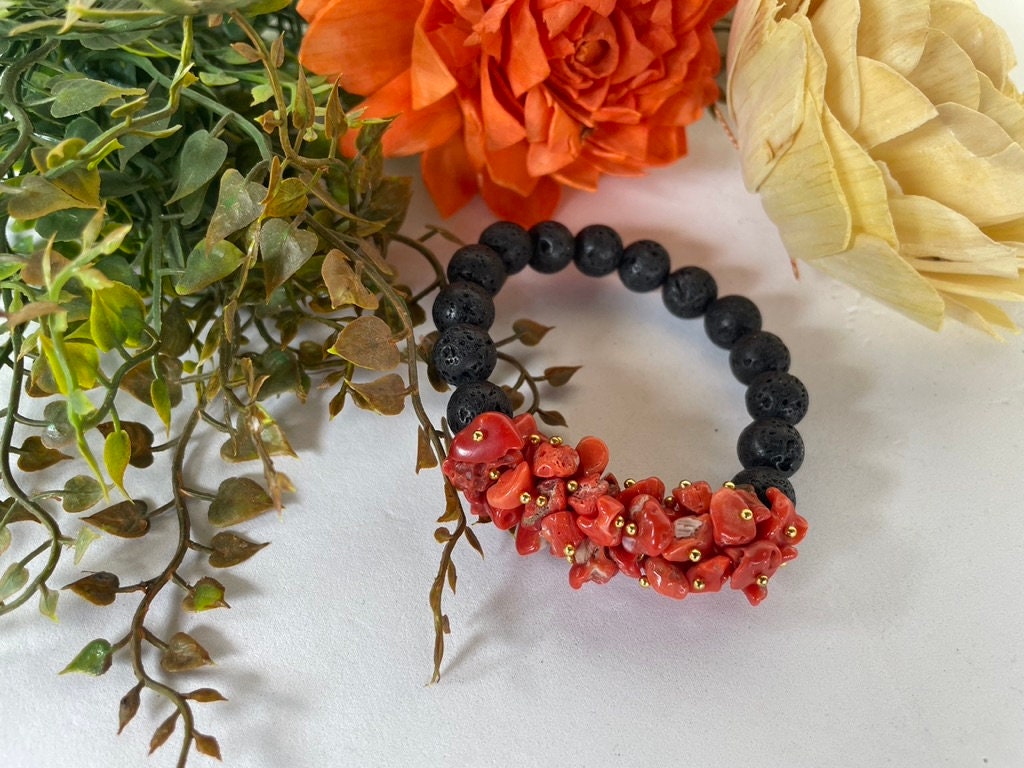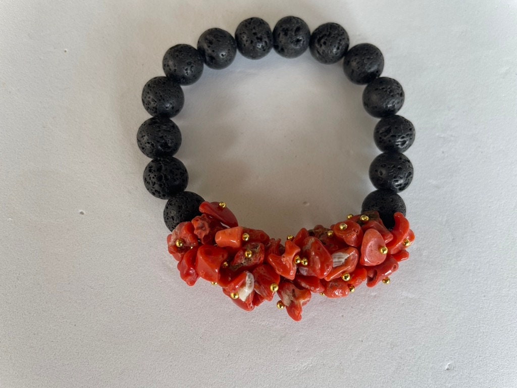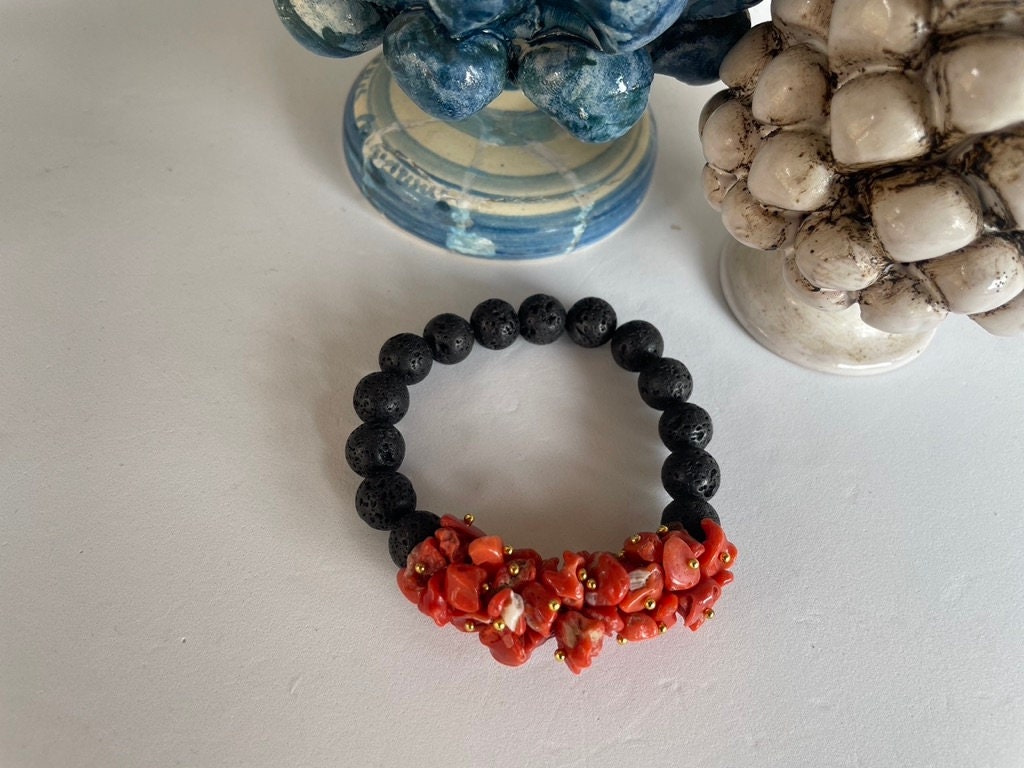Bracciale elastico artigianale con perle di pietra lavica e lungo grappolo di chips di corallo rosso.