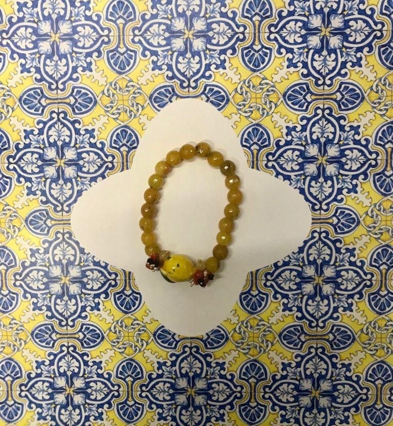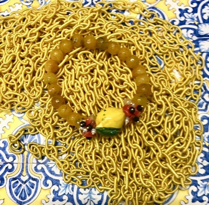 Realizzato con perle di Agata gialla, limone in ceramica di Caltagirone dipinta a mano e chips di corallo rosso.