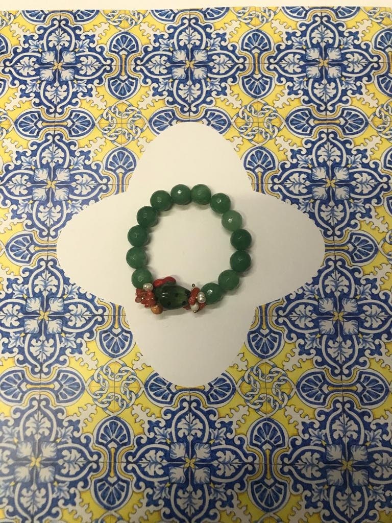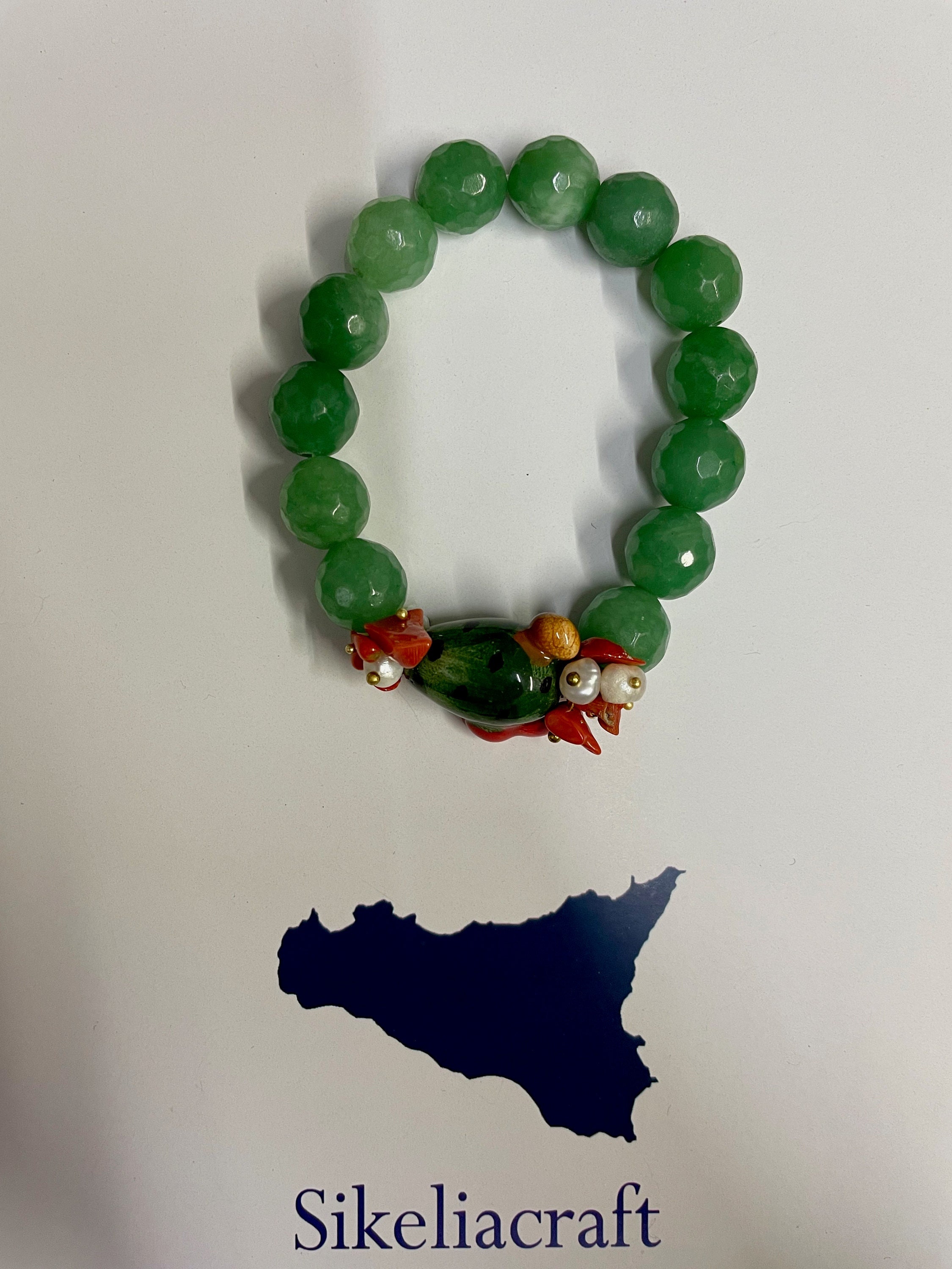 Realizzato con perle di Agata verde, Fico d’India in ceramica di Caltagirone dipinta a mano, chips di corallo rosso e perle di fiume.
