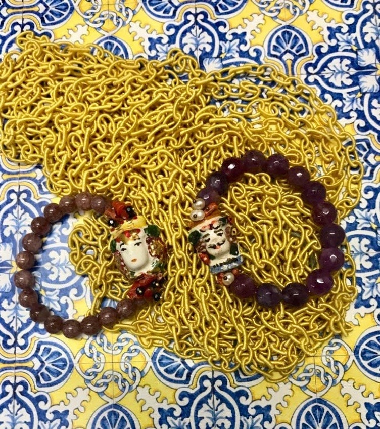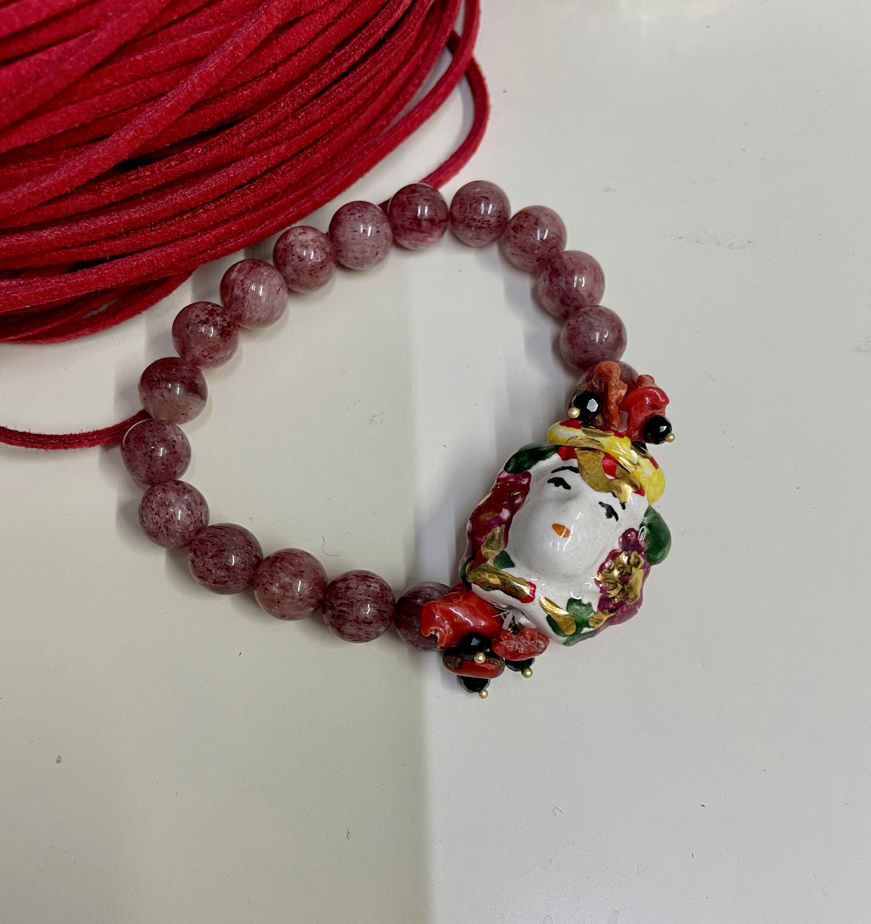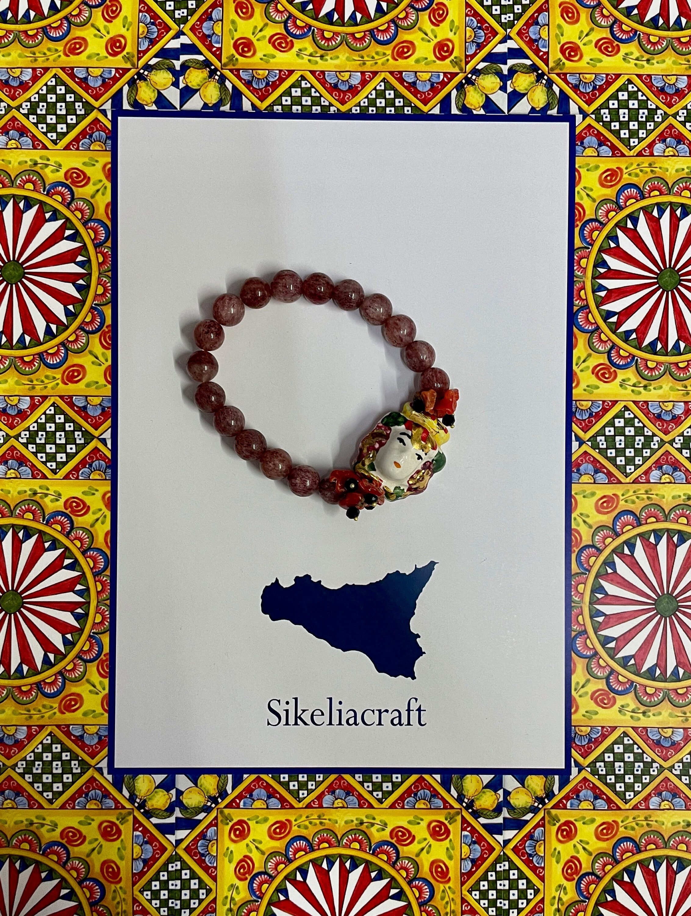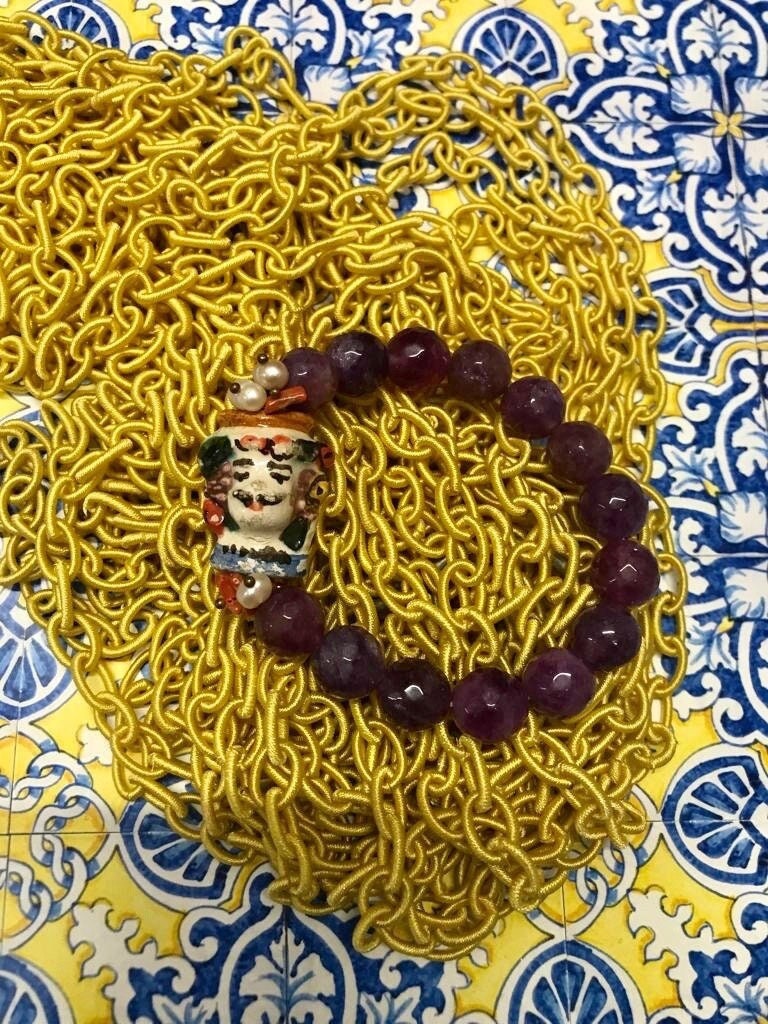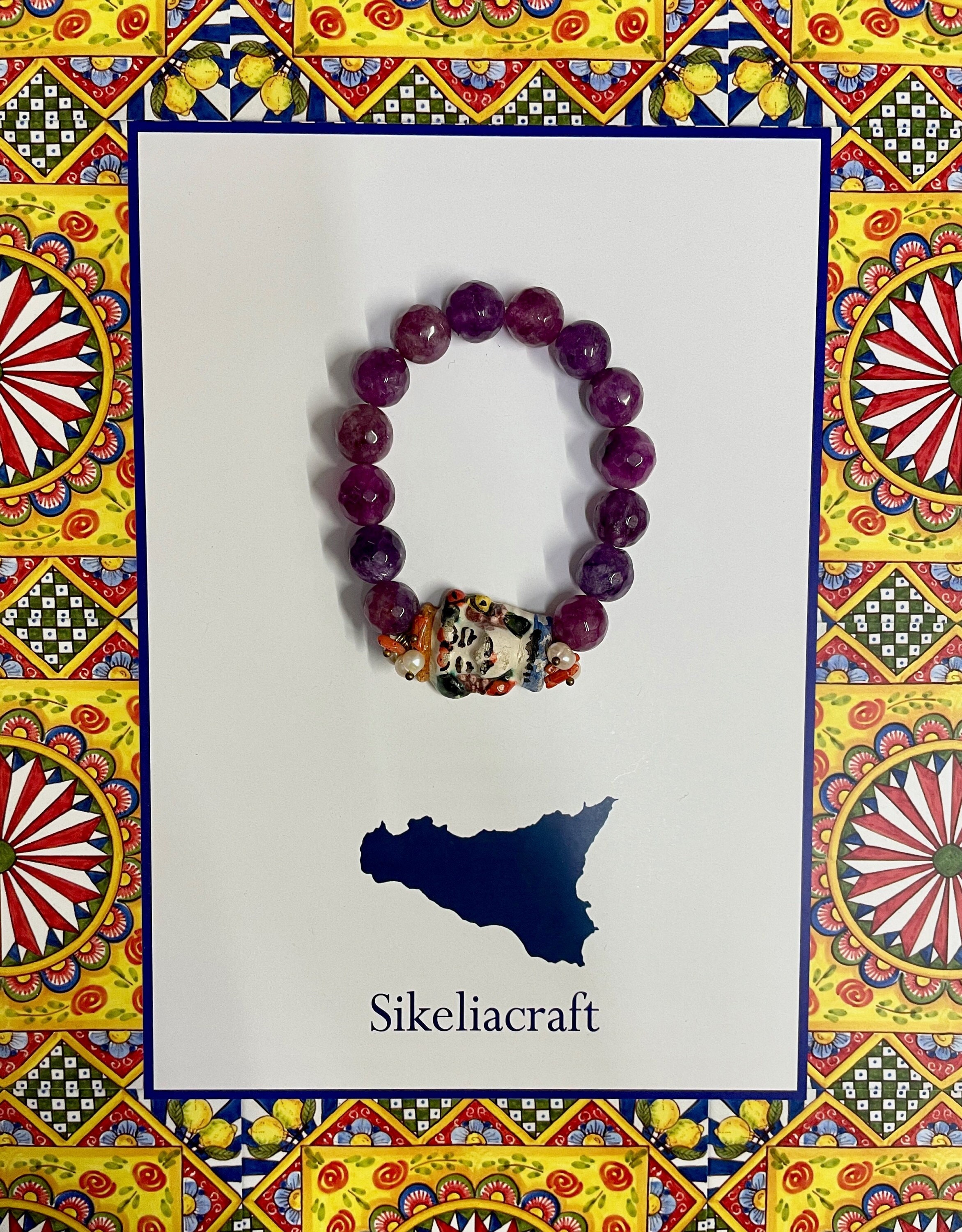 Realizzato con perle di Agata viola, Testa di moro in ceramica di Caltagirone, dipinta a mano, chips di corallo rosso e perle di fiume.
