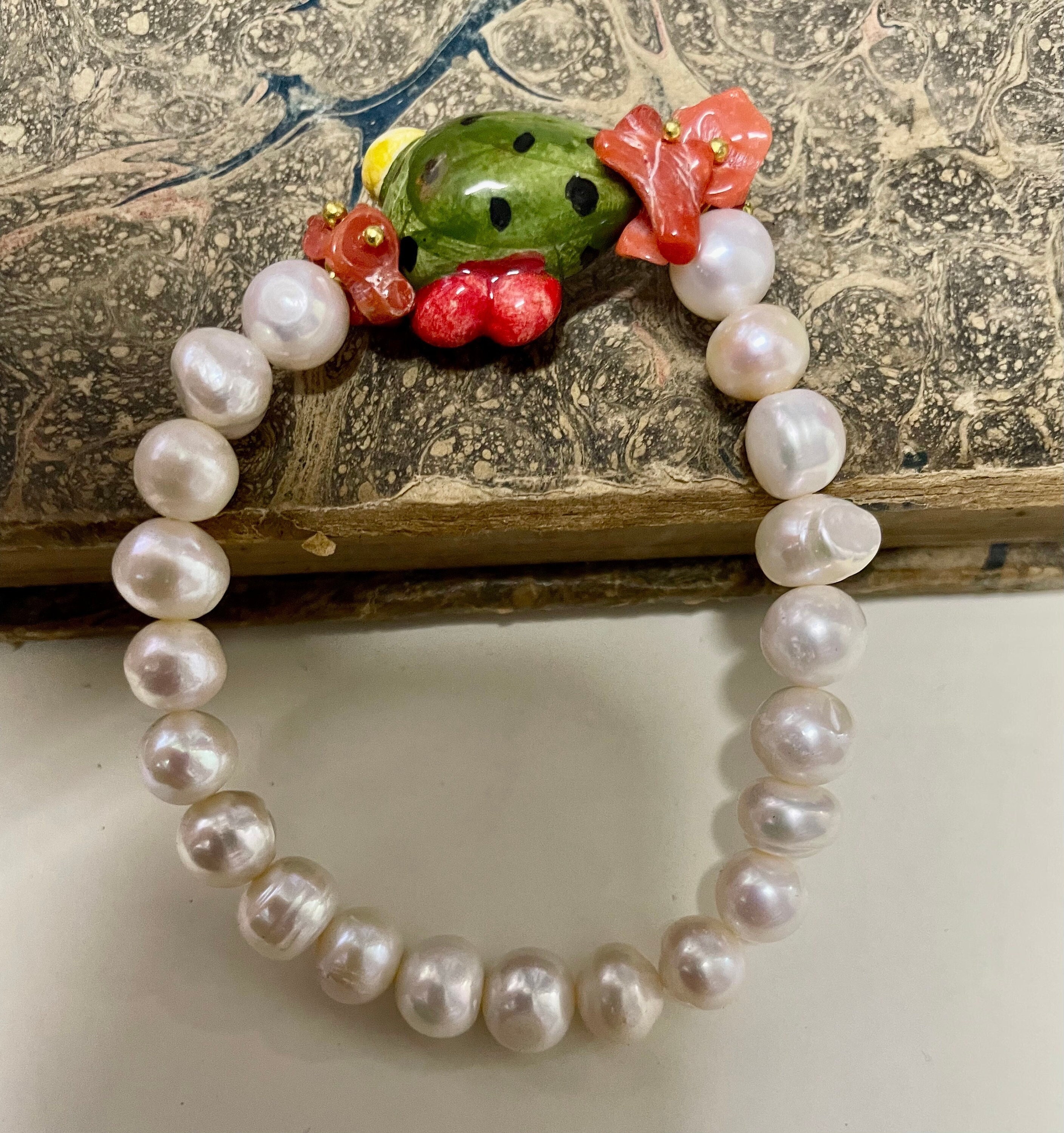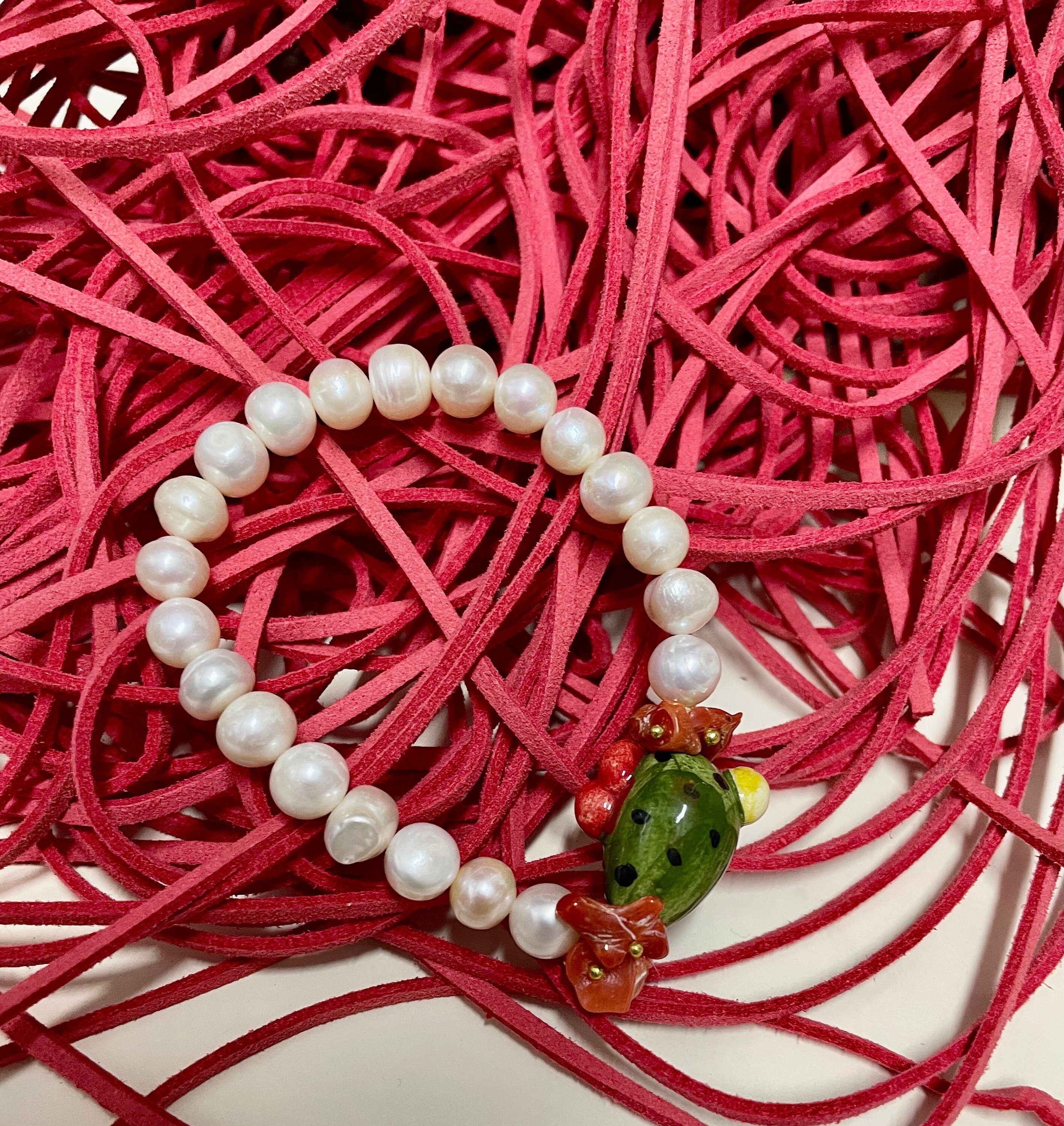 Realizzato con perle di fiume, Fico d’India in ceramica di Caltagirone, dipinta a mano, e chips di corallo rosso.