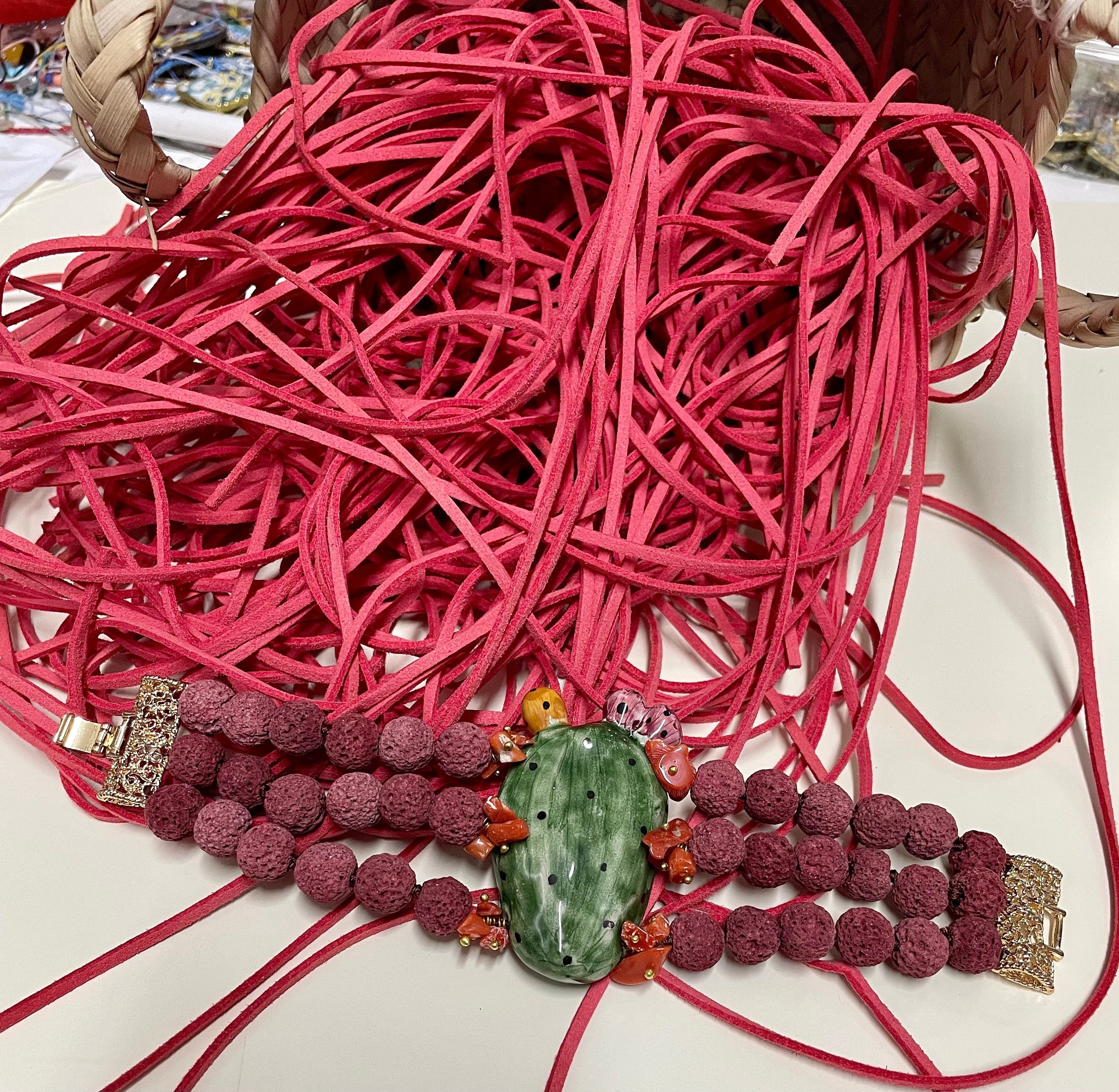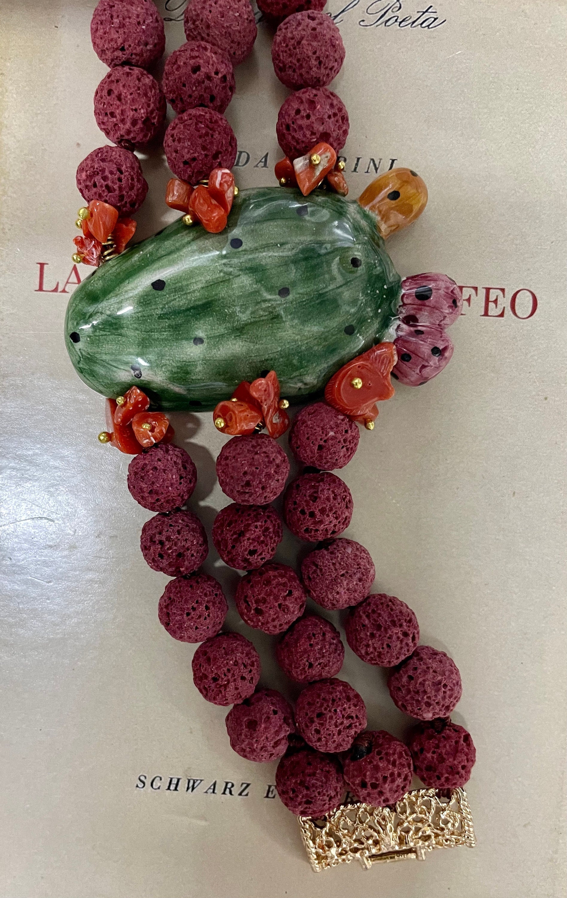 Realizzato con tre fili di perle di lava rossa, Fico d’India in ceramica di Caltagirone dipinta a mano e chips di corallo rosso.