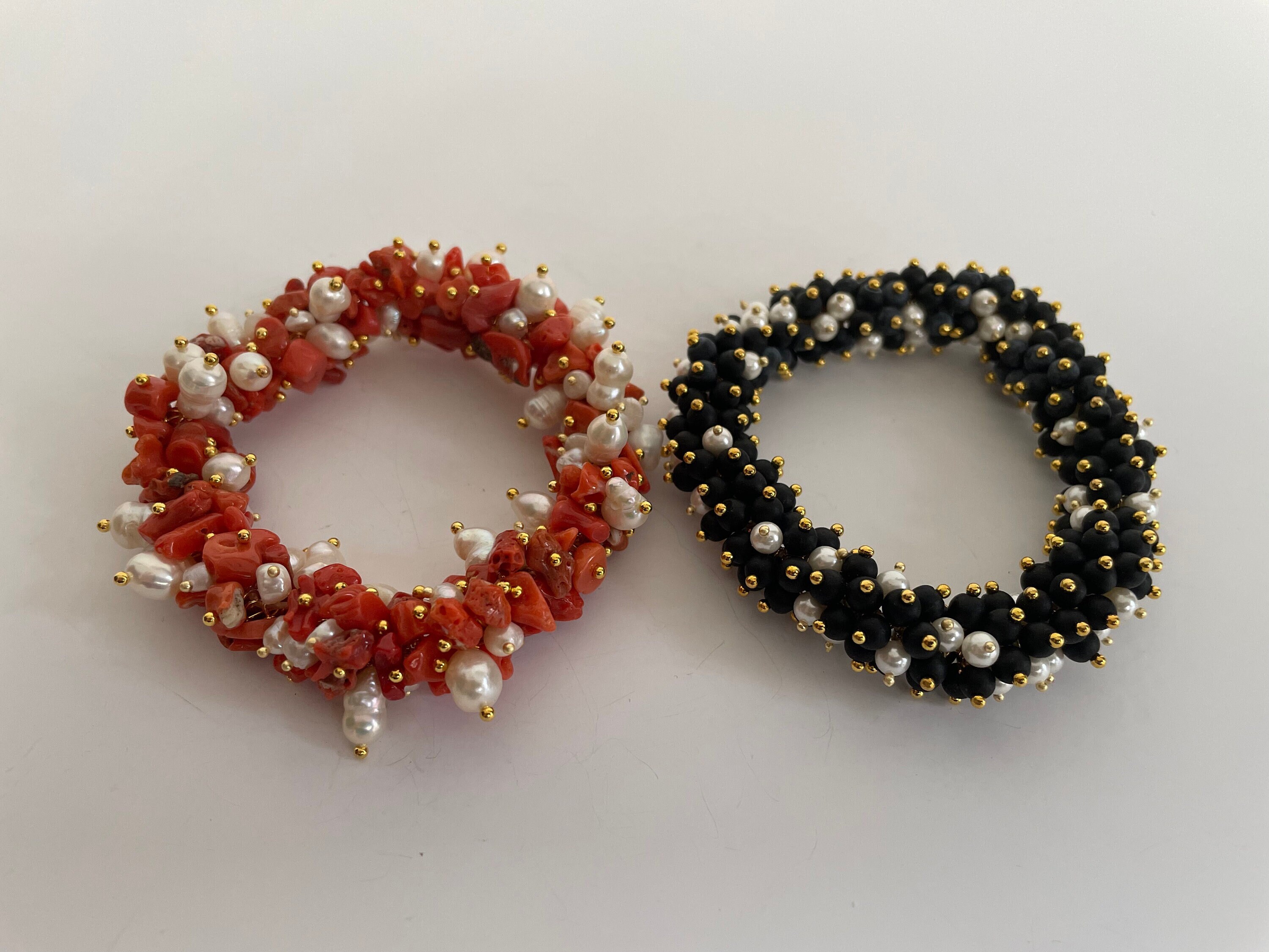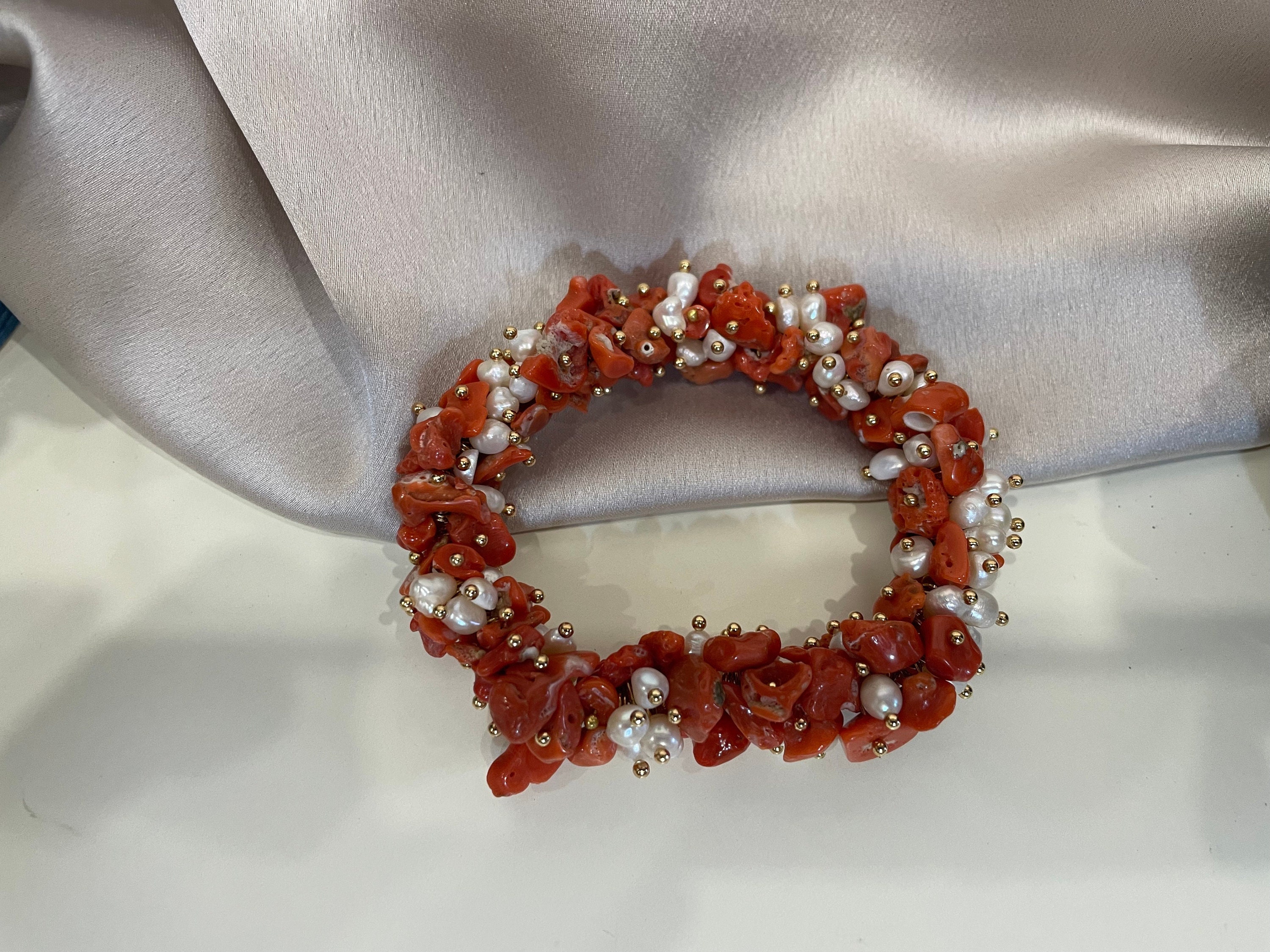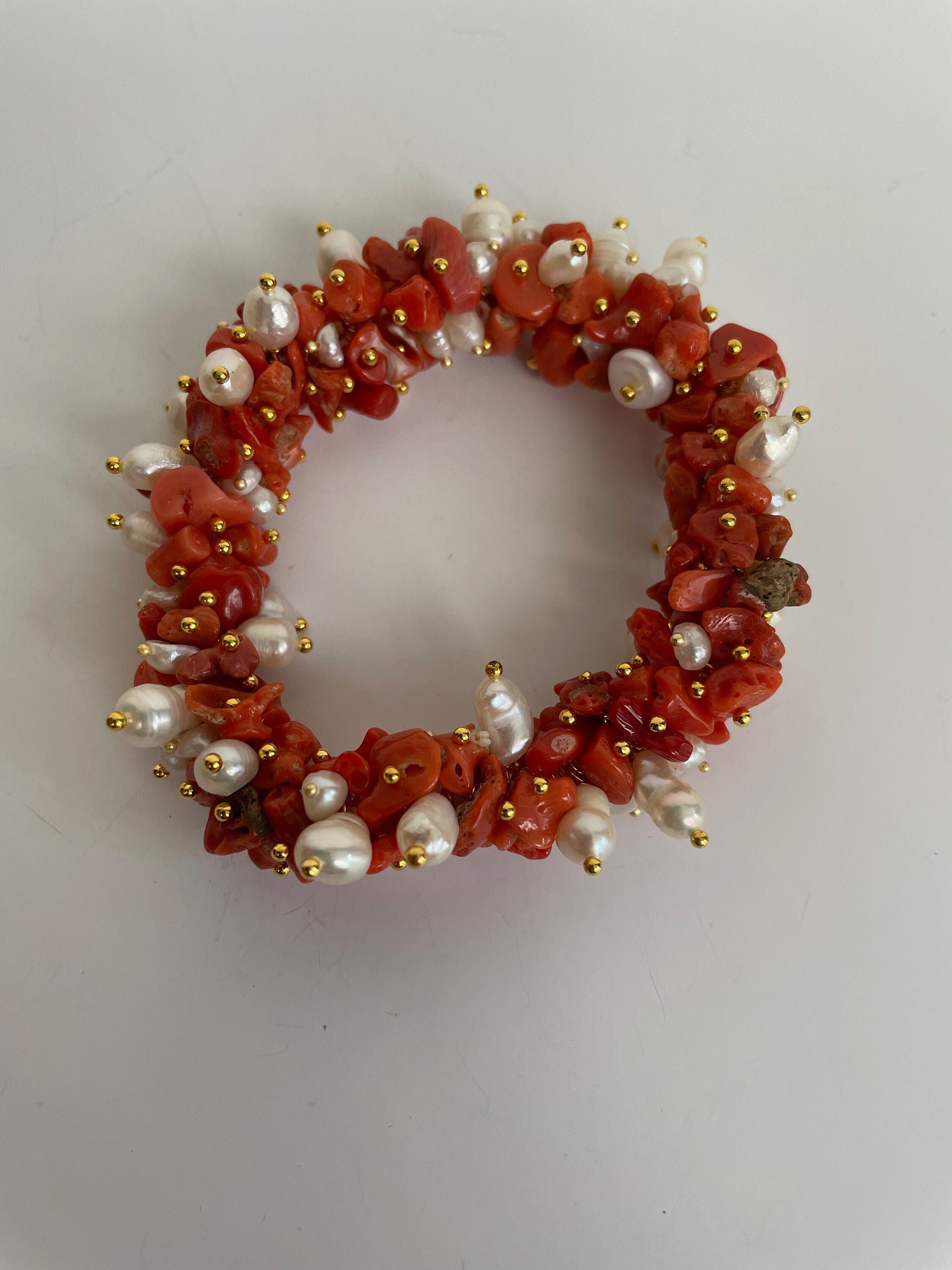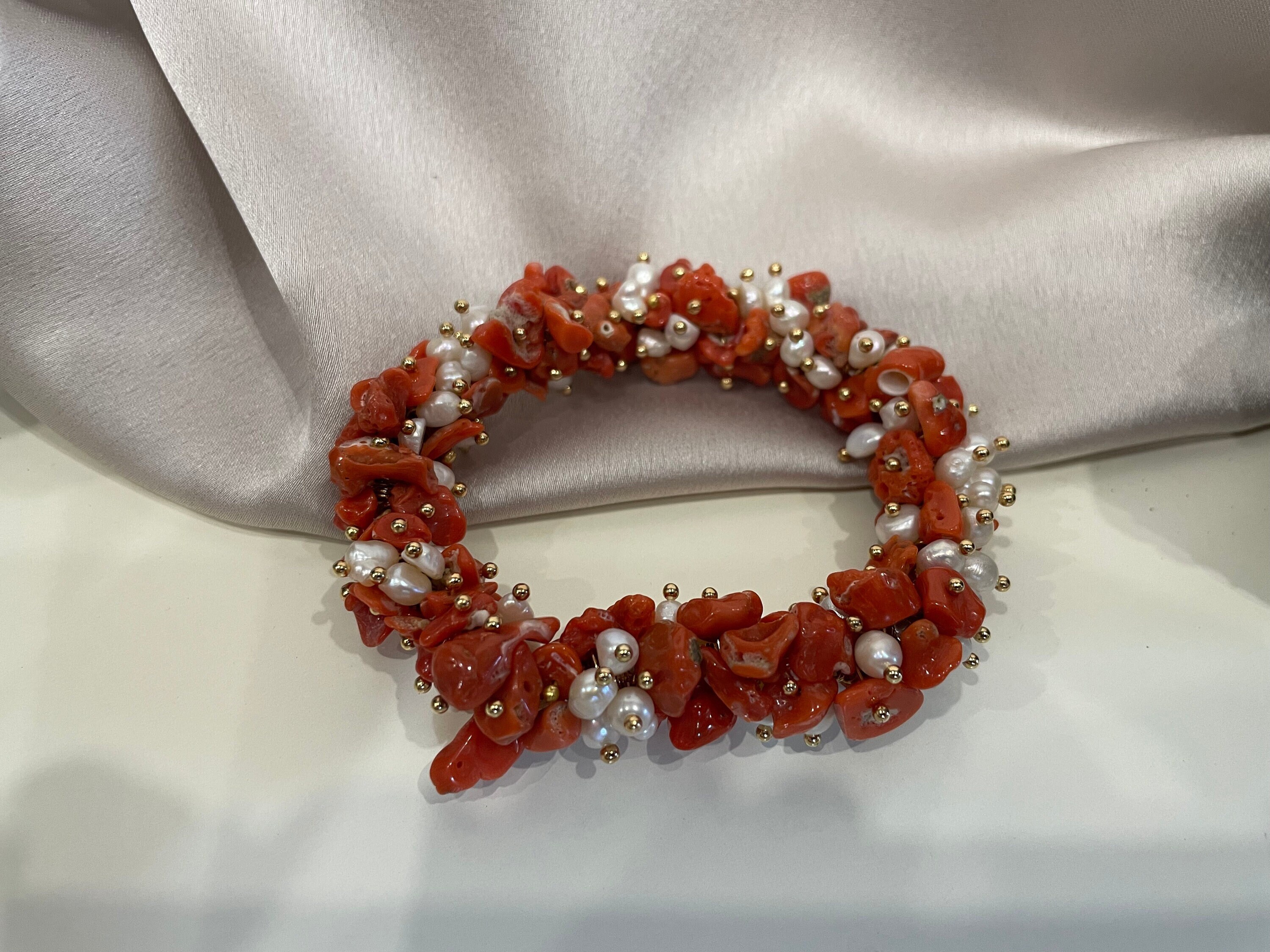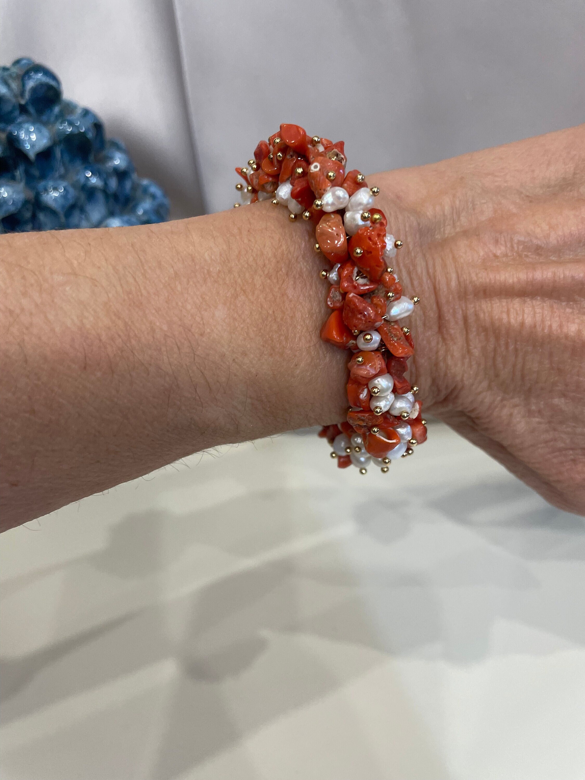 Bracciale elastico tempestato di chips di Corallo rosso genuino del Mediterraneo e perle di fiume.