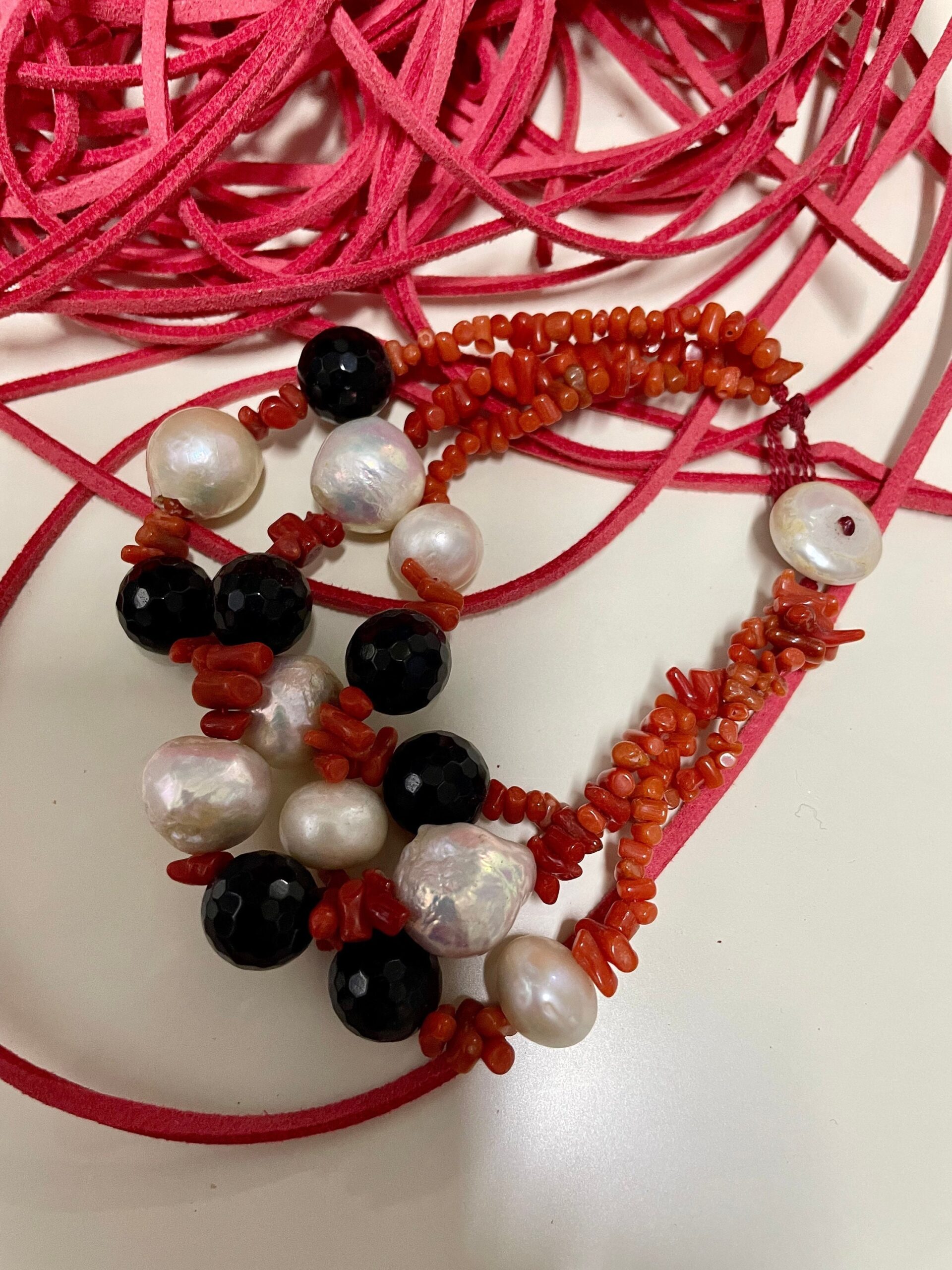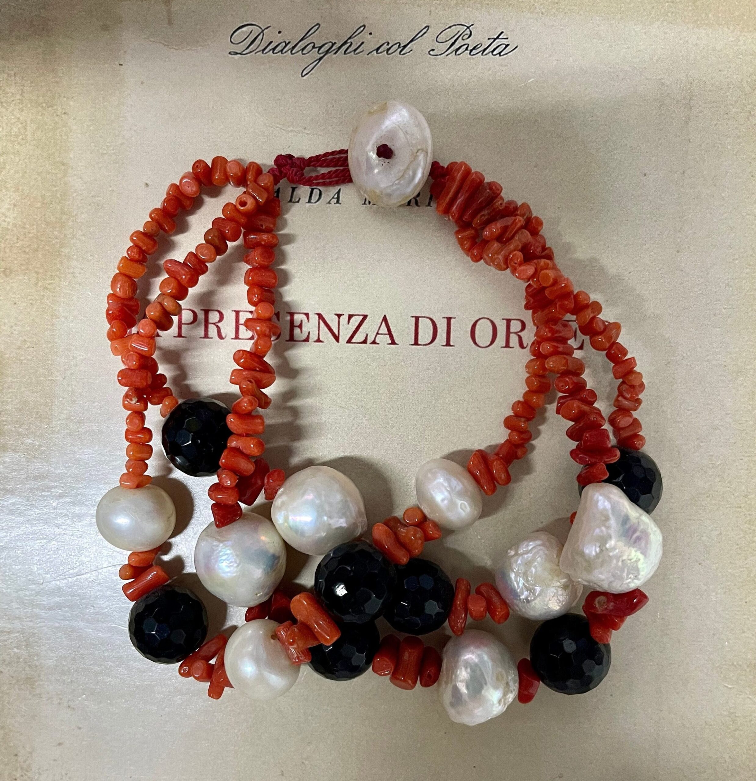 Realizzato con tre fili di chips di corallo, perle di fiume e perle di onice.