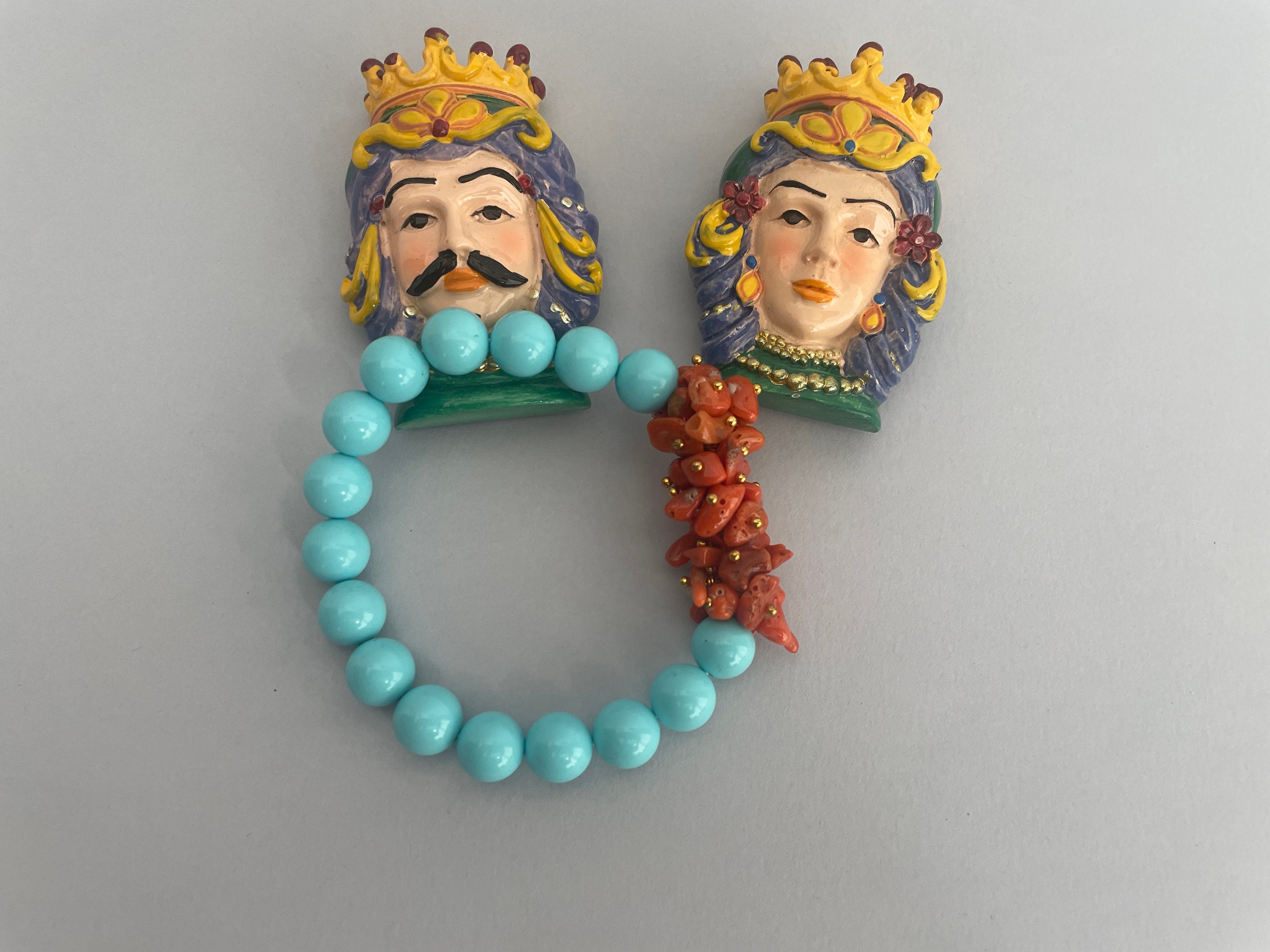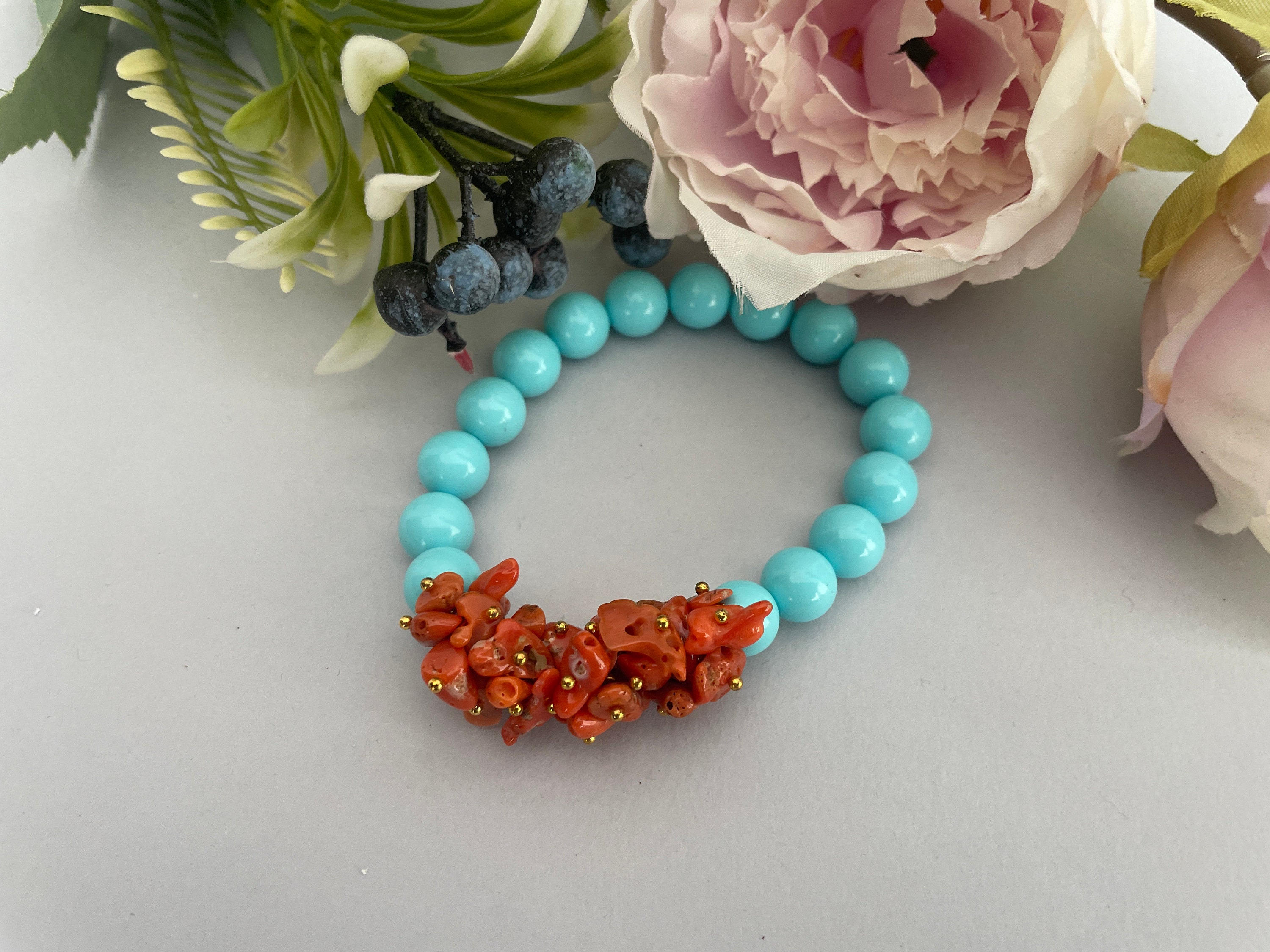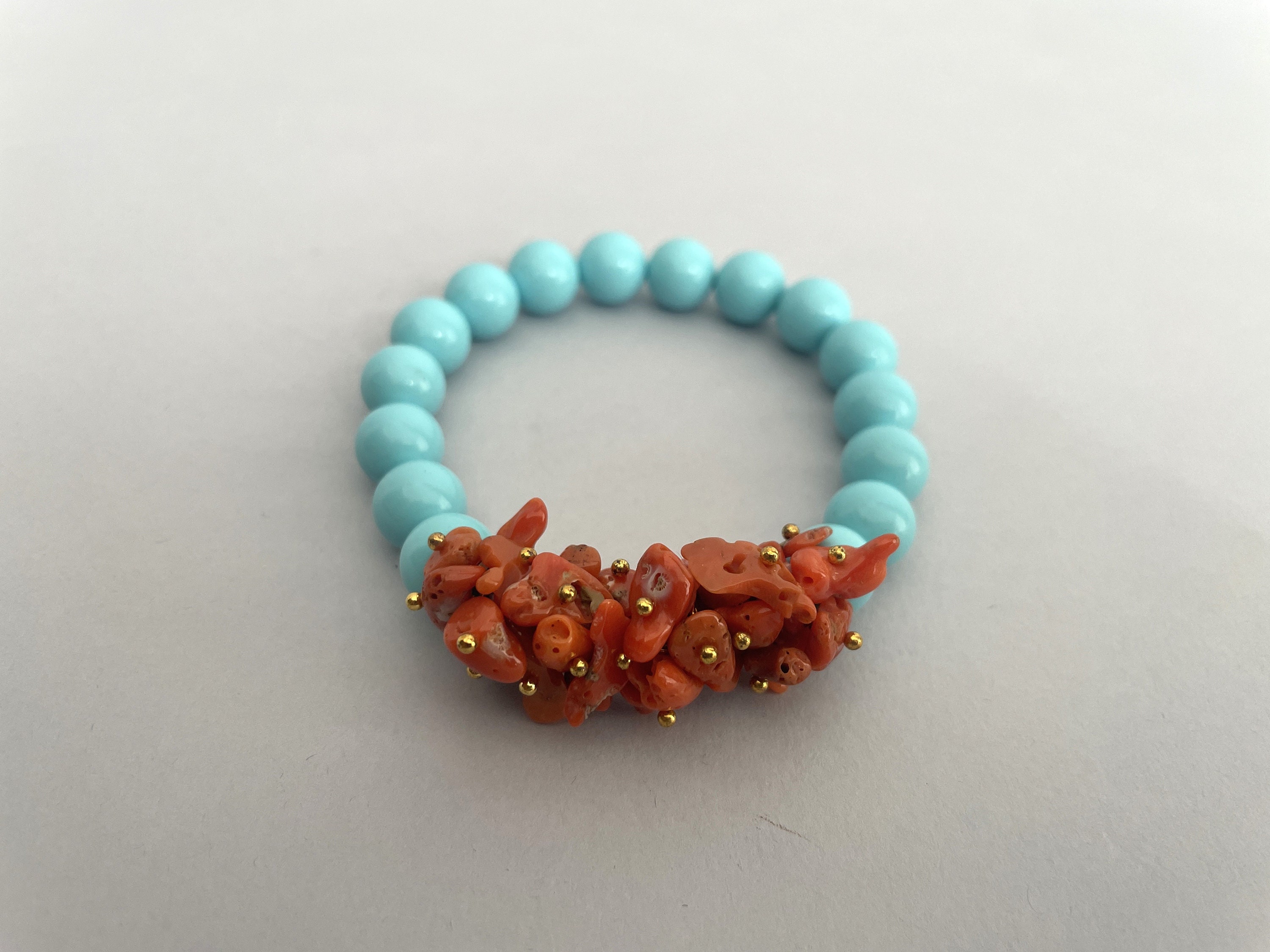 Bracciale elastico artigianale con perle di Pasta di Turchese e lungo grappolo di chips di Corallo autentico del Mediterraneo.