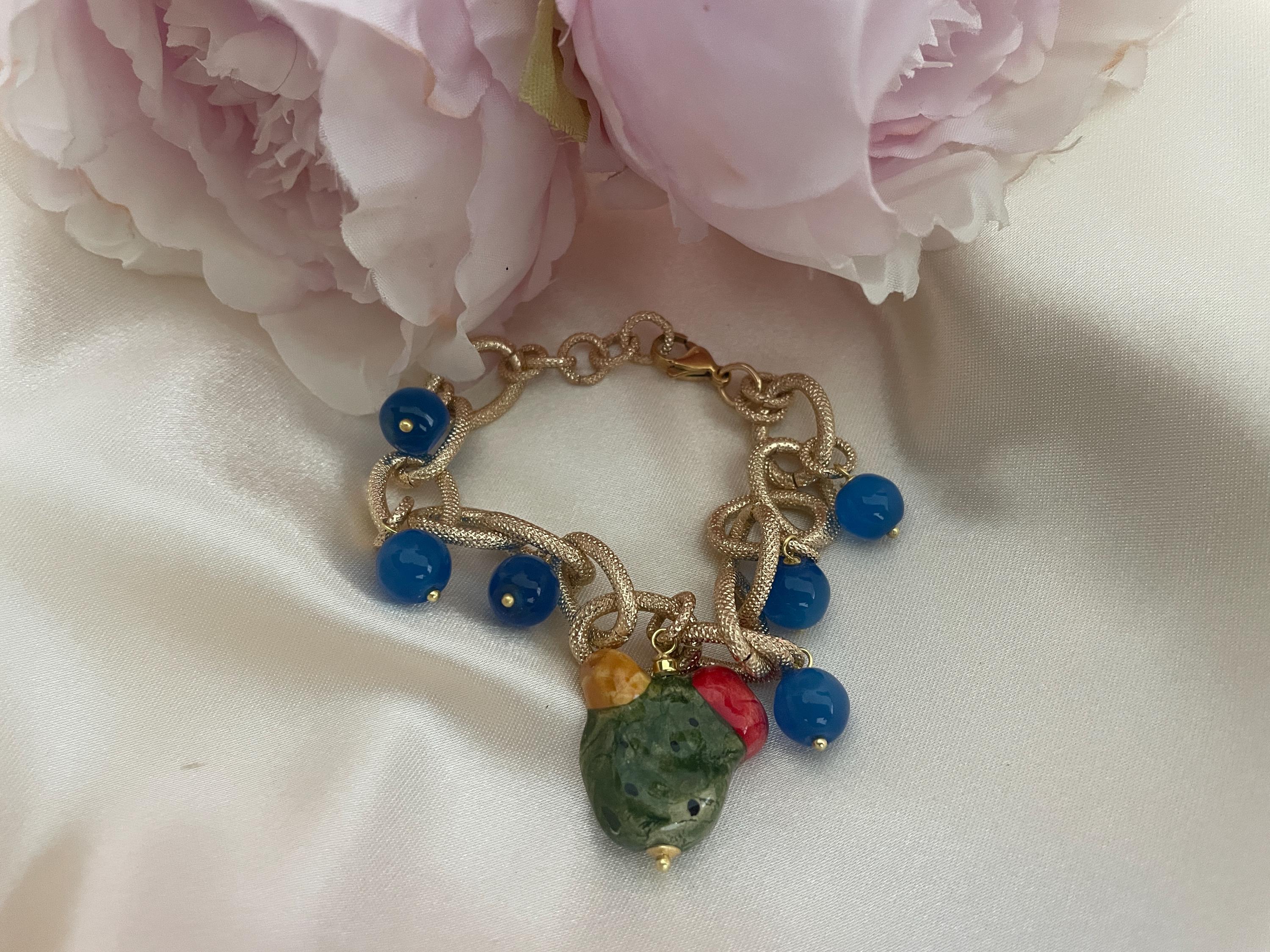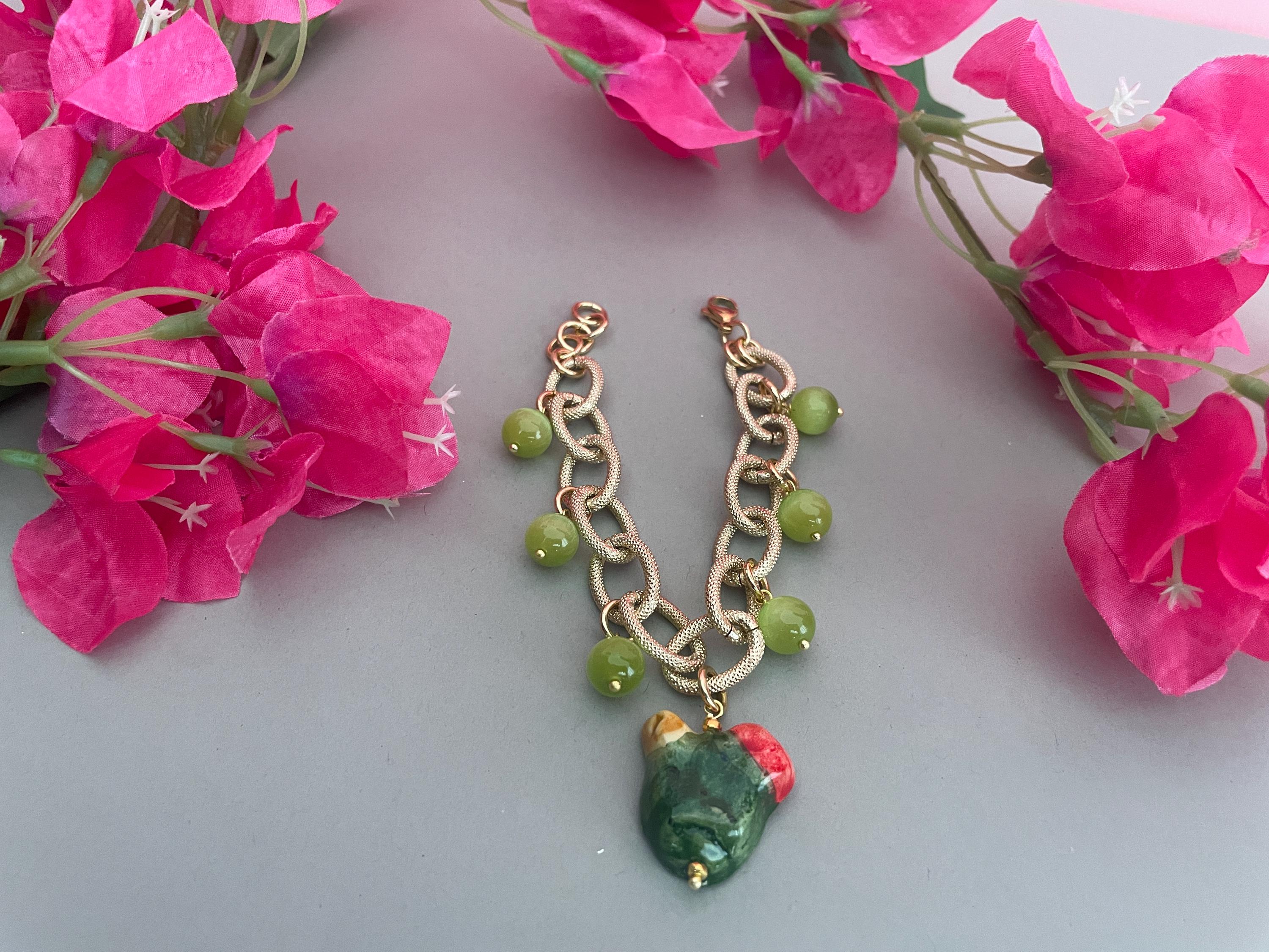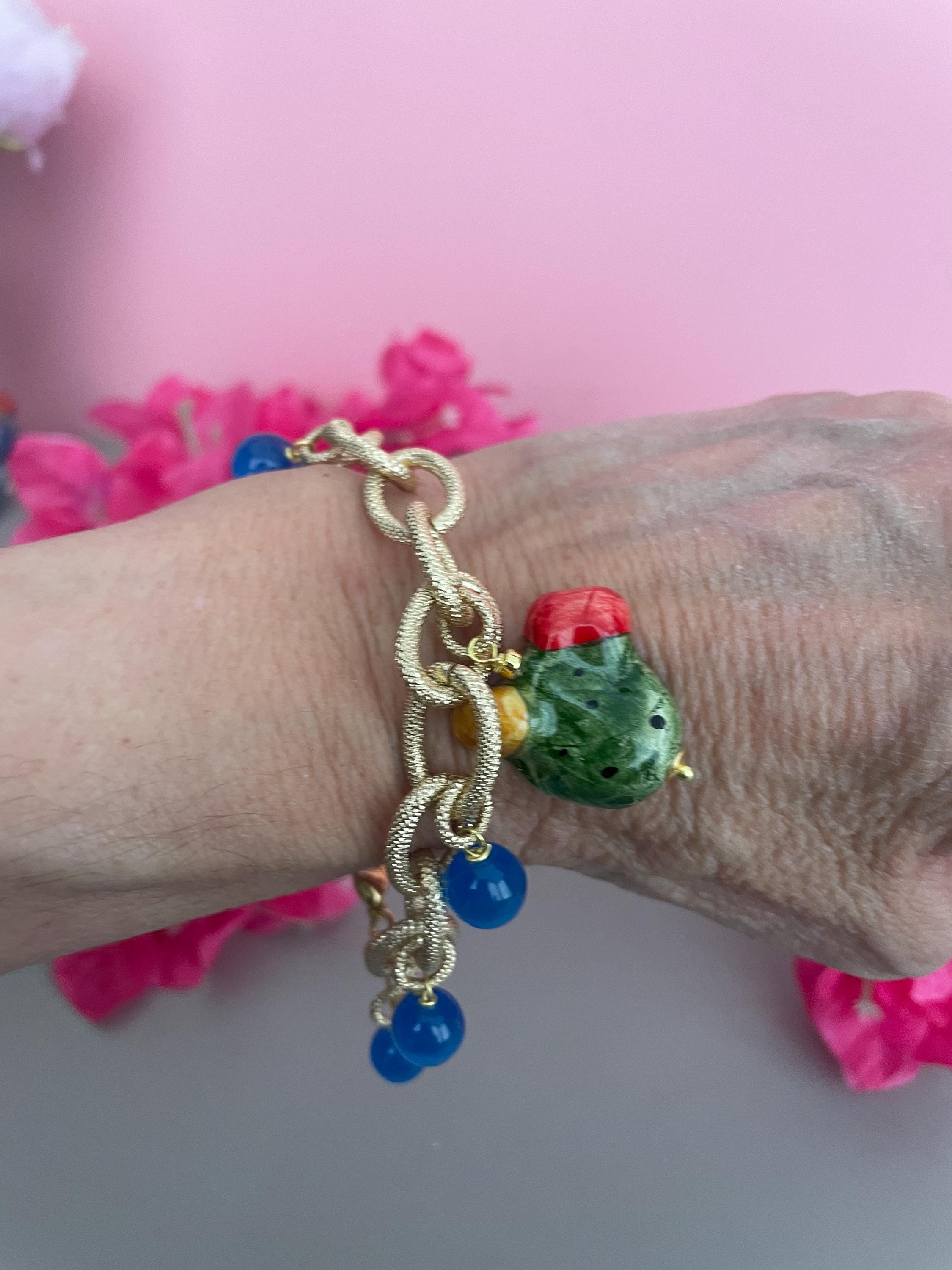 Bracciale dallo stile siciliano realizzato con una catena a maglie grandi ovali in alluminio anallergico satinato e dorato, con un Fico d’India di ceramica di Caltagirone pendente e con 6 perle pendenti dalle maglie.