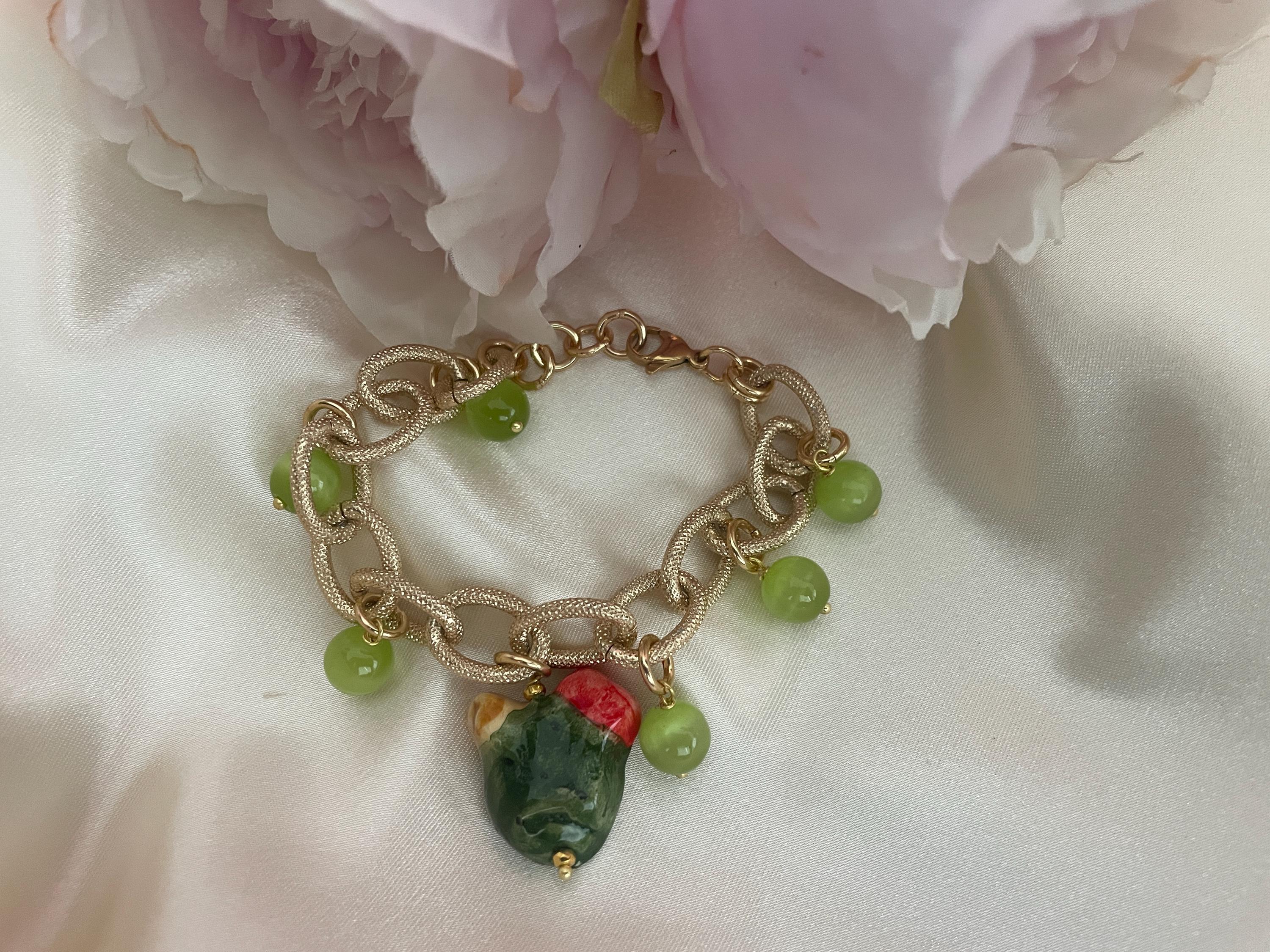 Questo bracciale è disponibile in due varianti: una con perle verdi di Occhio di Gatto e una con perle di Agata blu.