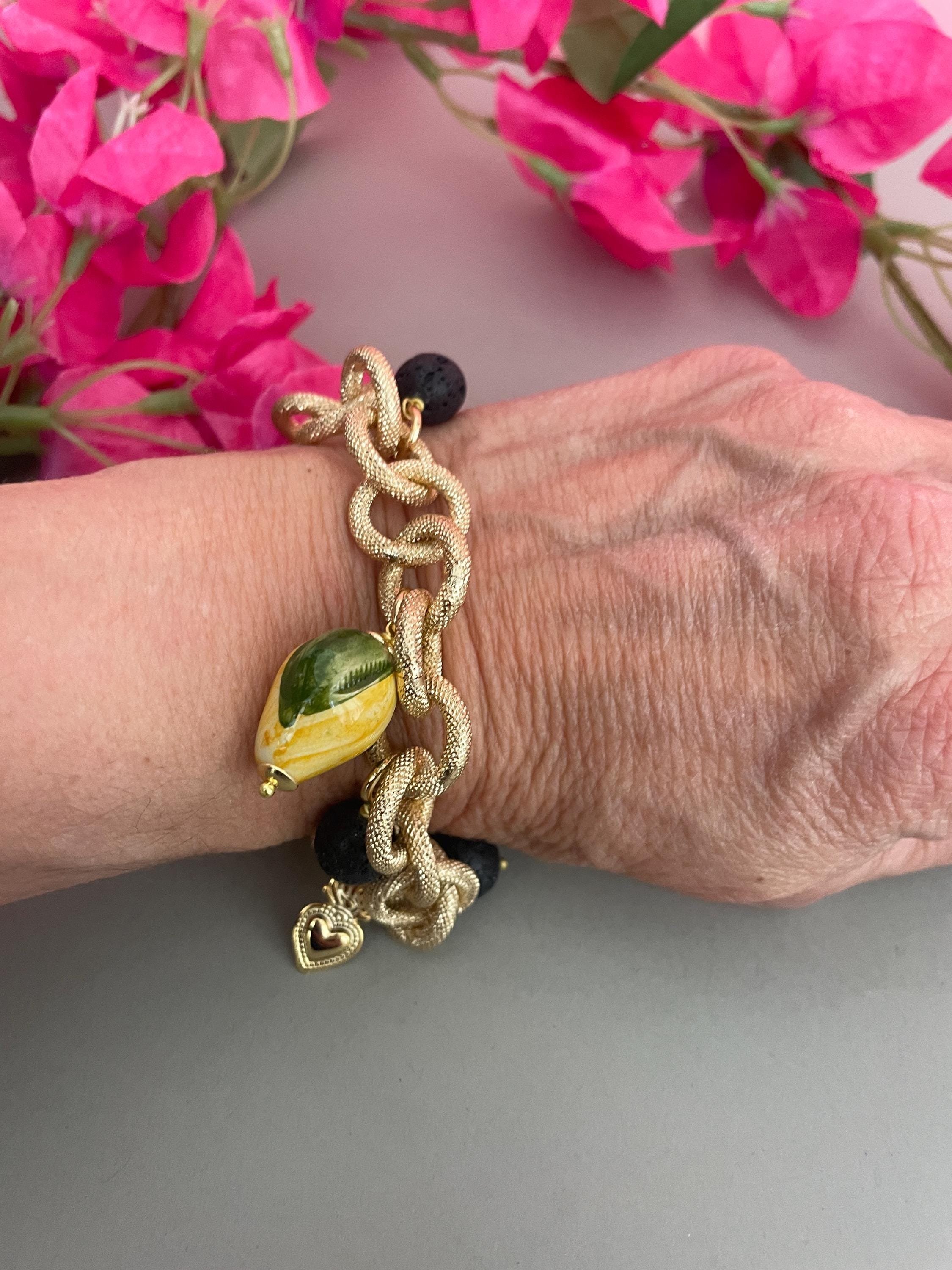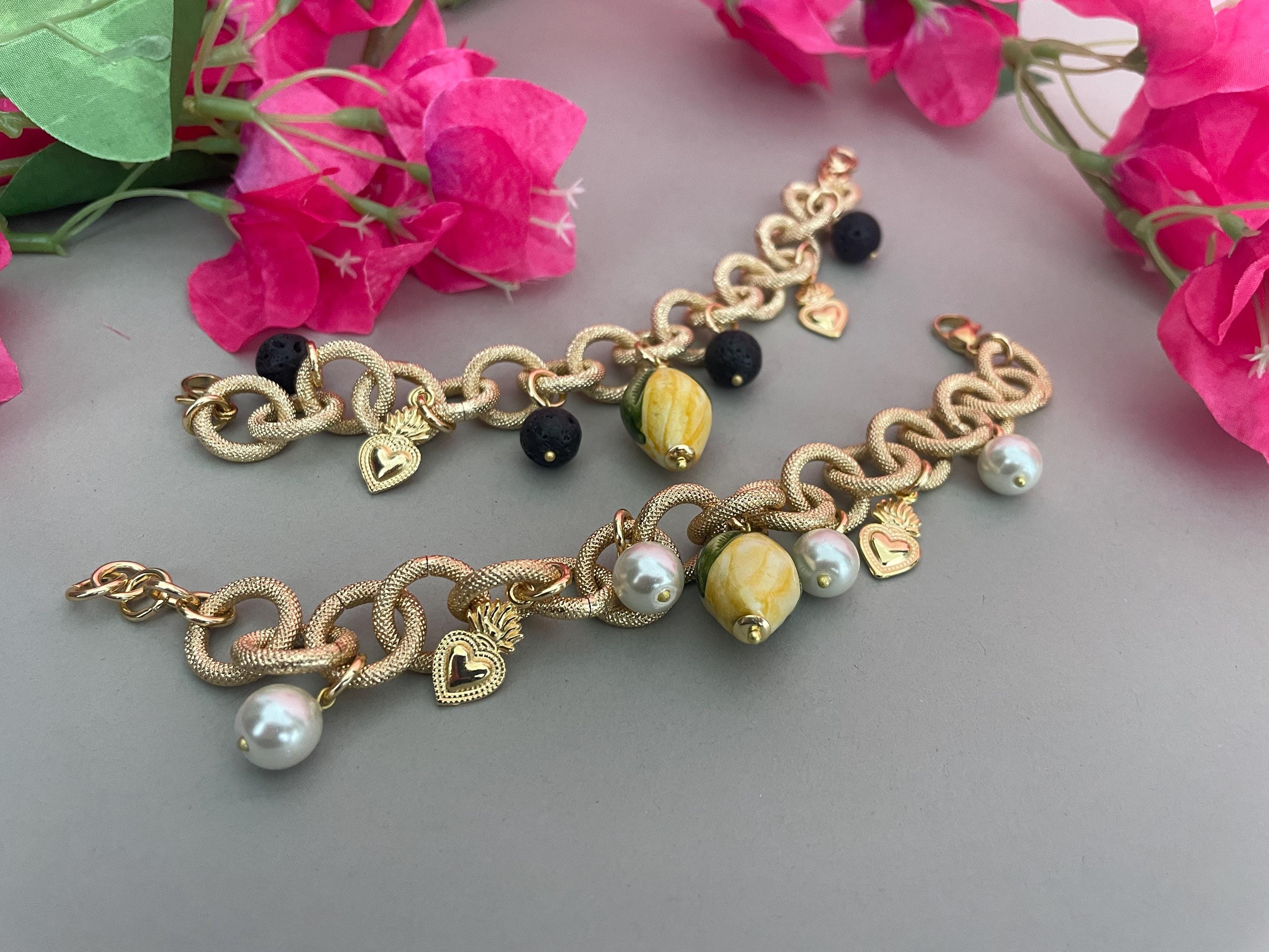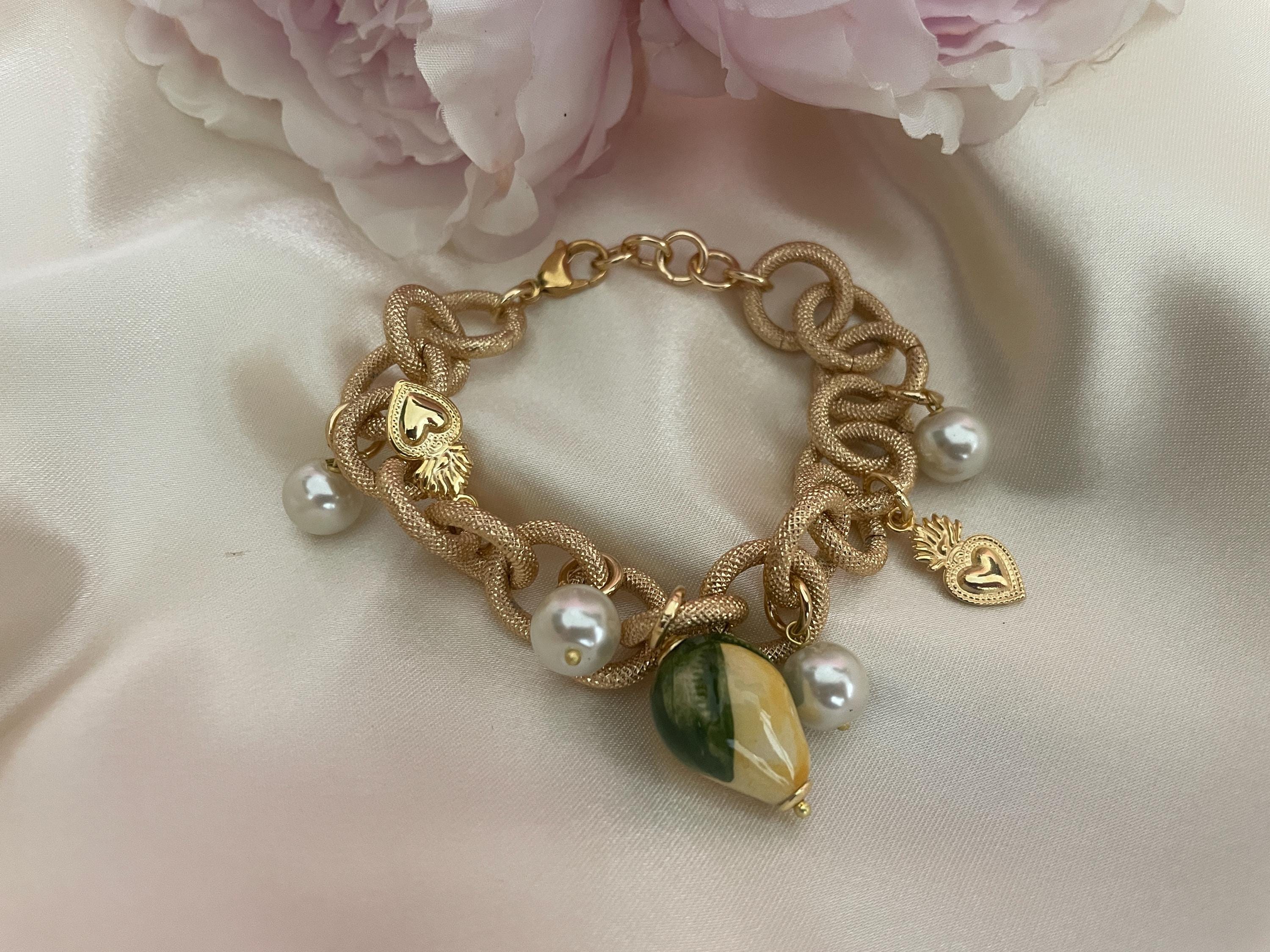 Bracciale dallo stile siciliano realizzato con una catena a maglie molto grandi tonde in alluminio anallergico satinato e dorato, con un Limone di ceramica di Caltagirone pendente e con 4 perle pendenti dalle maglie alternate a piccoli Cuori sacri di ottone dorato.