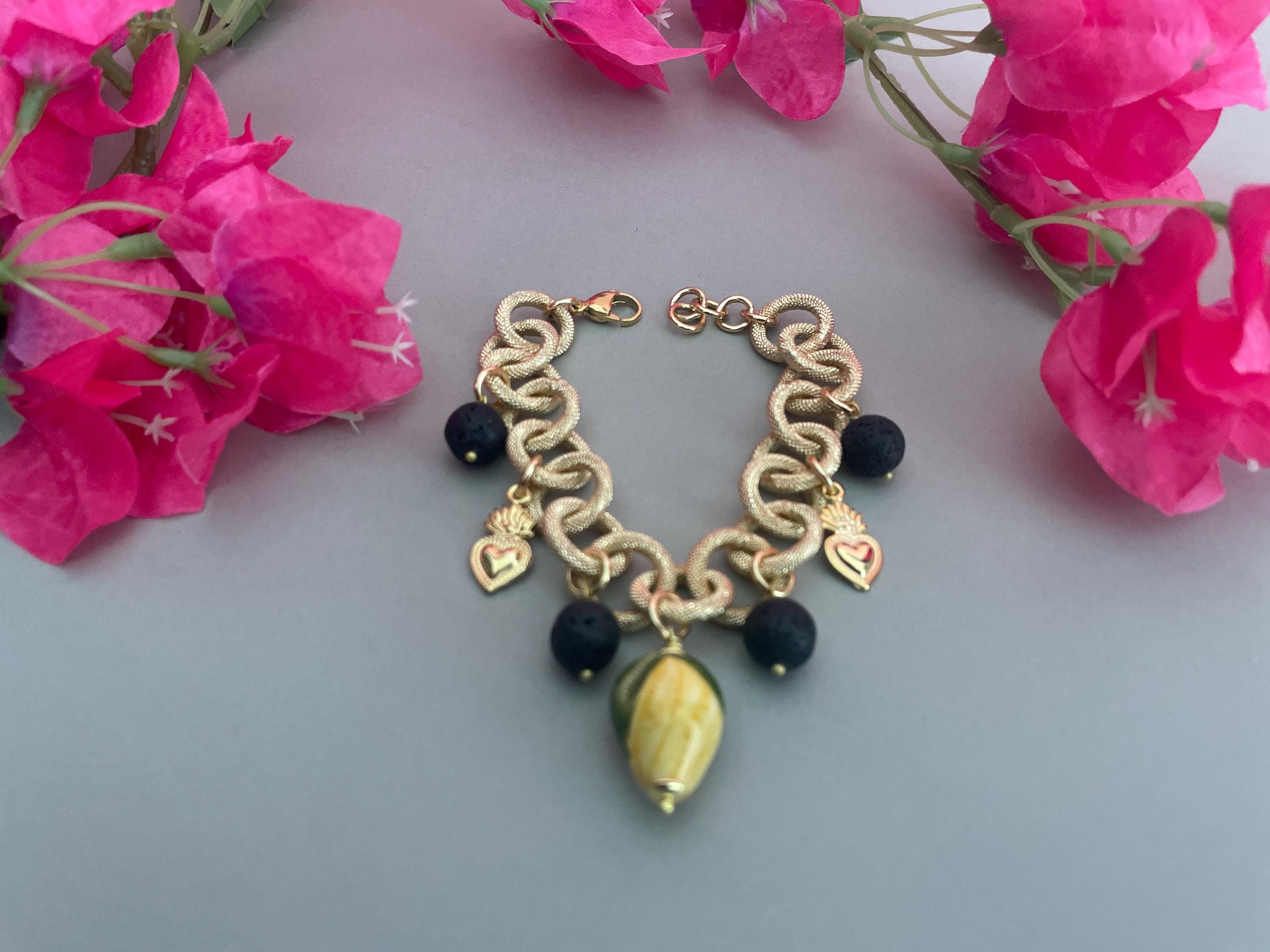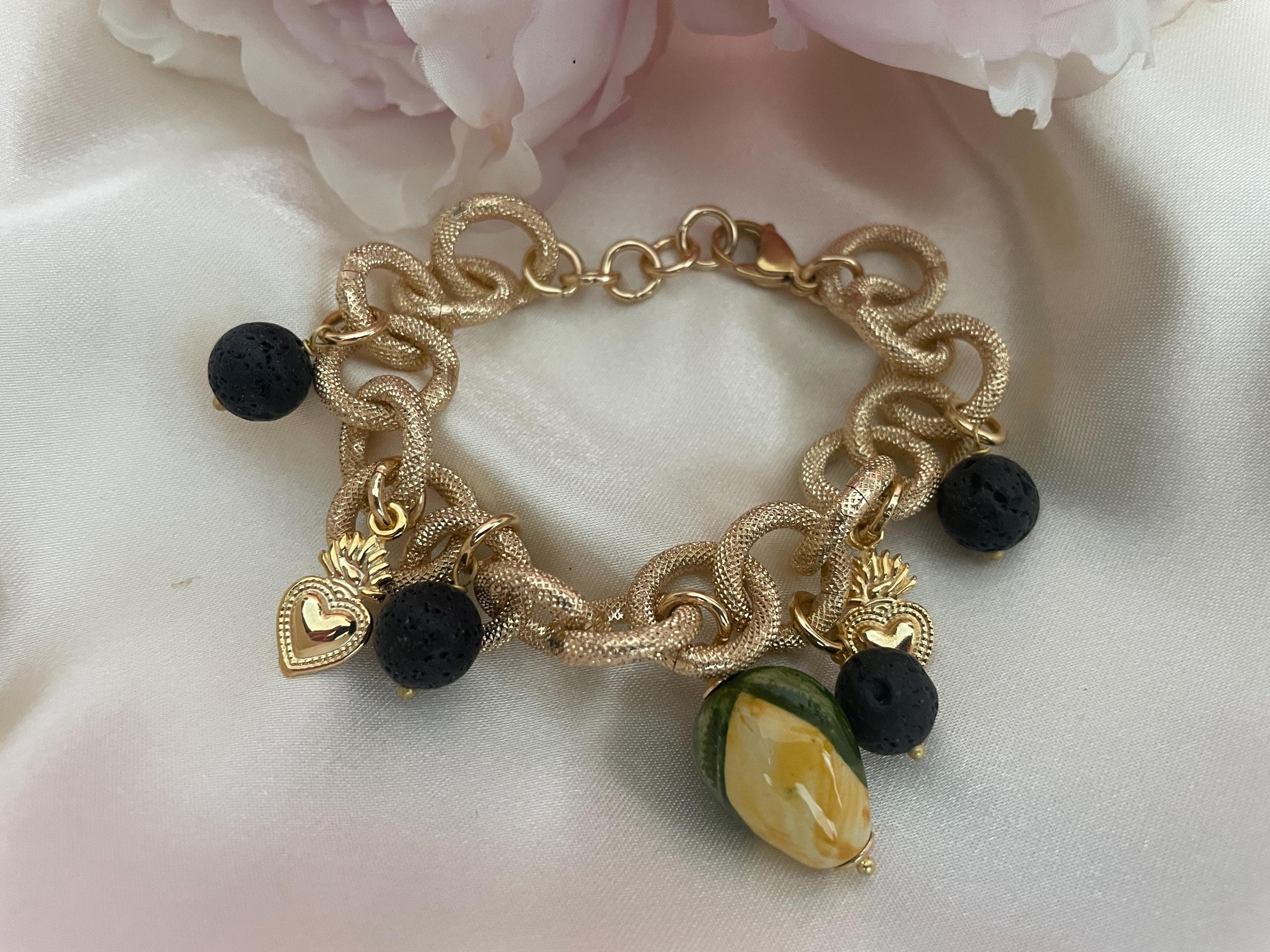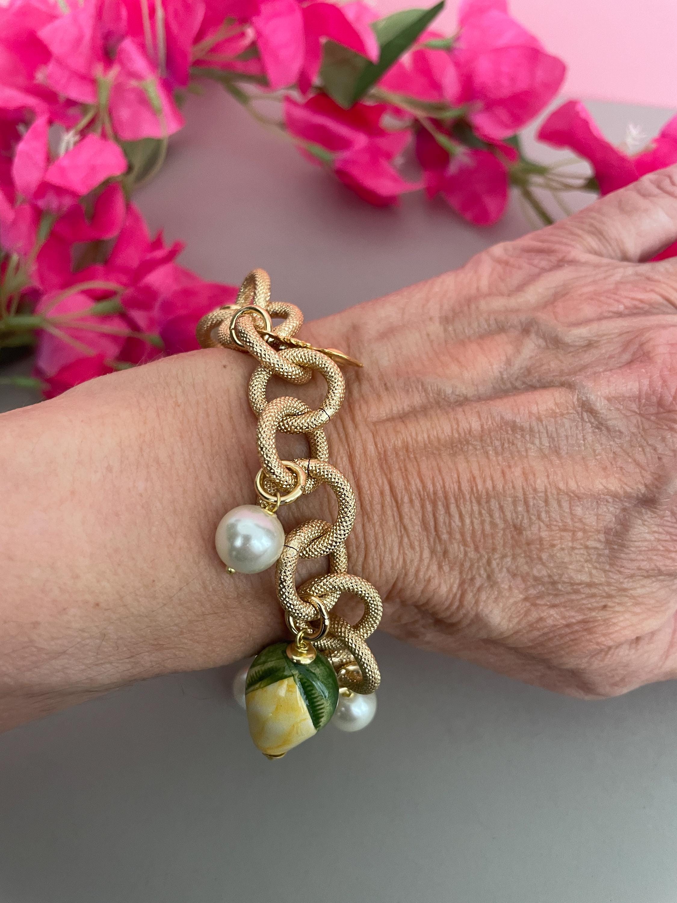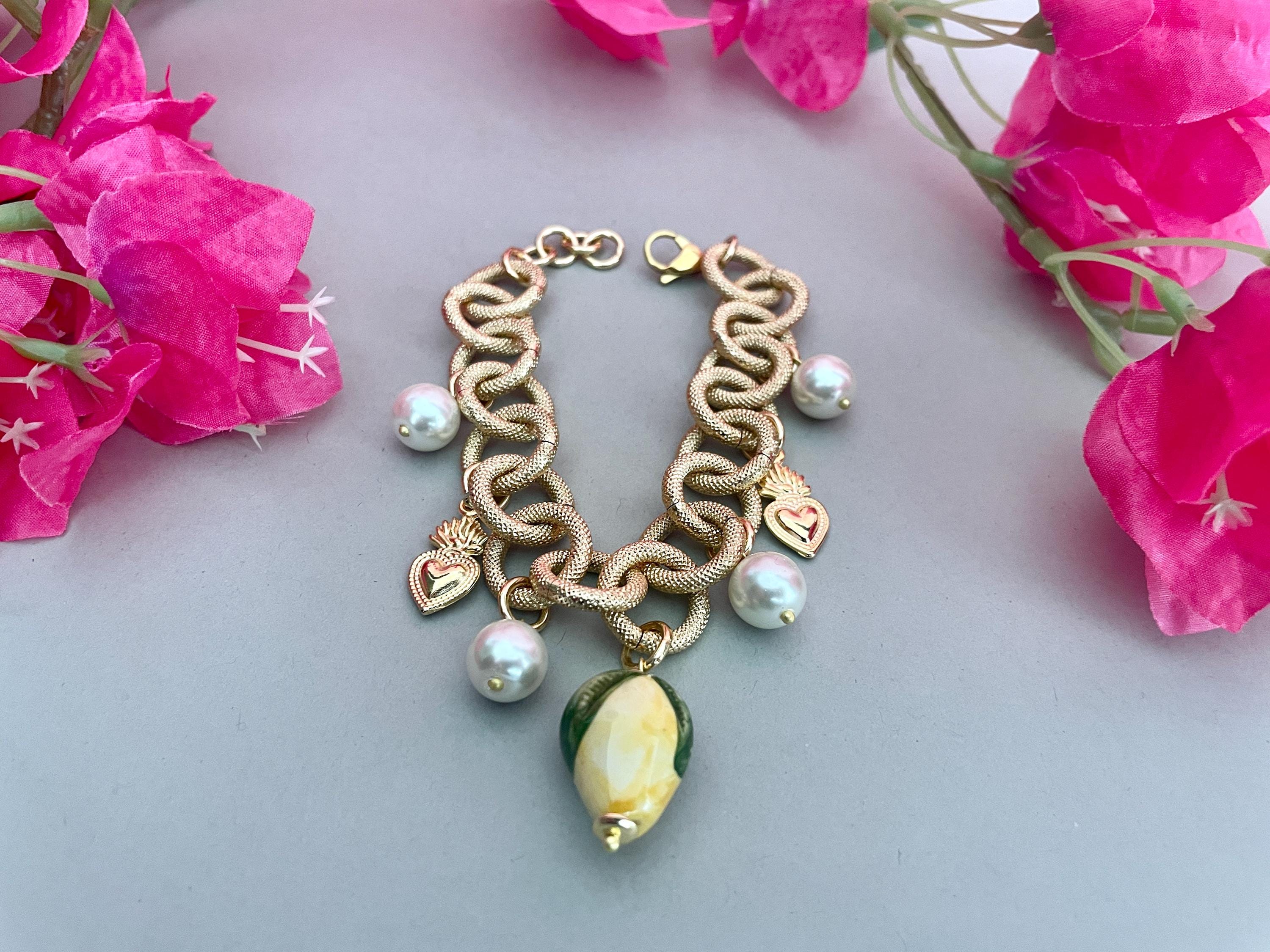 Bracciale dallo stile siciliano realizzato con una catena a maglie molto grandi tonde in alluminio anallergico satinato e dorato, con un Limone di ceramica di Caltagirone pendente e con 4 perle pendenti dalle maglie alternate a piccoli Cuori sacri di ottone dorato.