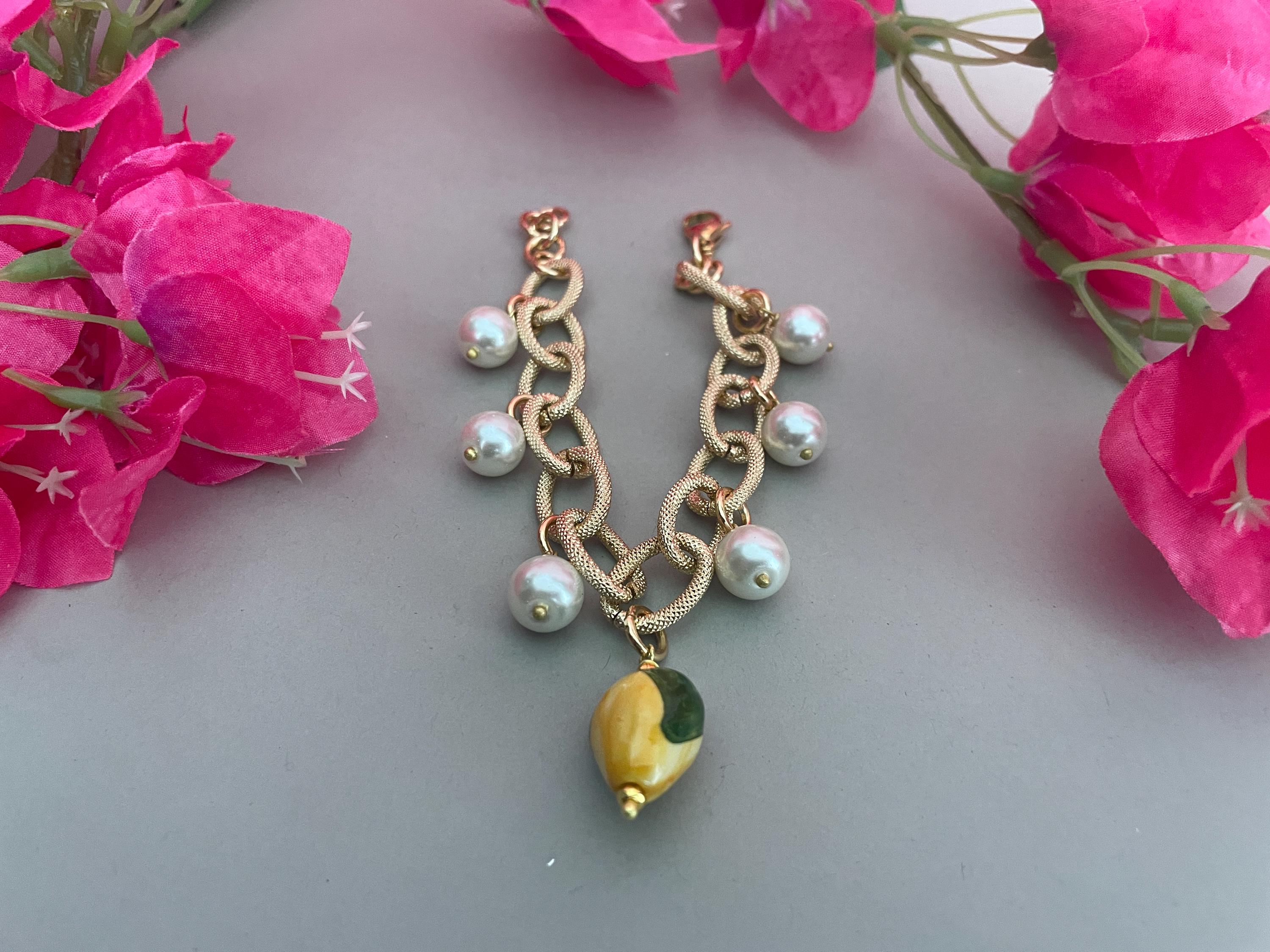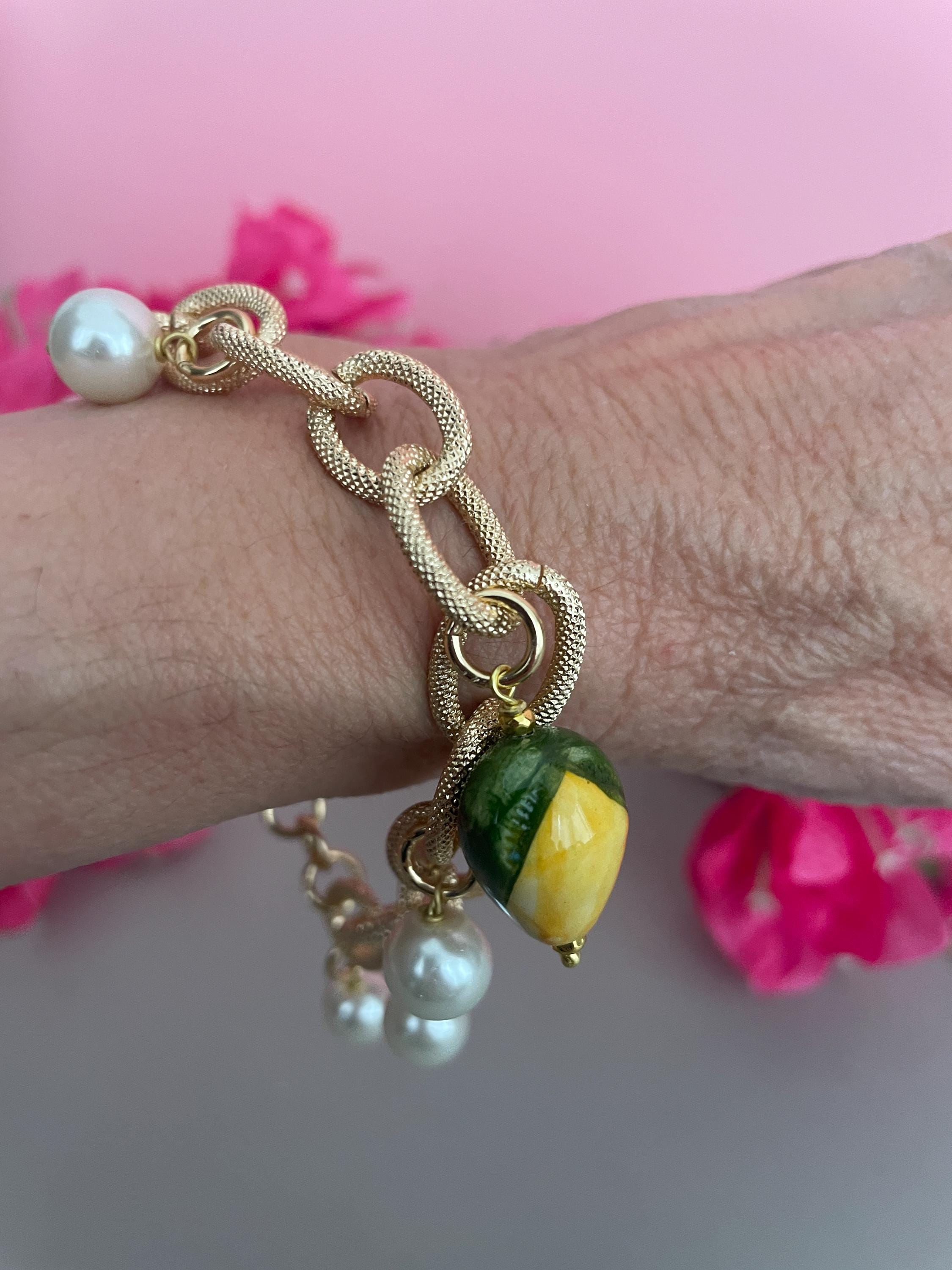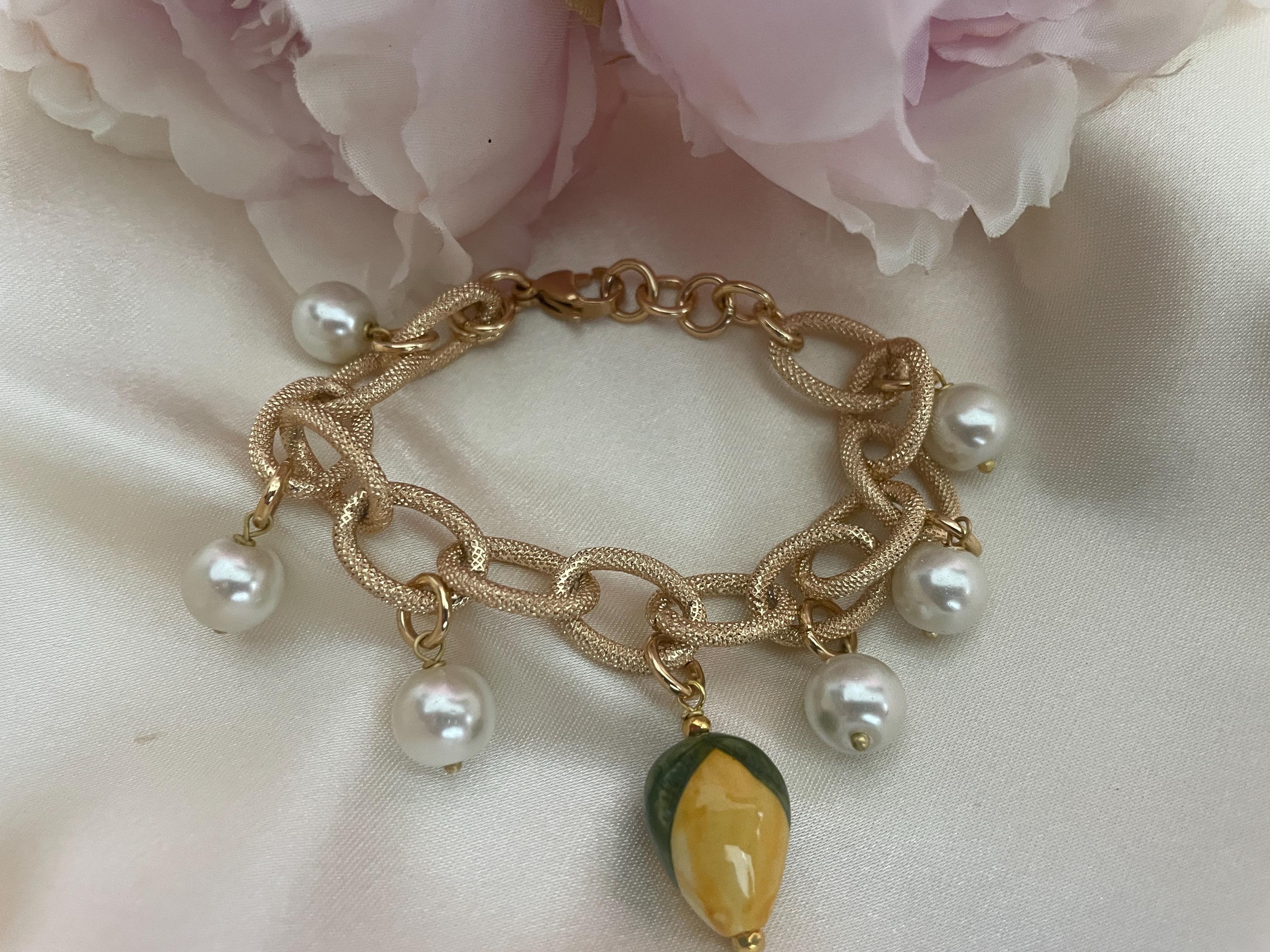 Bracciale dallo stile siciliano realizzato con una catena a maglie grandi ovali in alluminio anallergico satinato e dorato, con un Limone di ceramica di Caltagirone pendente e con 6 perle pendenti dalle maglie.