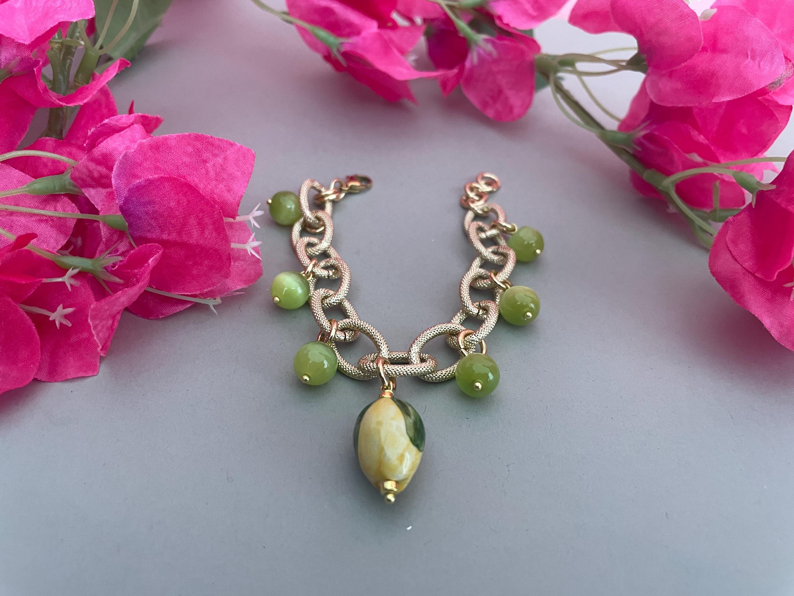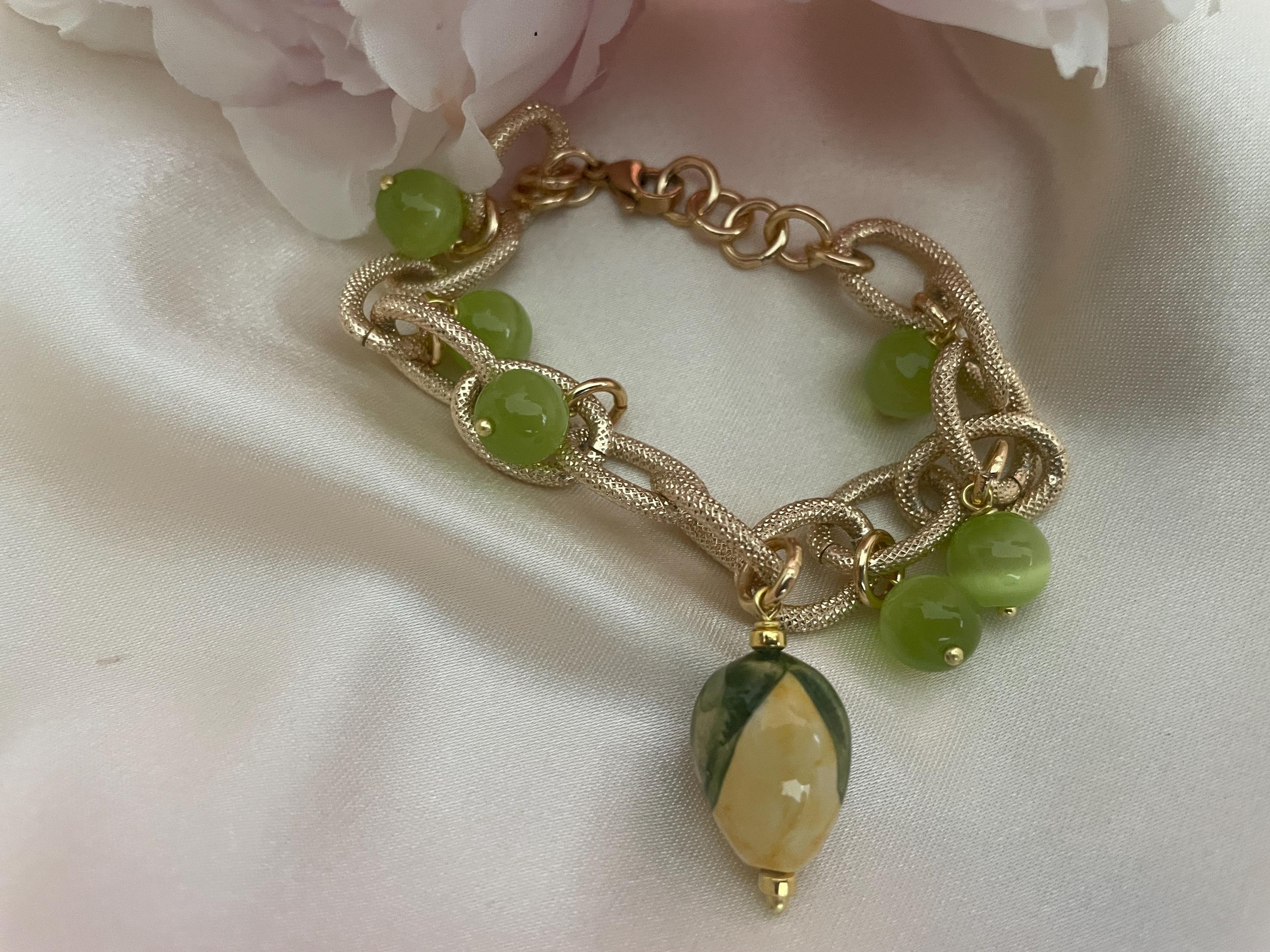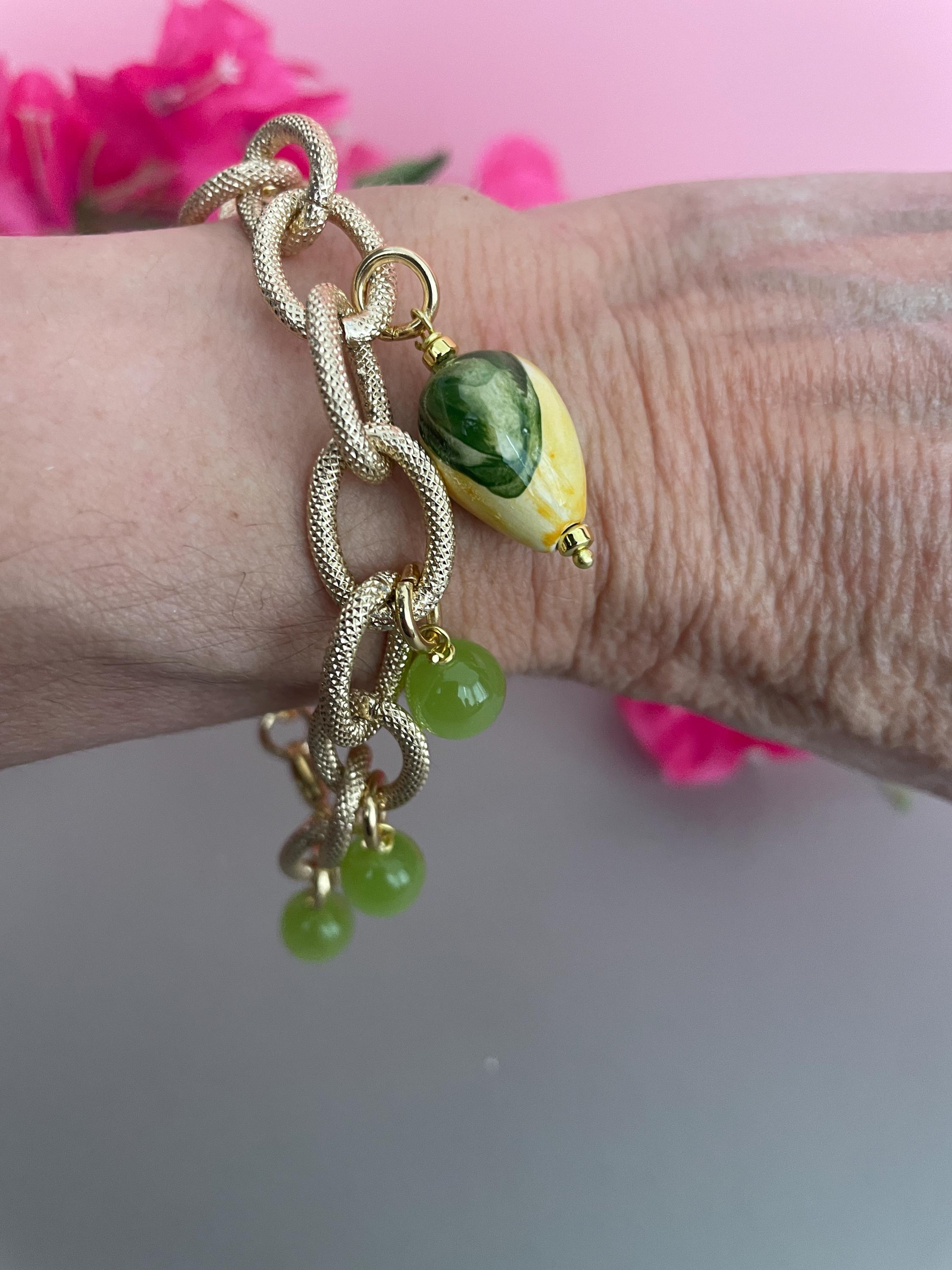 Bracciale dallo stile siciliano realizzato con una catena a maglie grandi ovali in alluminio anallergico satinato e dorato, con un Limone di ceramica di Caltagirone pendente e con 6 perle pendenti dalle maglie.