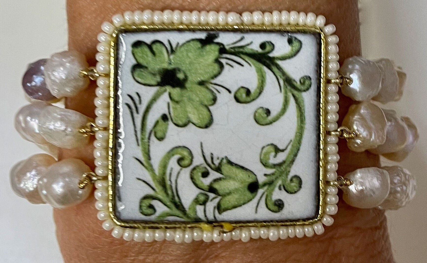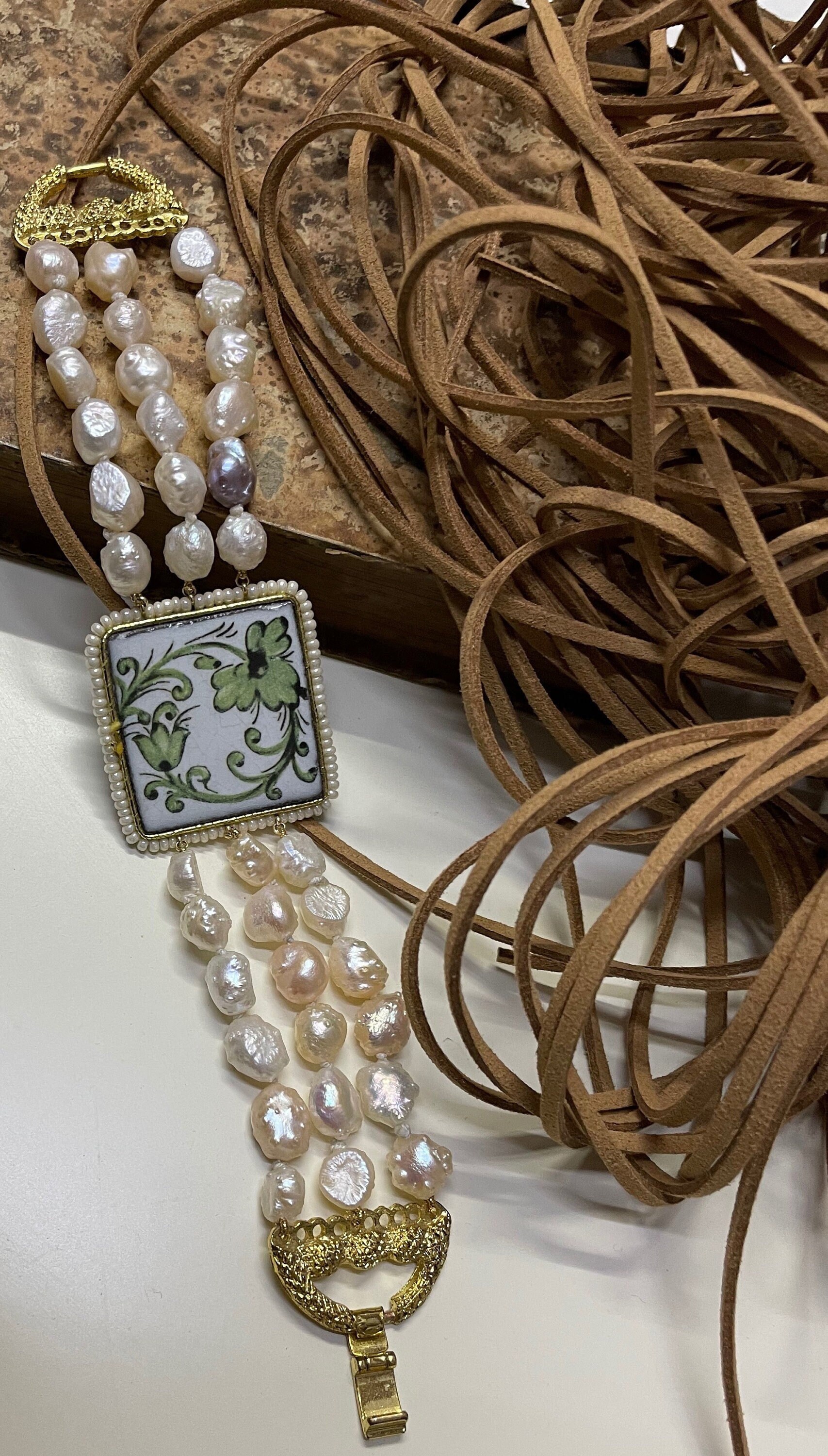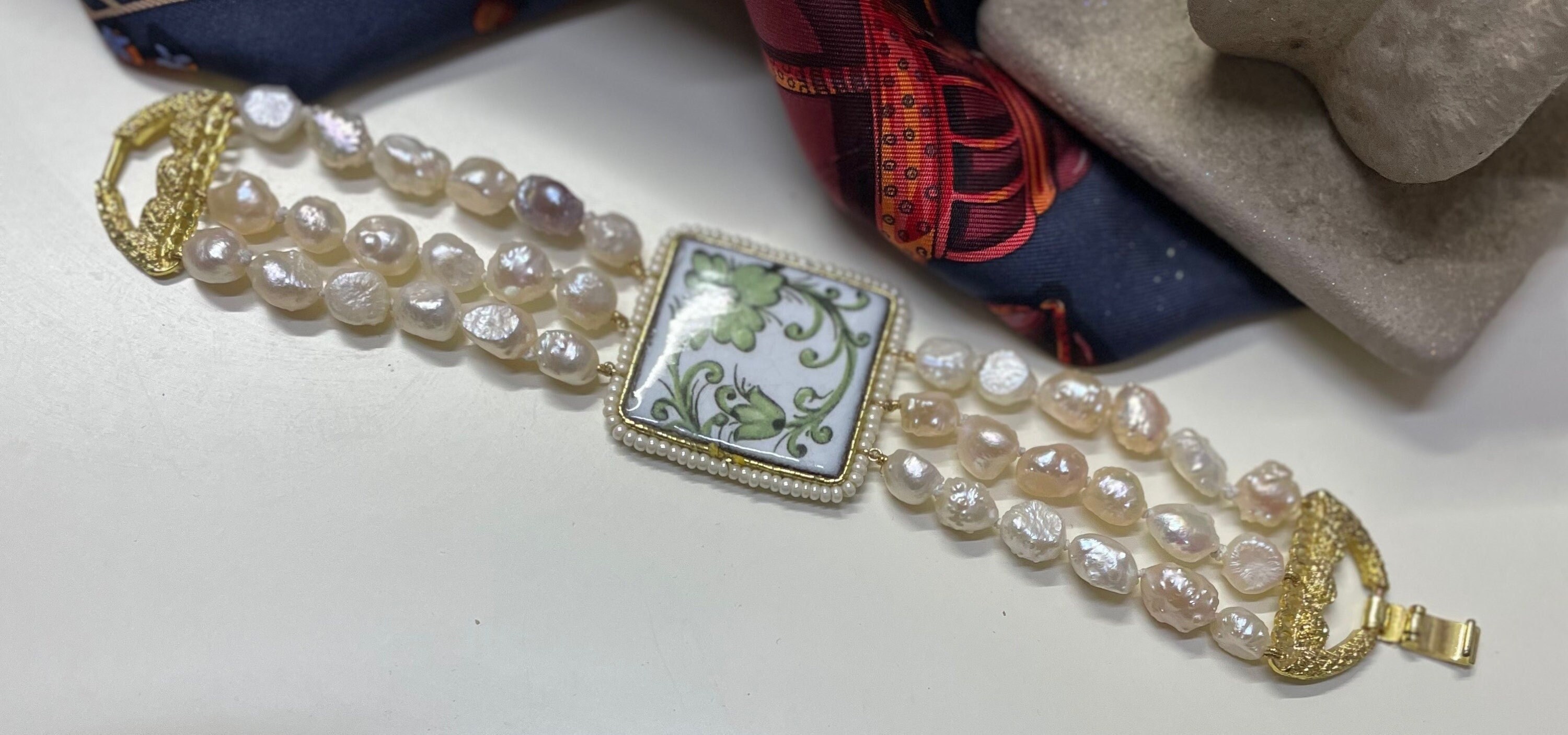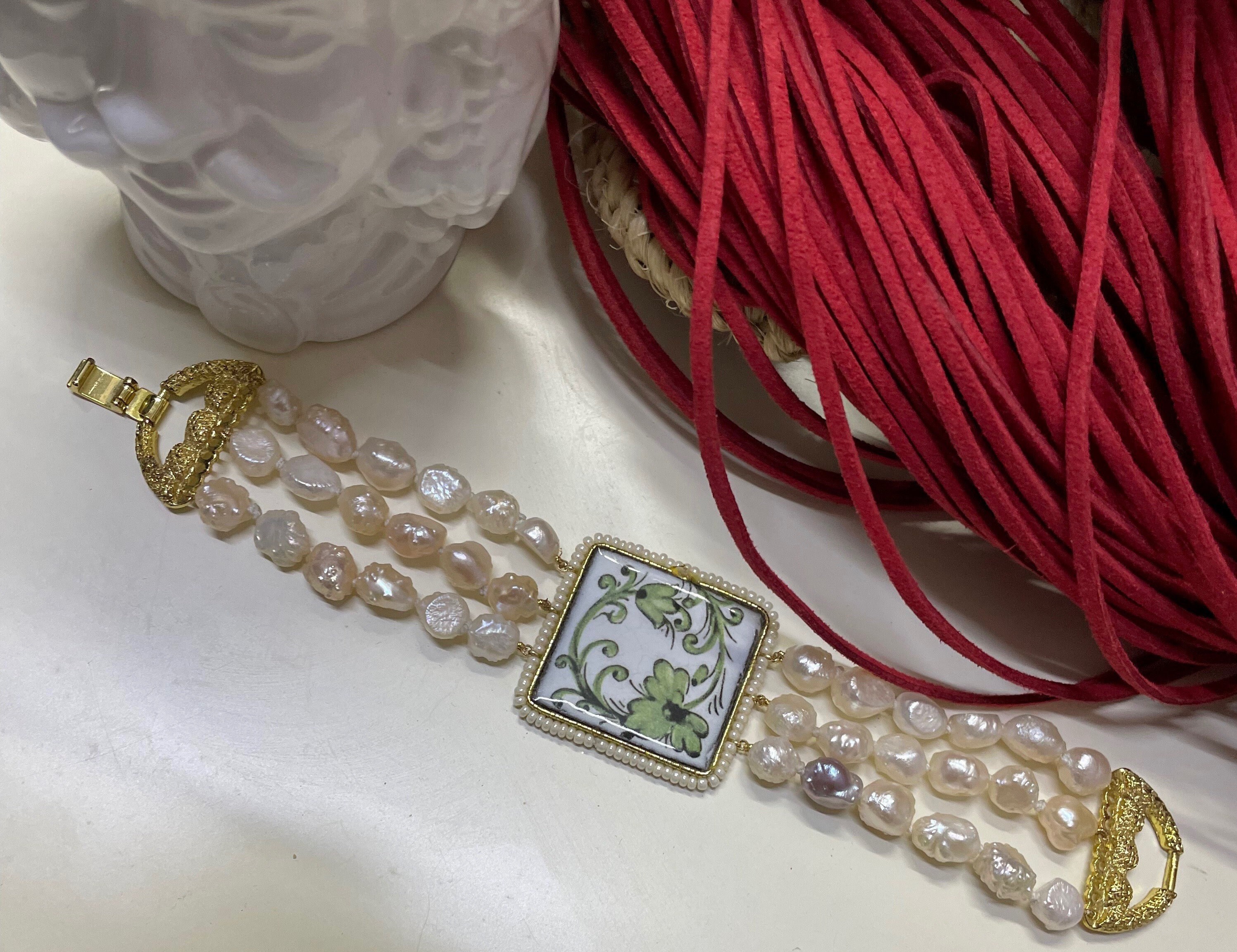 Realizzato con tre fili perle naturali, singolarmente annodate, e mattonella di ceramica di Caltagirone, stampata in superficie, incorniciata da microperle di fiume.