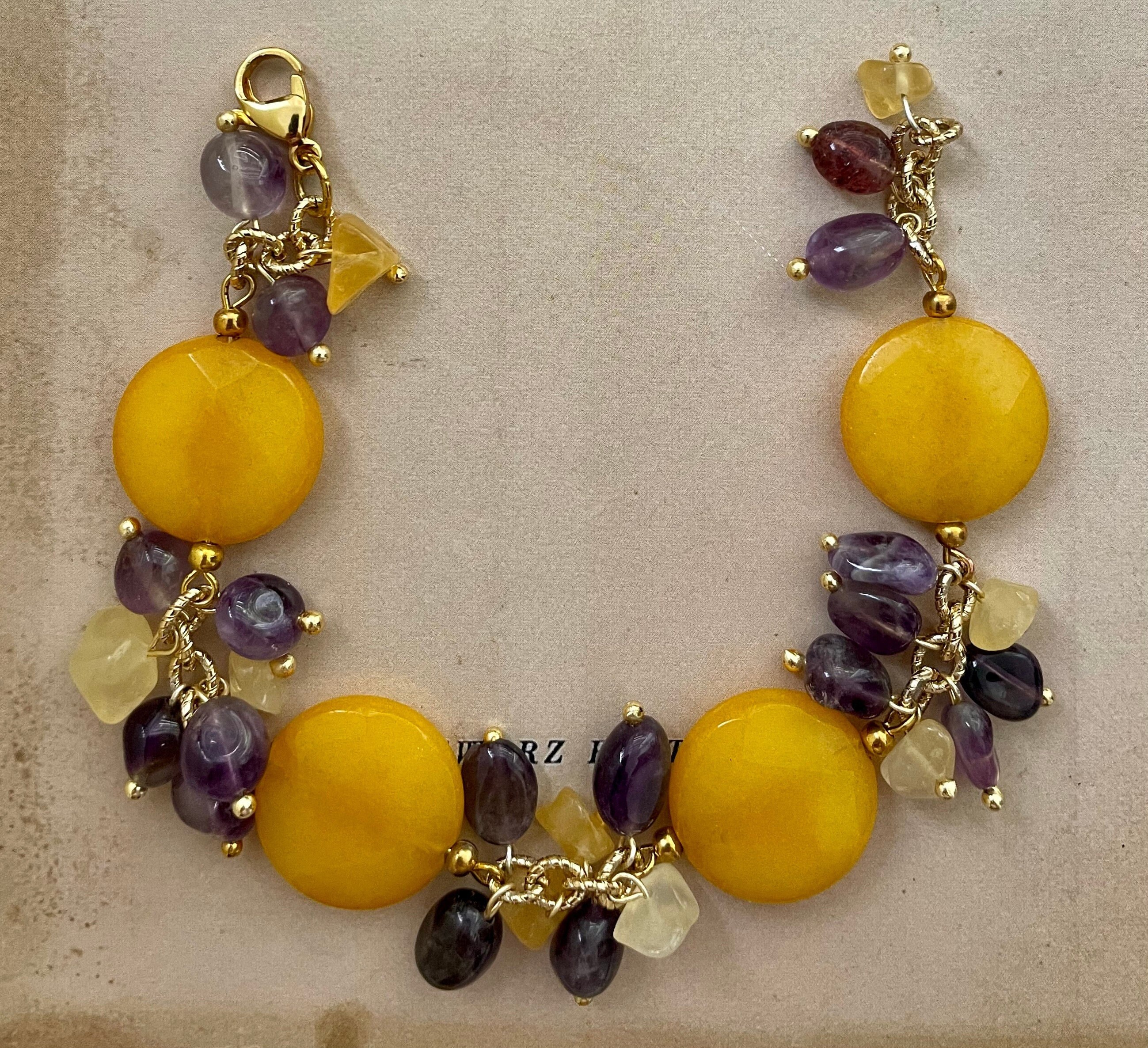 Braccialetto a grappolo pietre dure, agata gialla, ametista, tormalina gialla, composizione di pietre, sposa