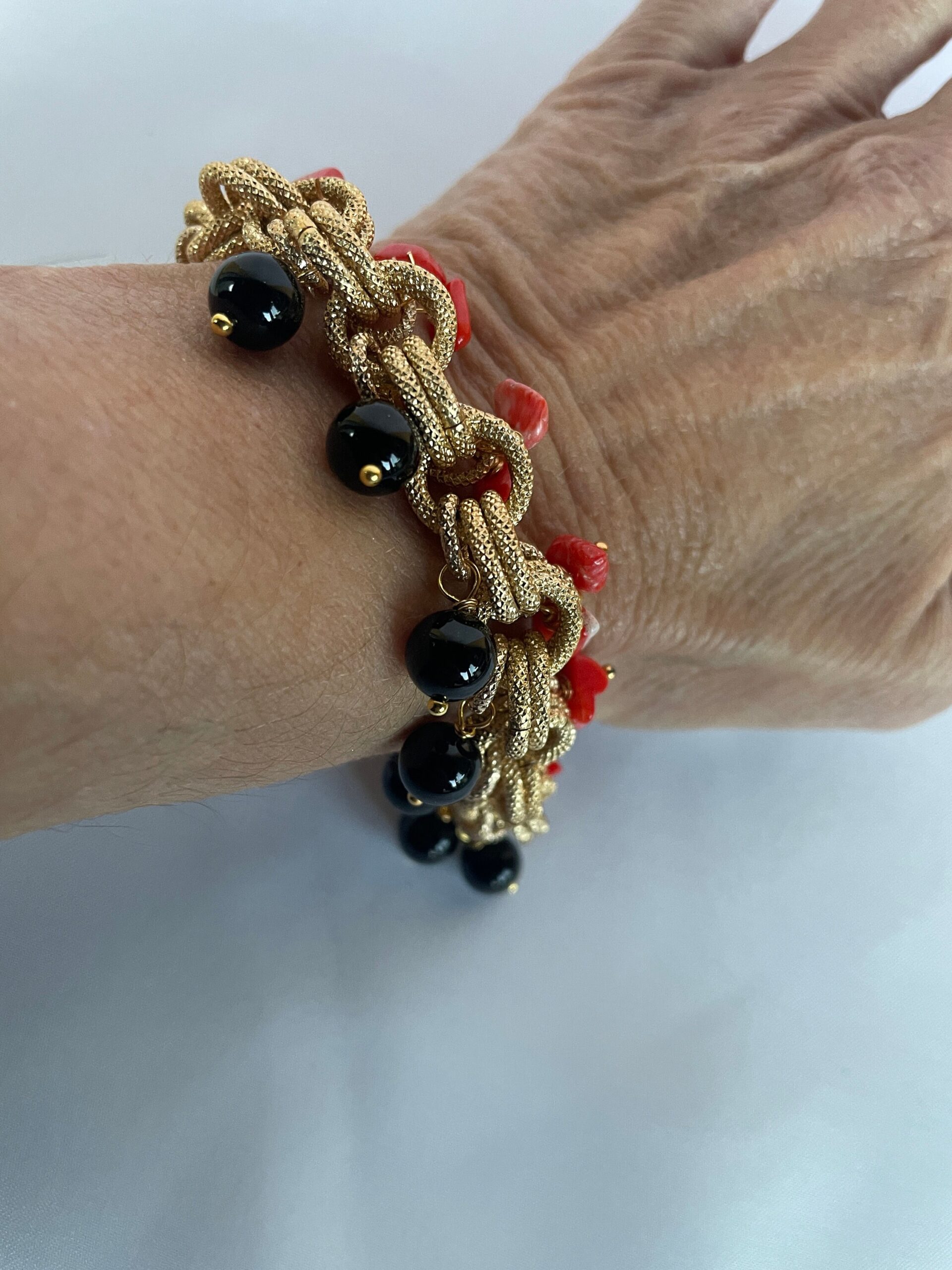 Realizzato con una catena doppia in alluminio anallergico dorato e perle di onice miste a chips di Corallo bambù rosso chiaro.
