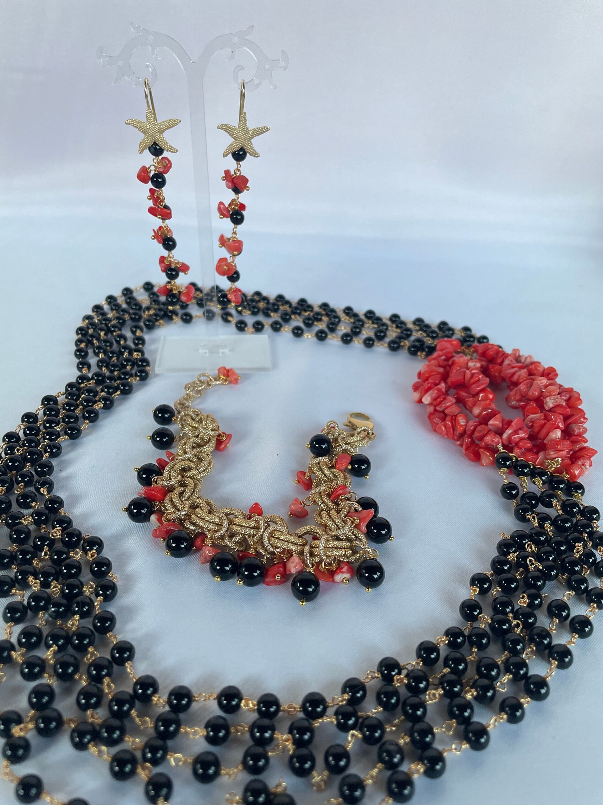Propongo l’abbinamento con una collana e orecchini visibili in foto e acquistabili fra le opzioni d’acquisto.