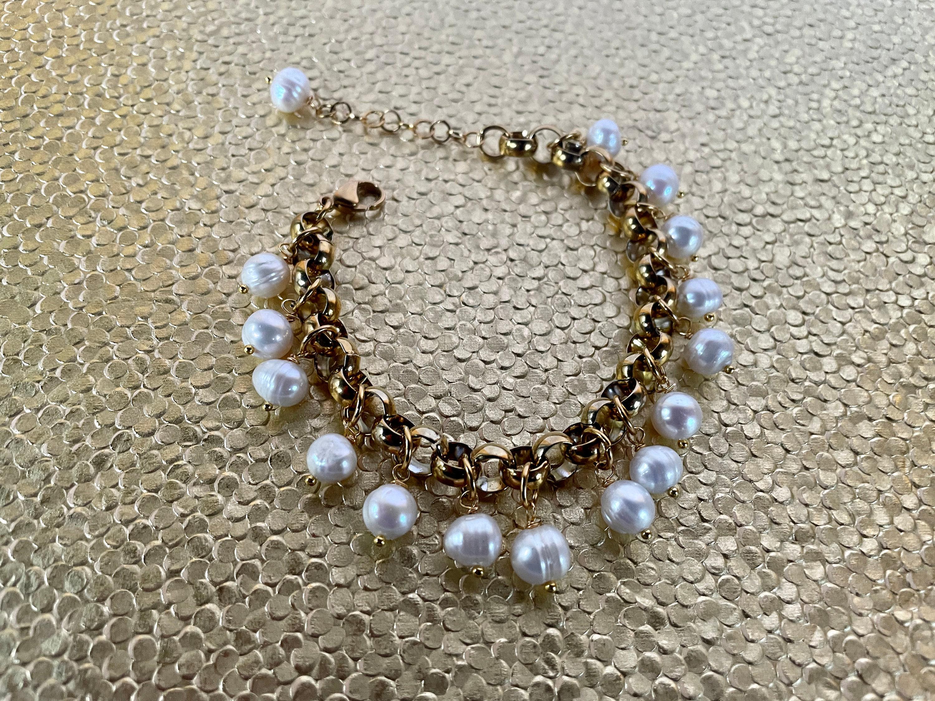 Sedici grandi ciondoli realizzati con perle naturali di fiume sono agganciati alla catena rendendo questo bracciale un gioiello unico e speciale.