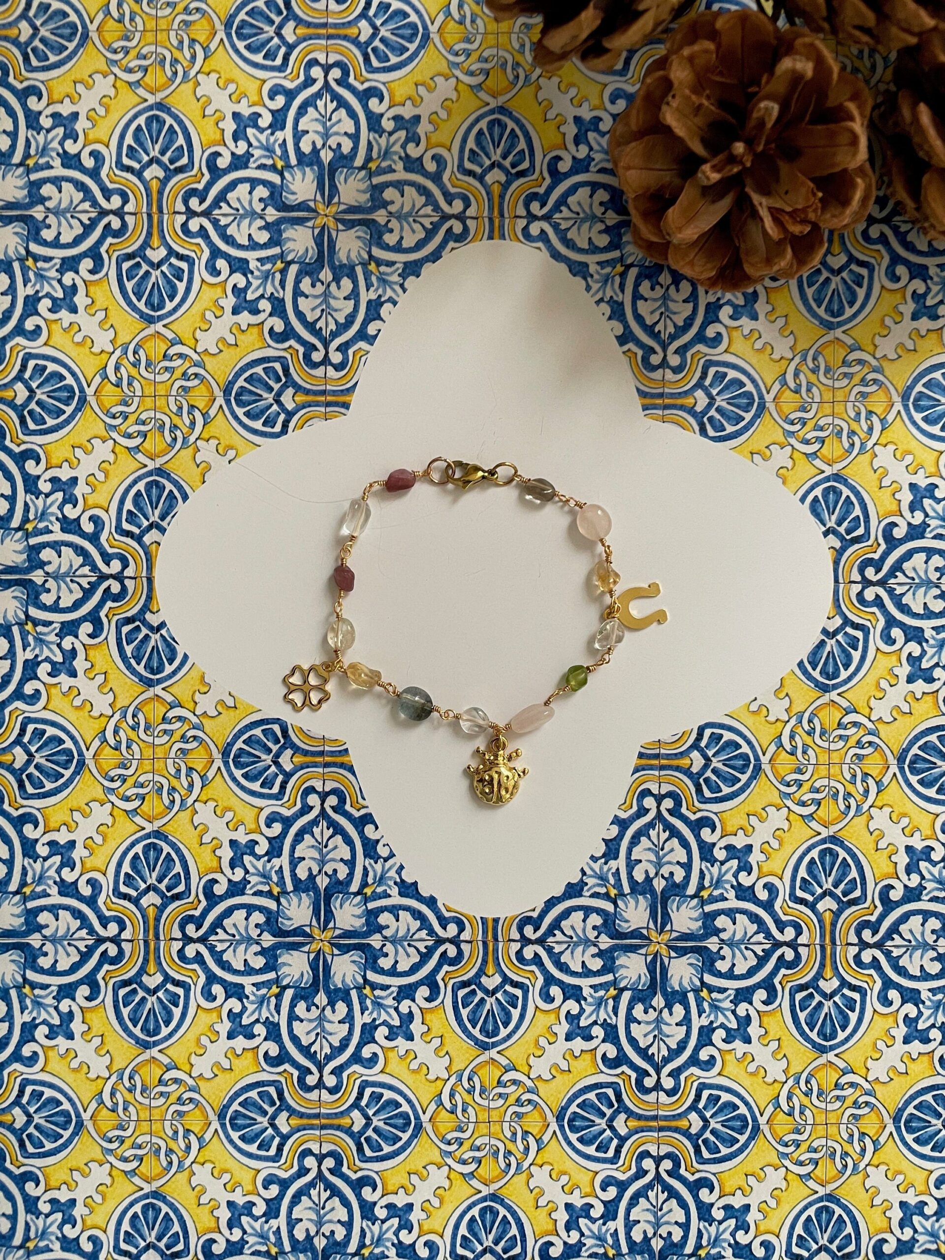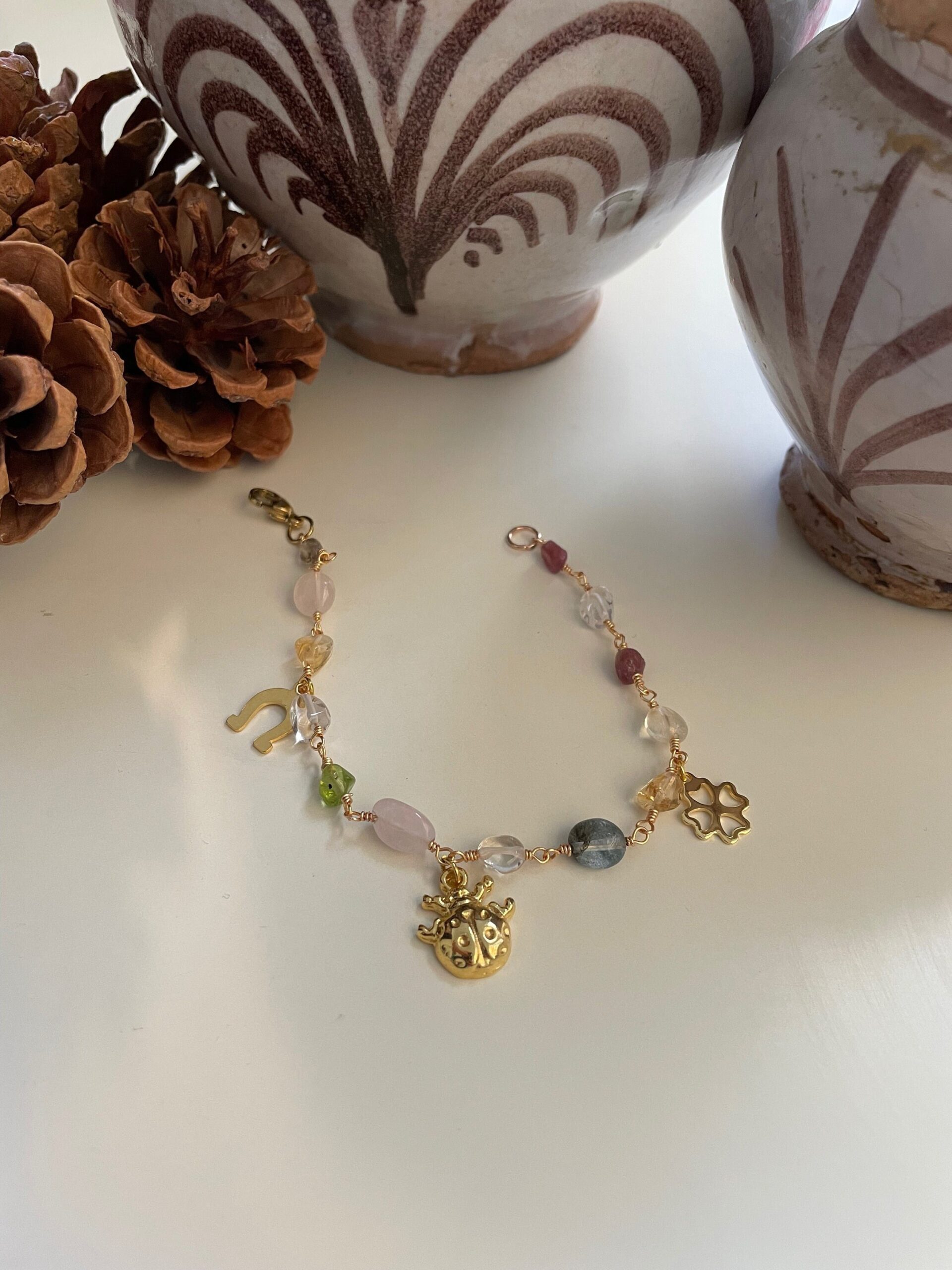 Completano il tutto tre ciondoli in acciaio dorato, simboli della fortuna: la coccinella, il ferro di cavallo e il quadrifoglio.