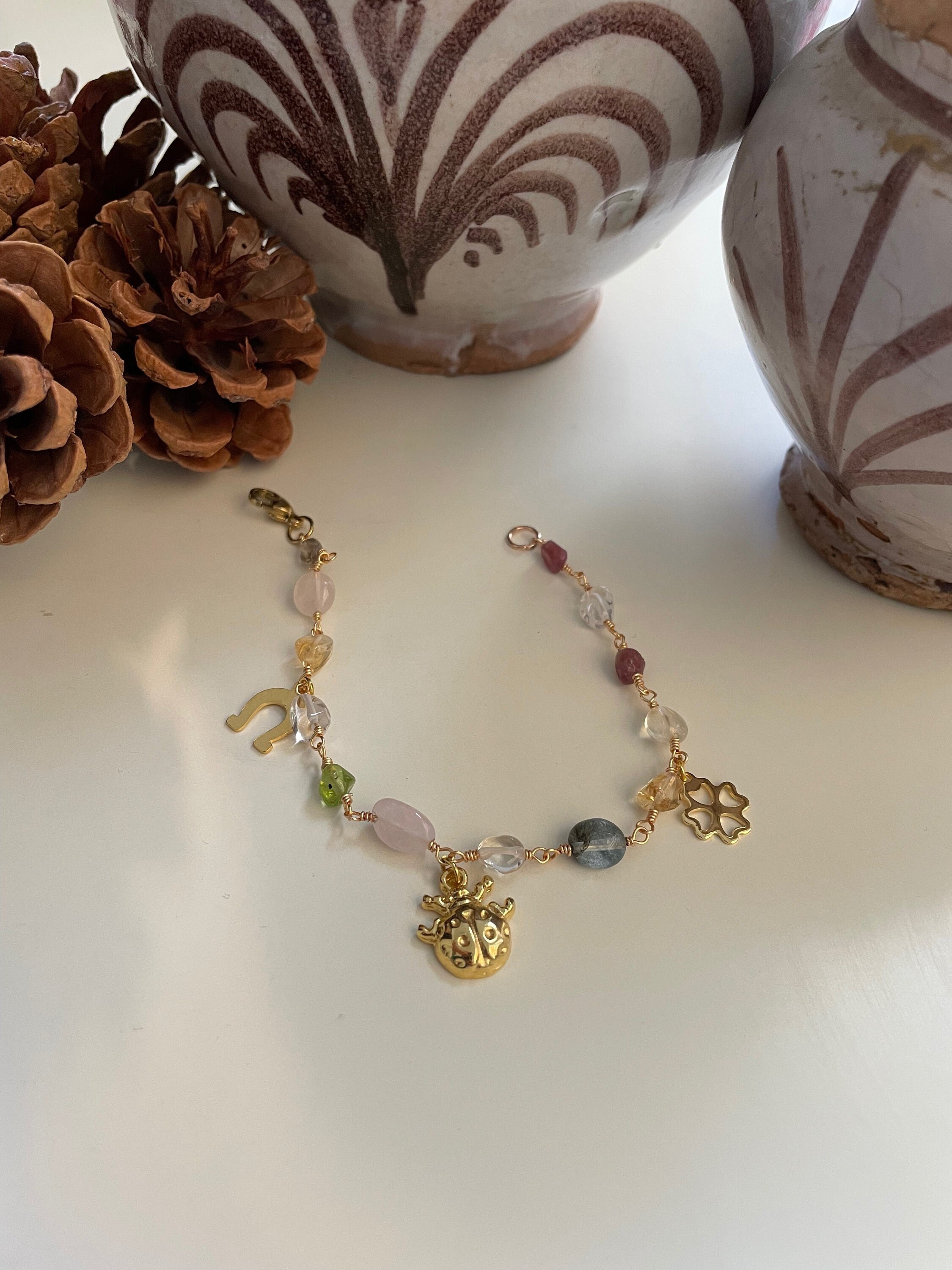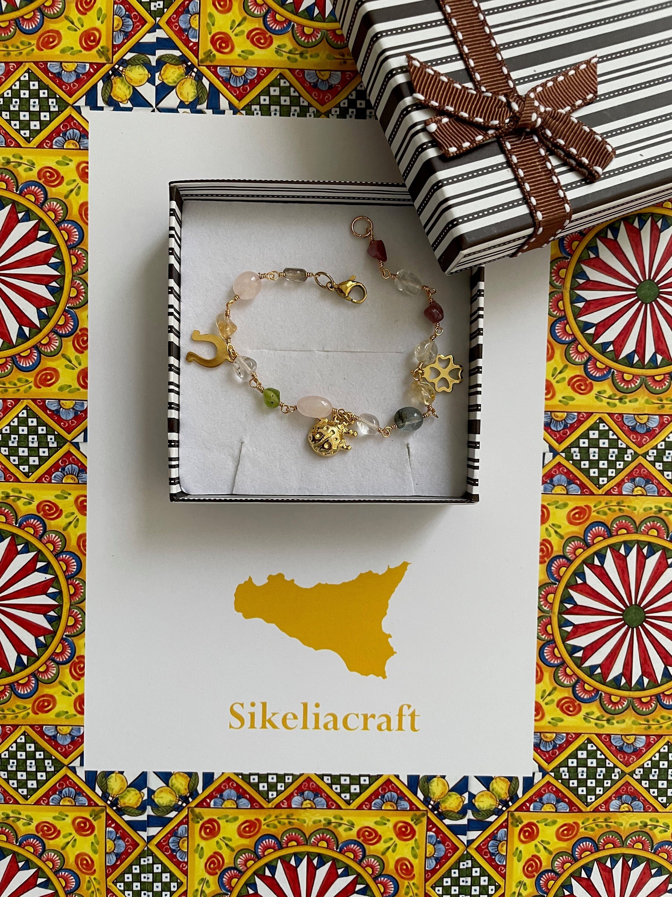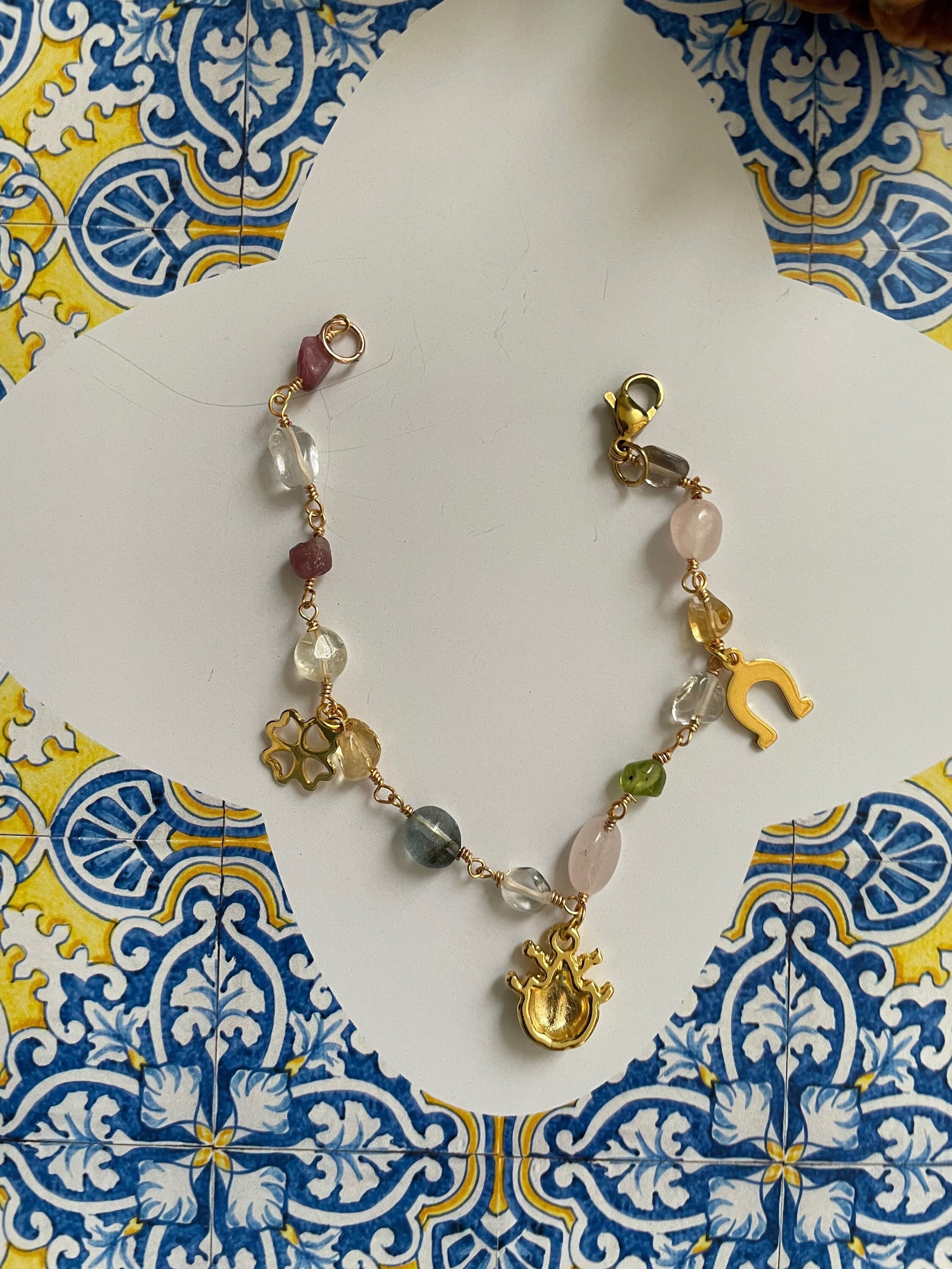 Braccialetto pietre dure, tormalina, peridoto, ametista, acquamarina, charms portafortuna, regalo per ragazza, regalo per lei.