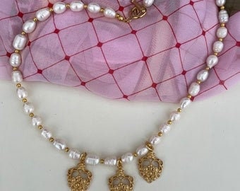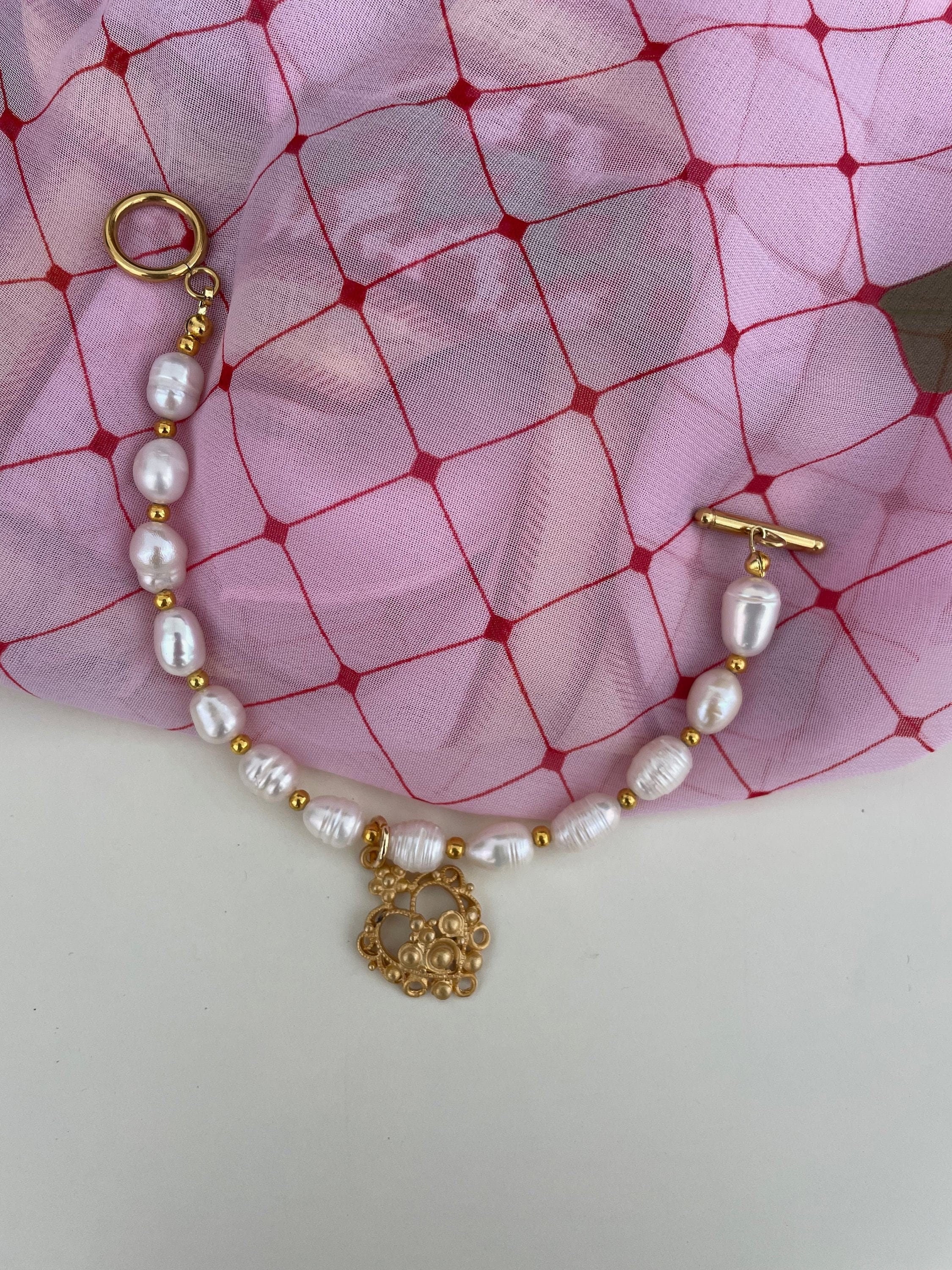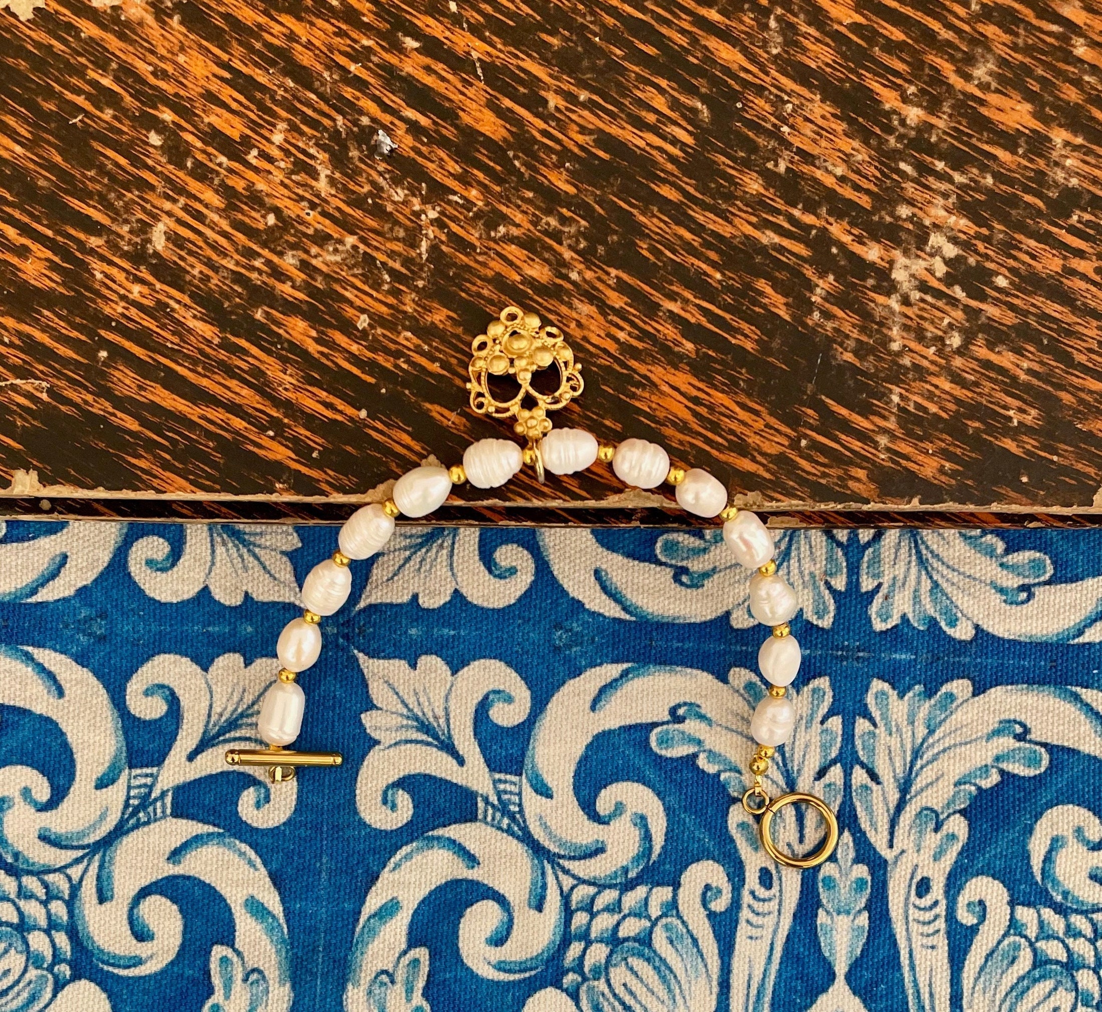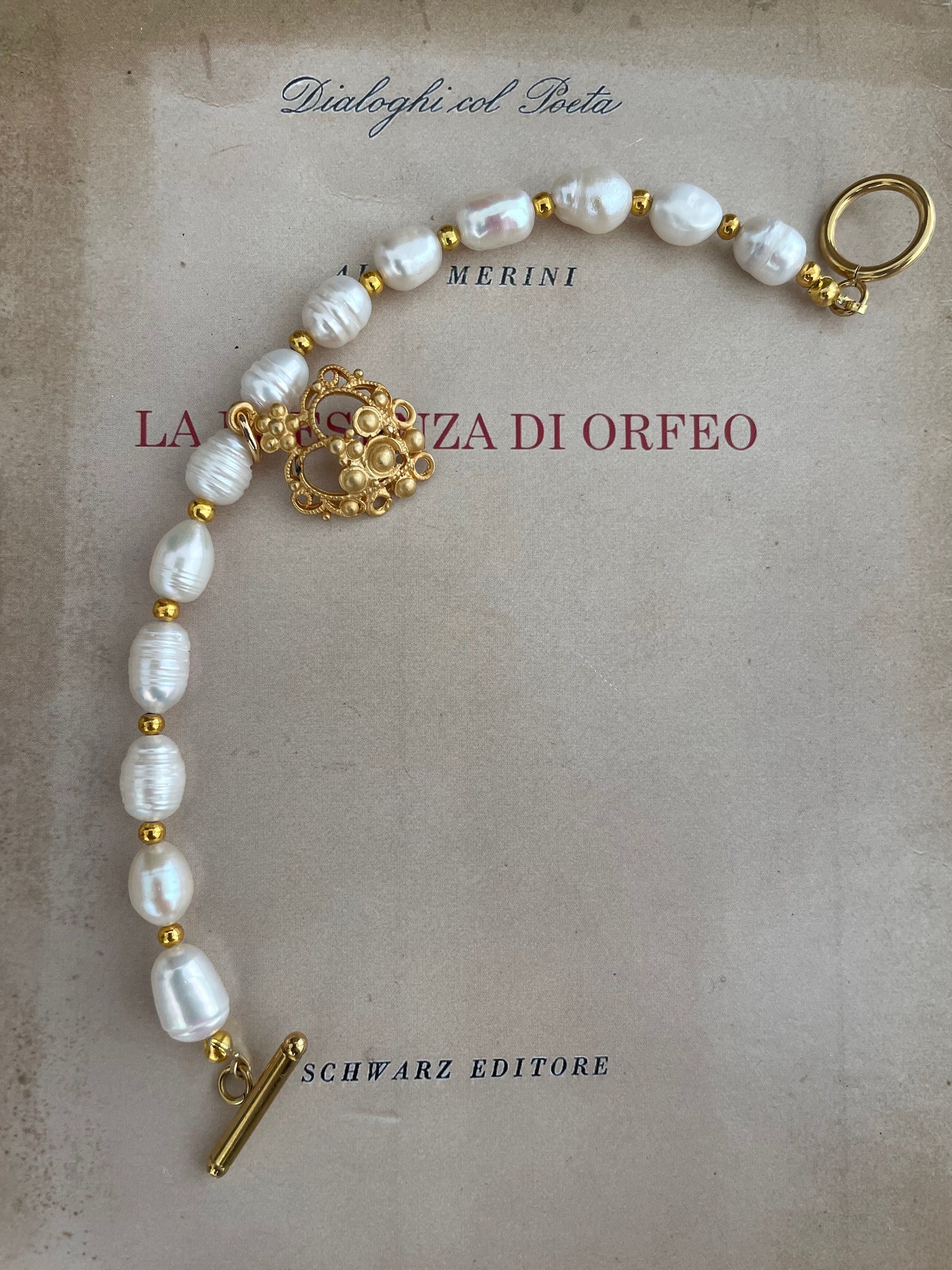 Bracciale classico con perle di fiume di forma ovale e leggermente irregolari alternate a piccole perle dorata.
