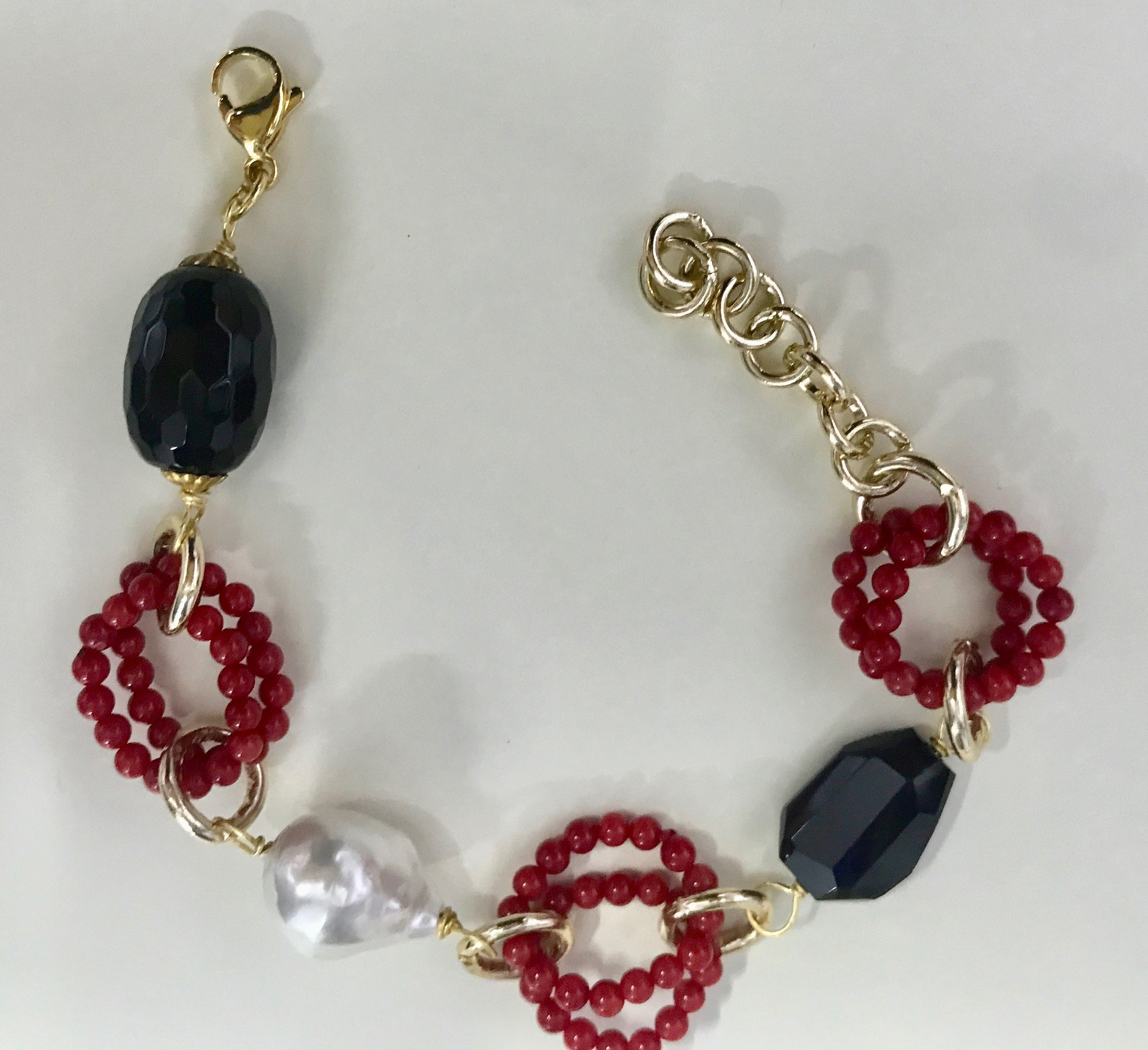 E’ composto da anelli di perle di pasta di corallo, perle ovali di onice e perla scaramazza. Le varie perle sono legate insieme da una catena in alluminio anallergico dorato.
