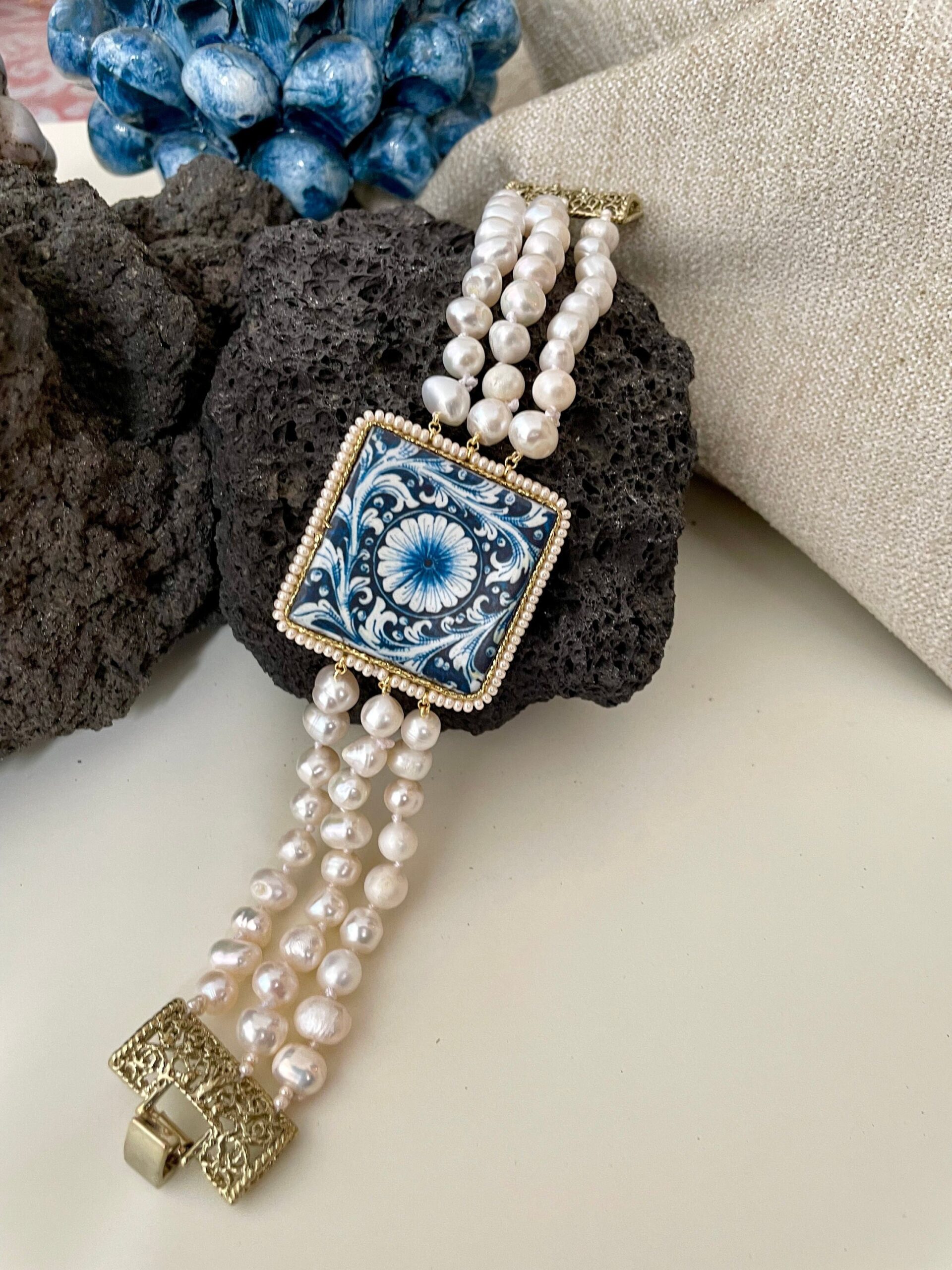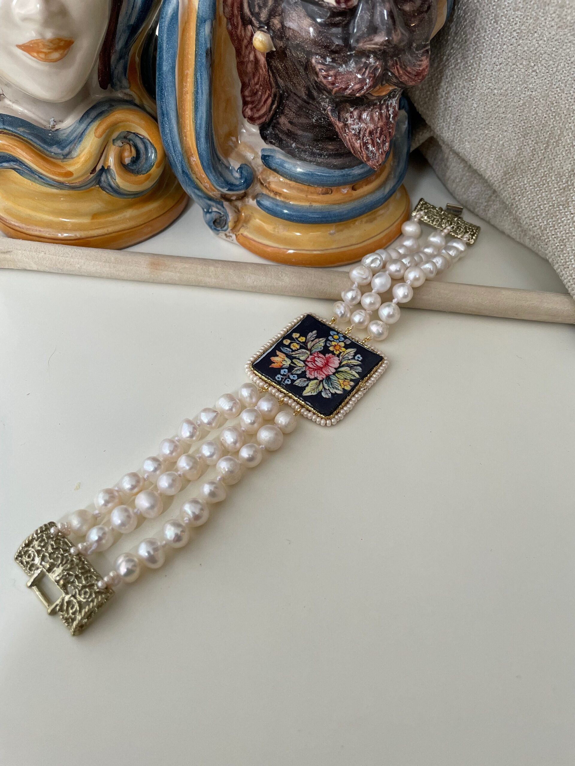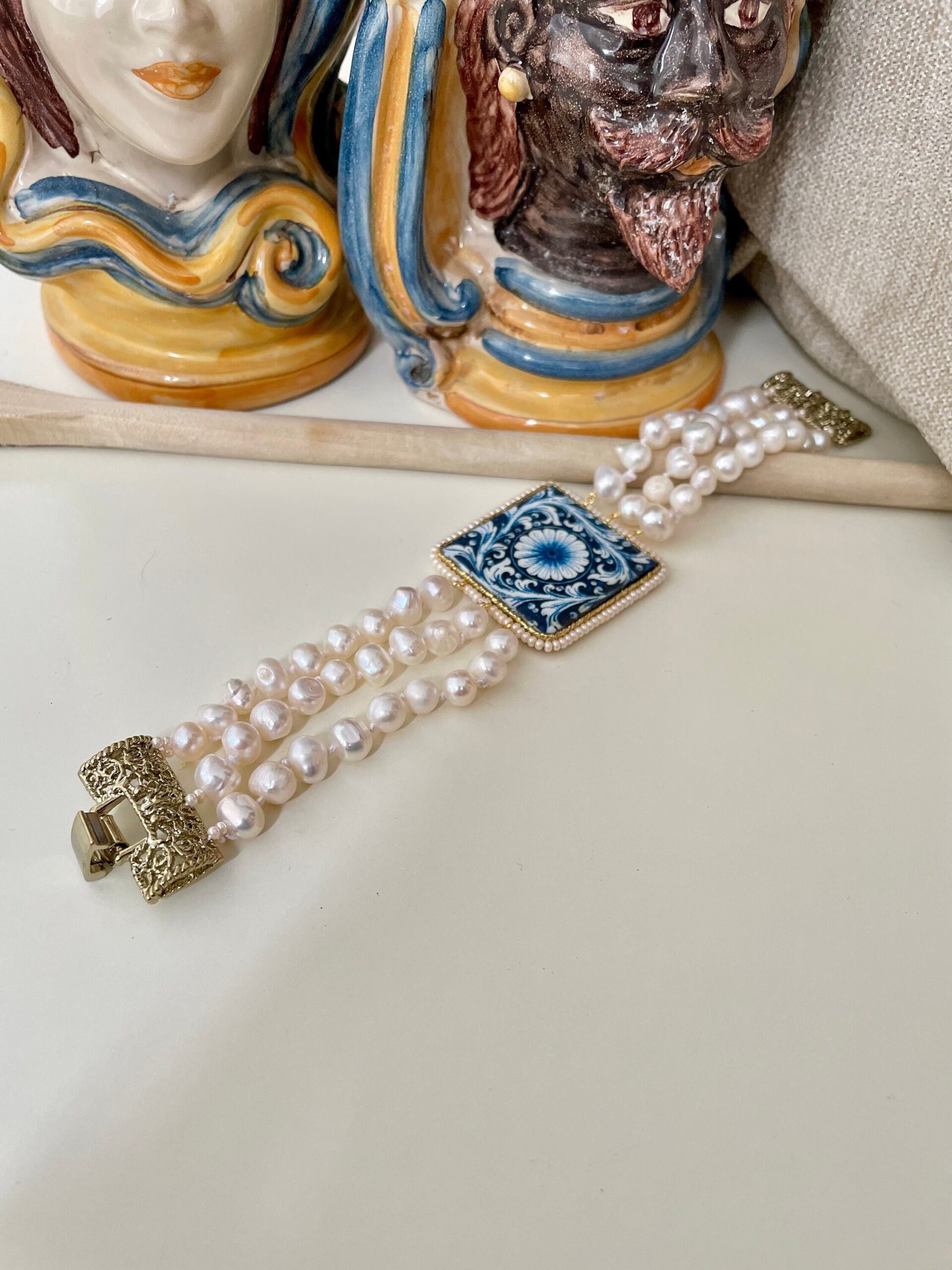 Realizzato con tre fili di perle naturali di fiume, singolarmente annodate, e grande mattonella di Ceramica di Caltagirone stampata in superficie con motivi tipici della maiolica siciliana.