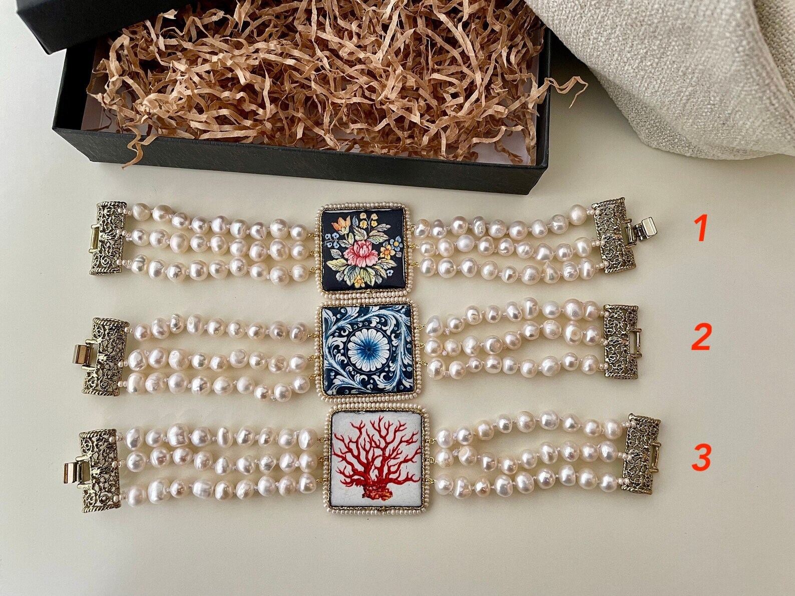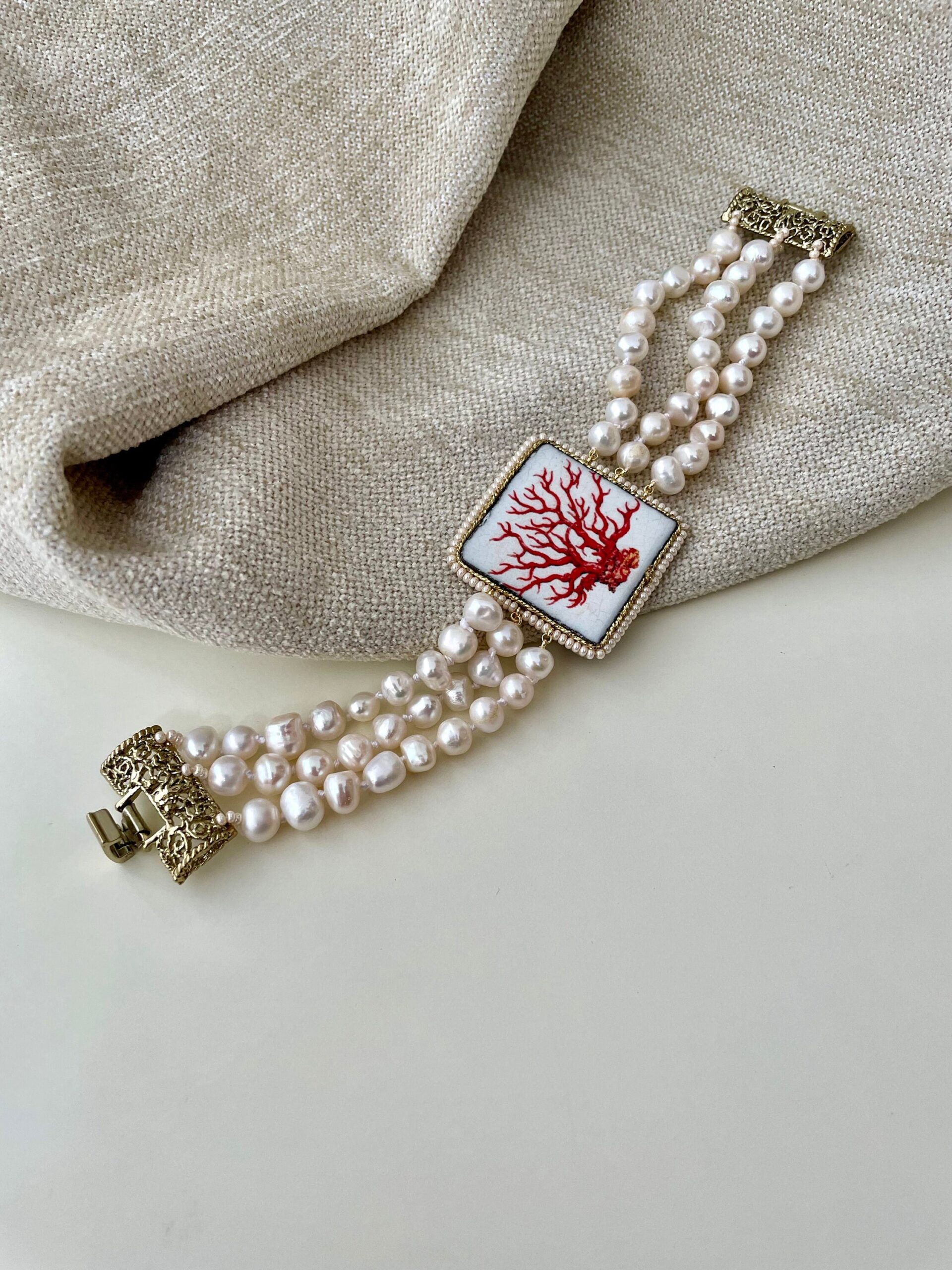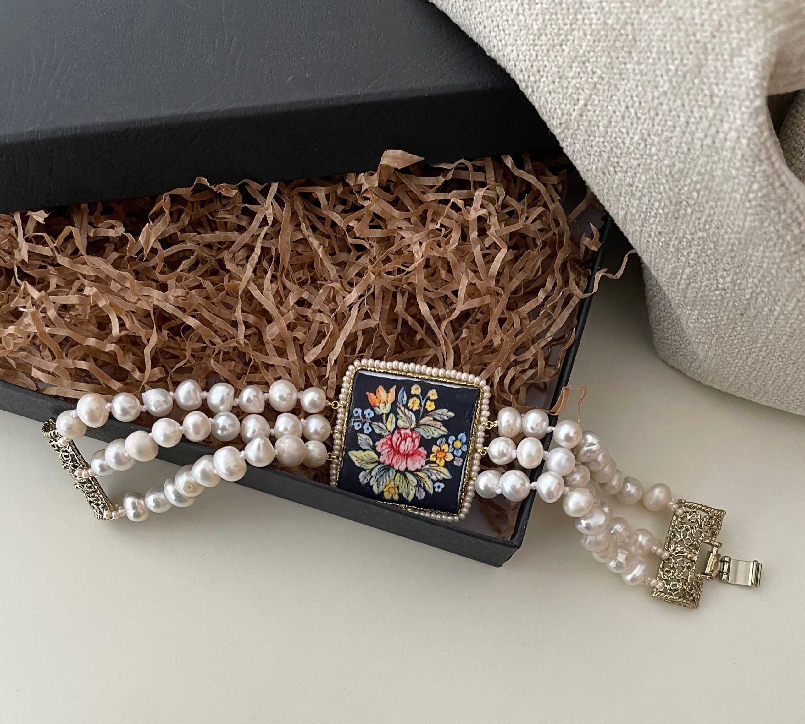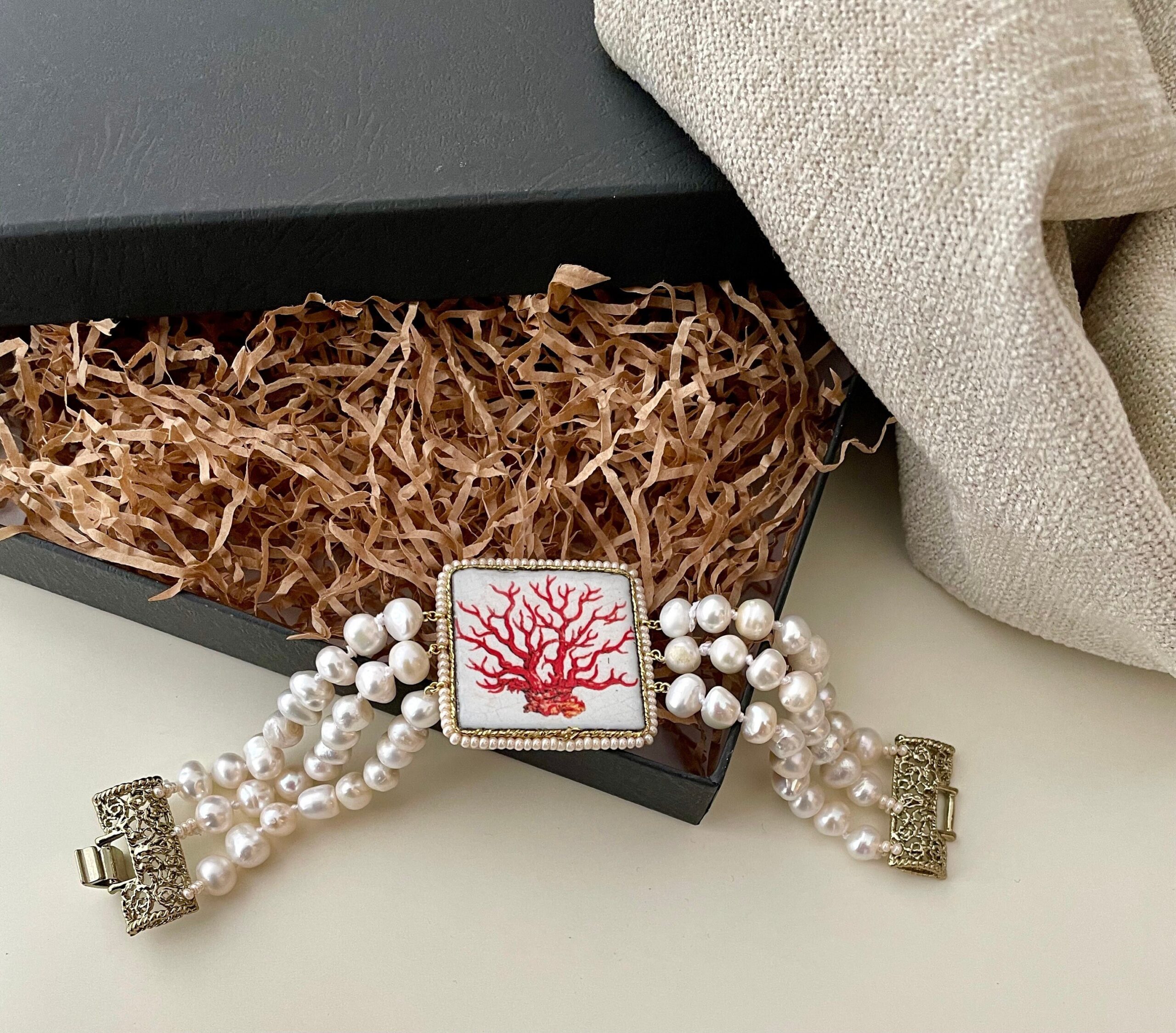 Realizzato con tre fili di perle naturali di fiume, singolarmente annodate, e grande mattonella di Ceramica di Caltagirone stampata in superficie con motivi tipici della maiolica siciliana.