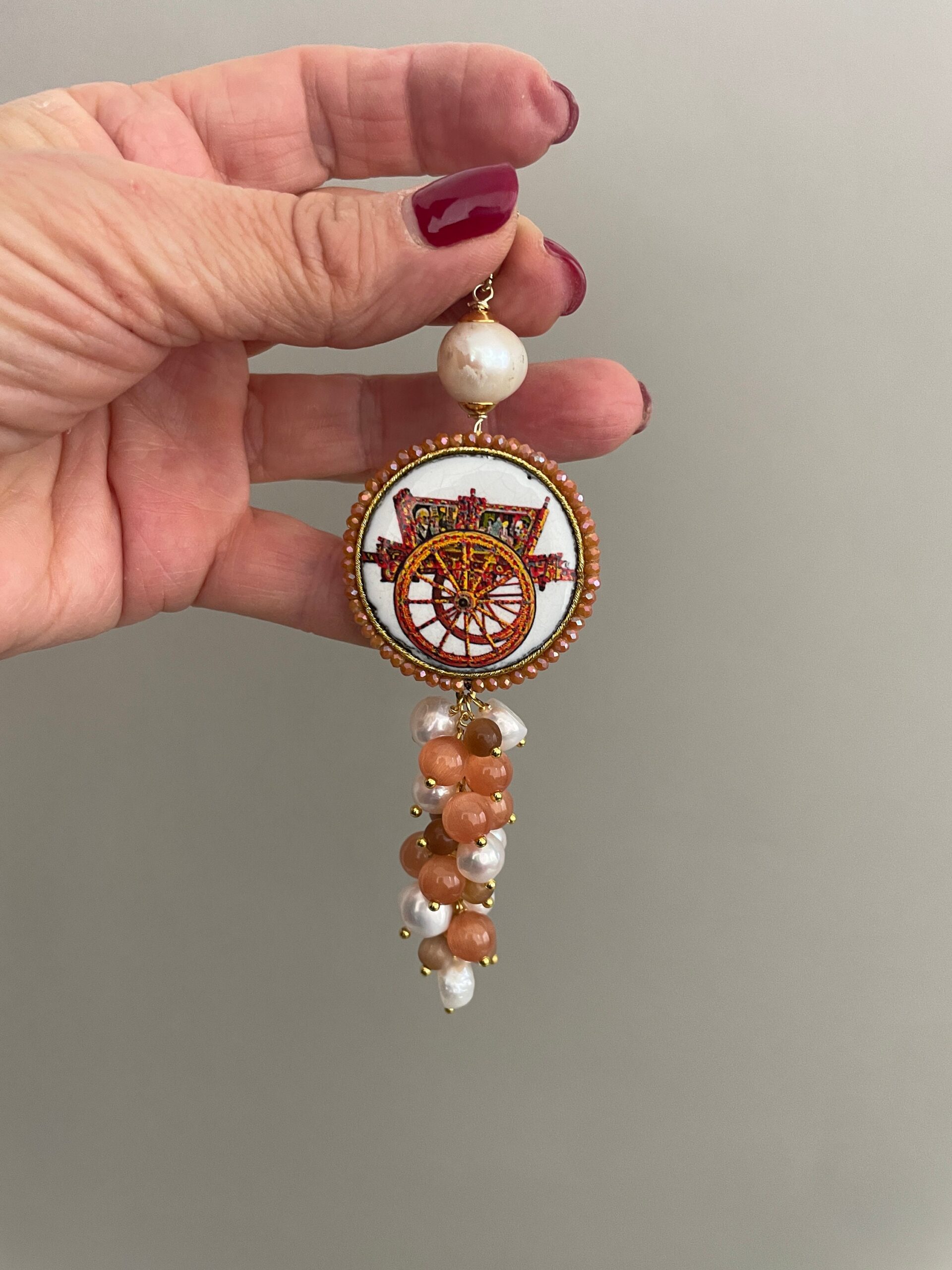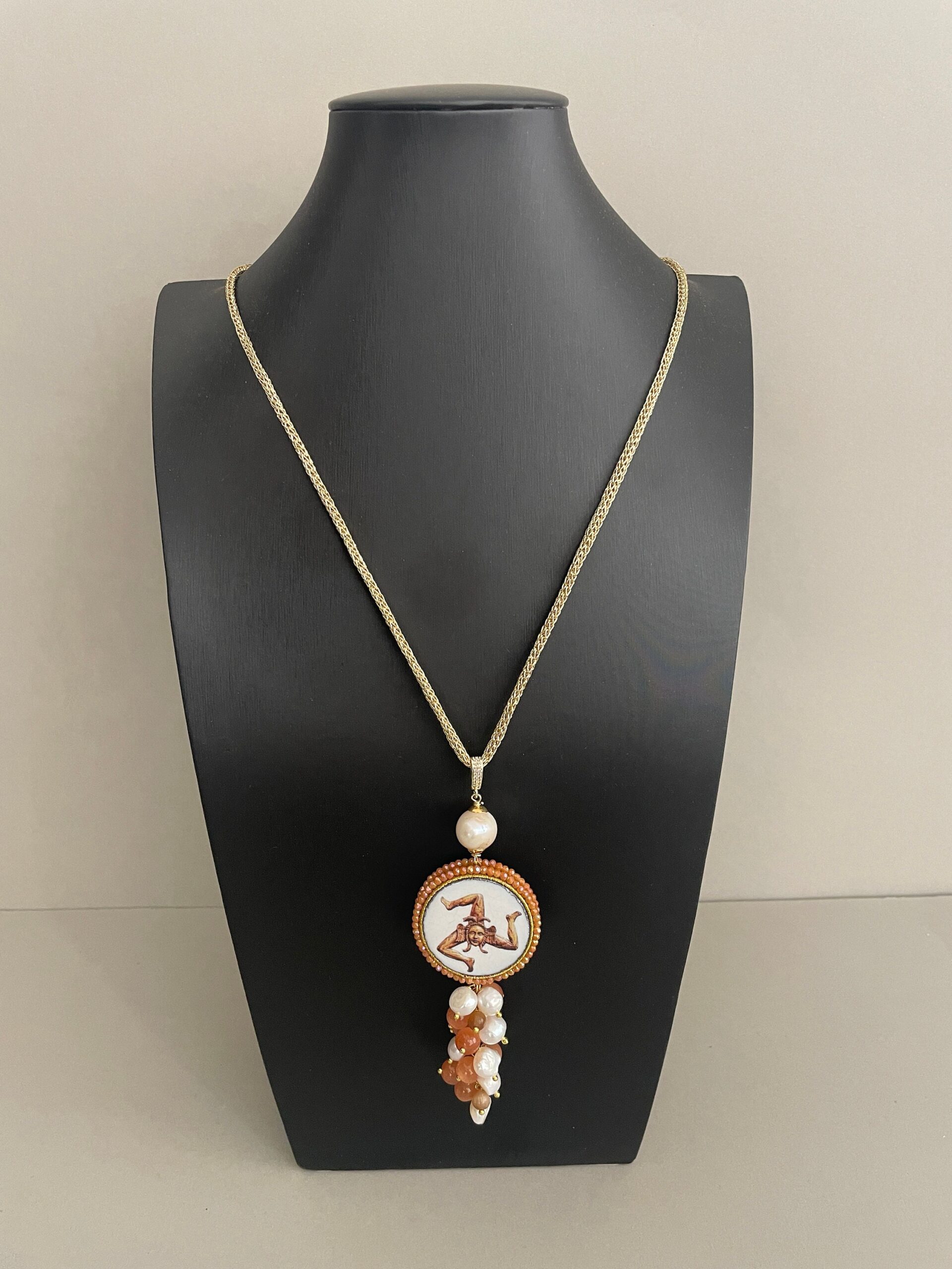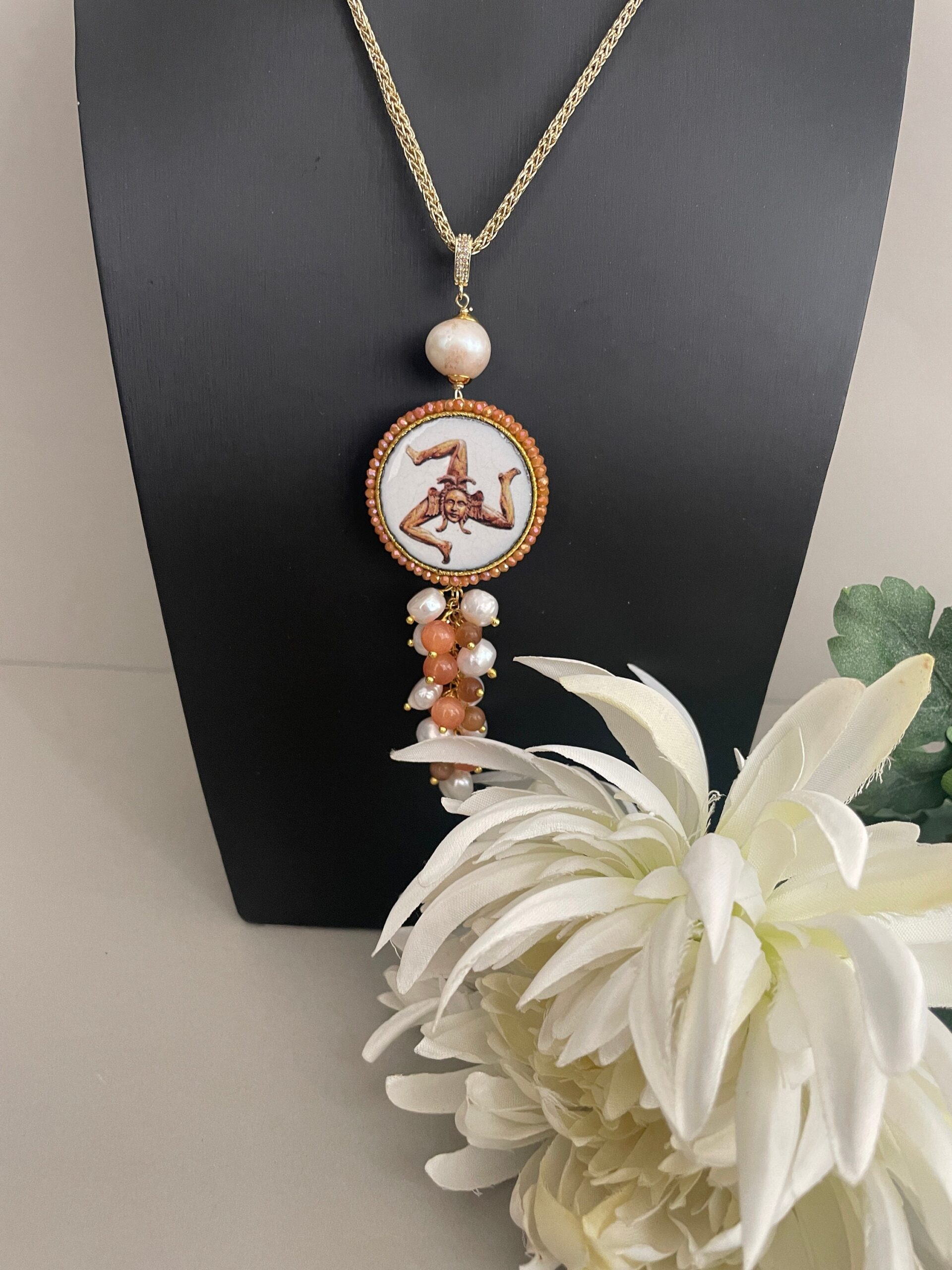 Ciondolo siciliano realizzato con una doppia mattonella di Caltagirone raffigurante una Trinacria su un lato e un carretto siciliano sull’altro. Le due mattonelle sono incorniciate da un filo di microperle di cristalli sui toni del beige.