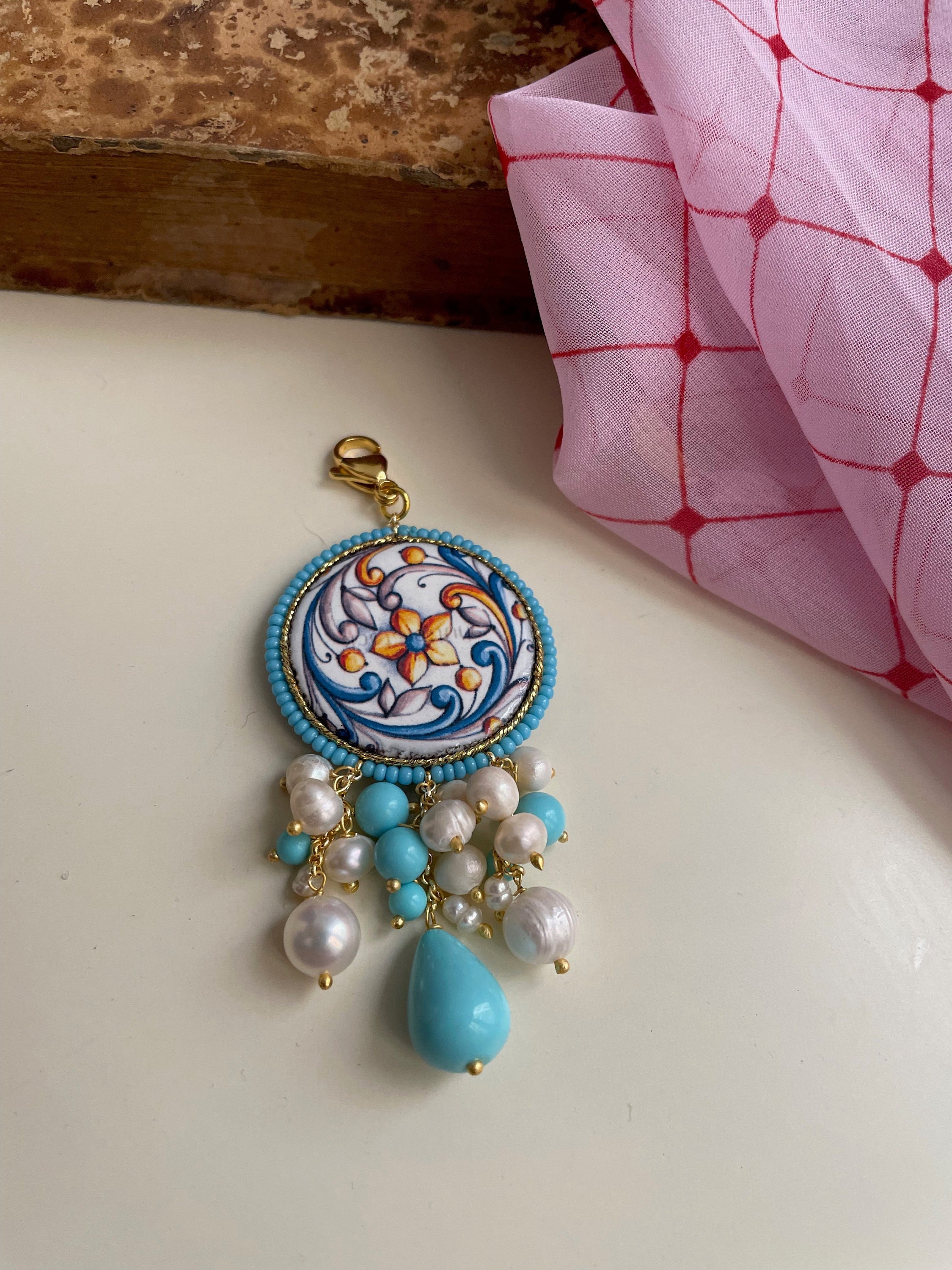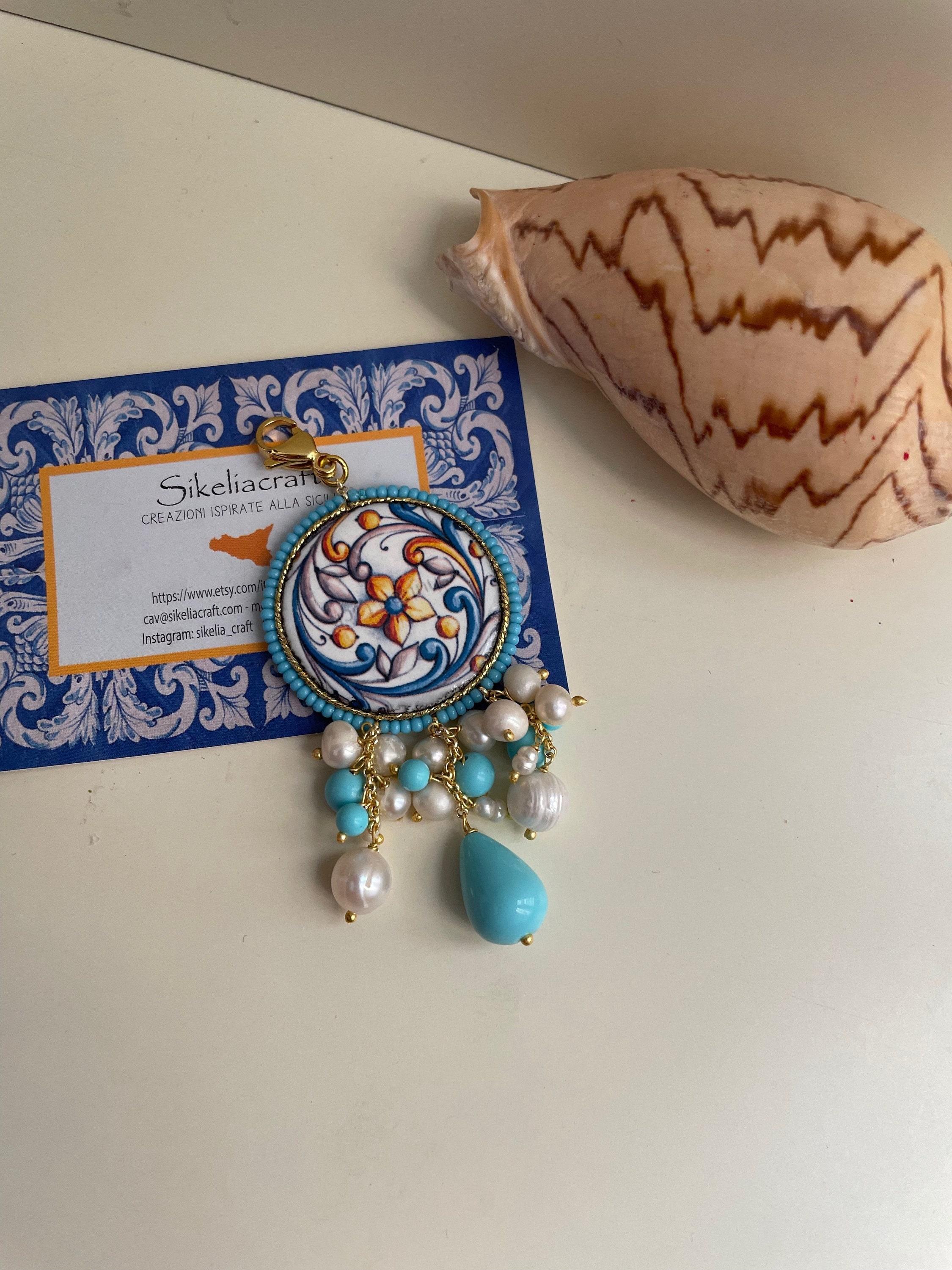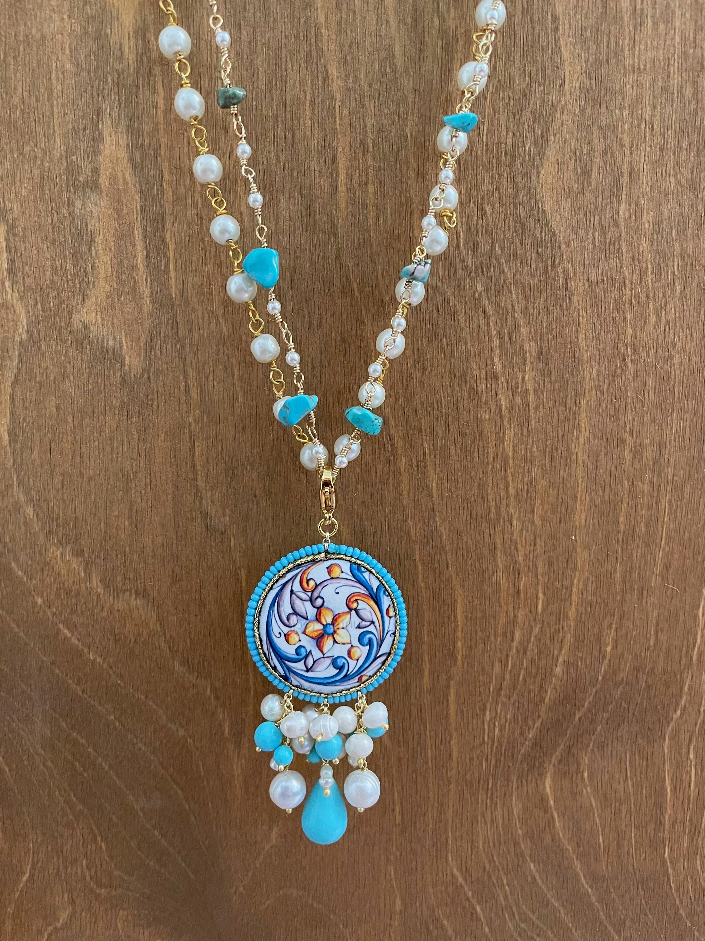 Ciondolo siciliano con mattonella di ceramica, perle turchesi e perle di fiume.
