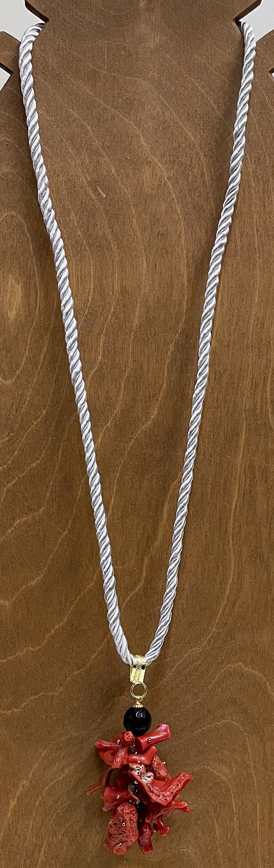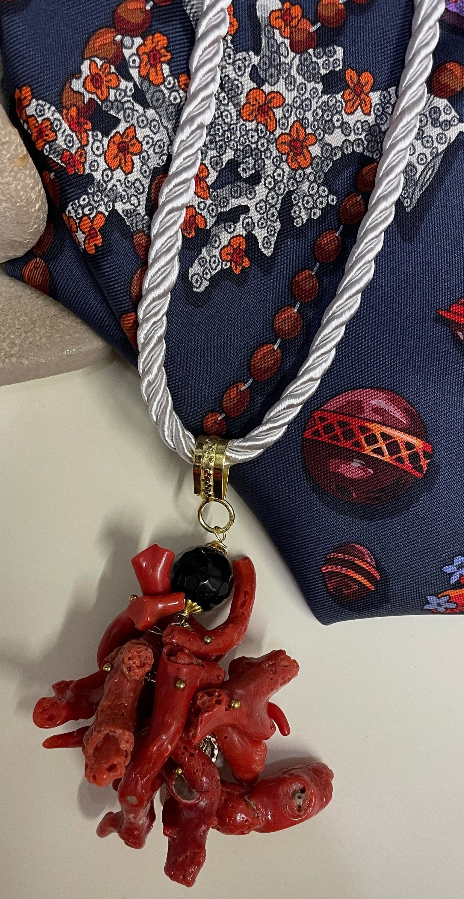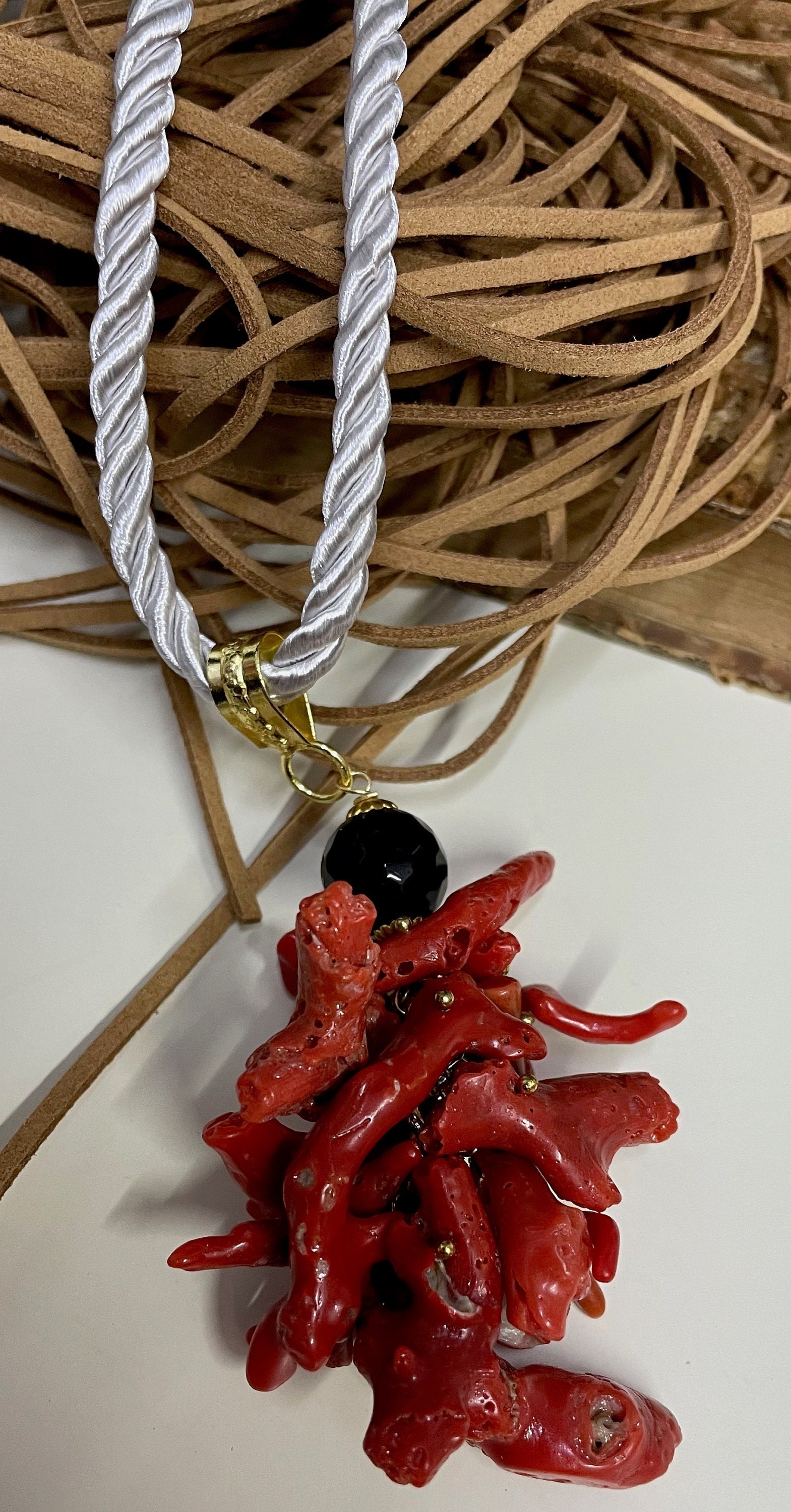 Il grappolo di corallo naturale cattura la luce con riflessi caldi e intensi, mentre l’onice nera dona un tocco di raffinatezza senza tempo. Perfetto da indossare con catene, nastri o cordoncini, il ciondolo viene fornito con un cordoncino in seta bianca per completare un look sofisticato e autentico. Questo ciondolo siciliano in corallo rosso è ideale per chi apprezza i dettagli unici.