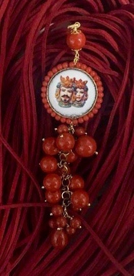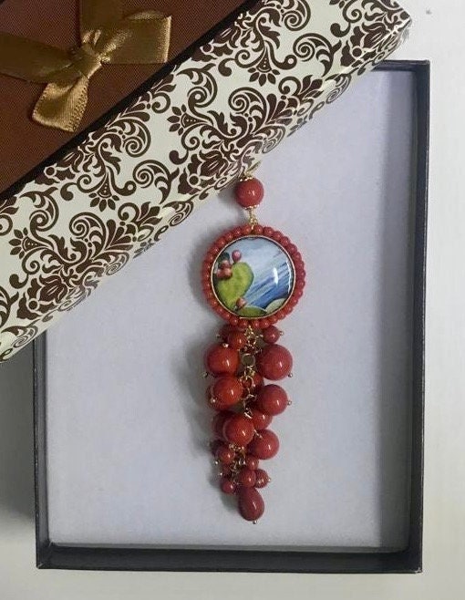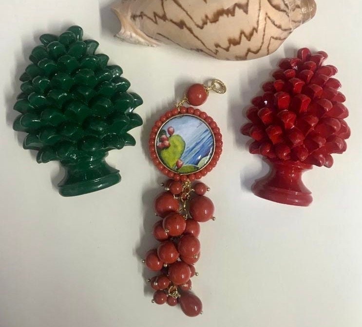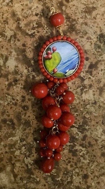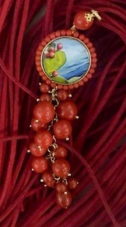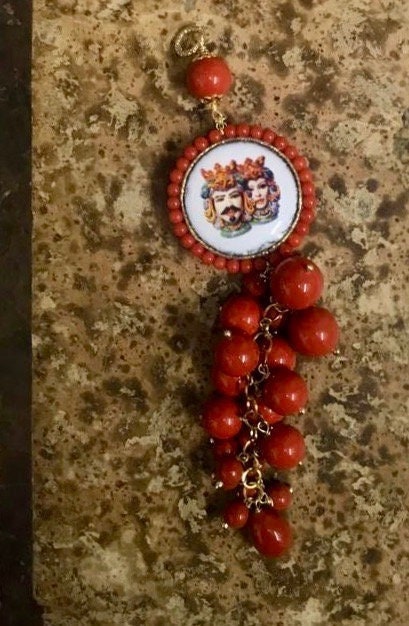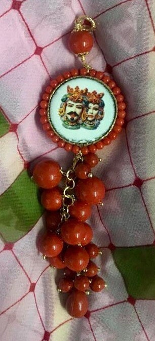 Ciondolo siciliano “double face”, mattonelle di ceramica di caltagirone, cascata di perle maiorca rosse, regalo per lei, regalo laurea.