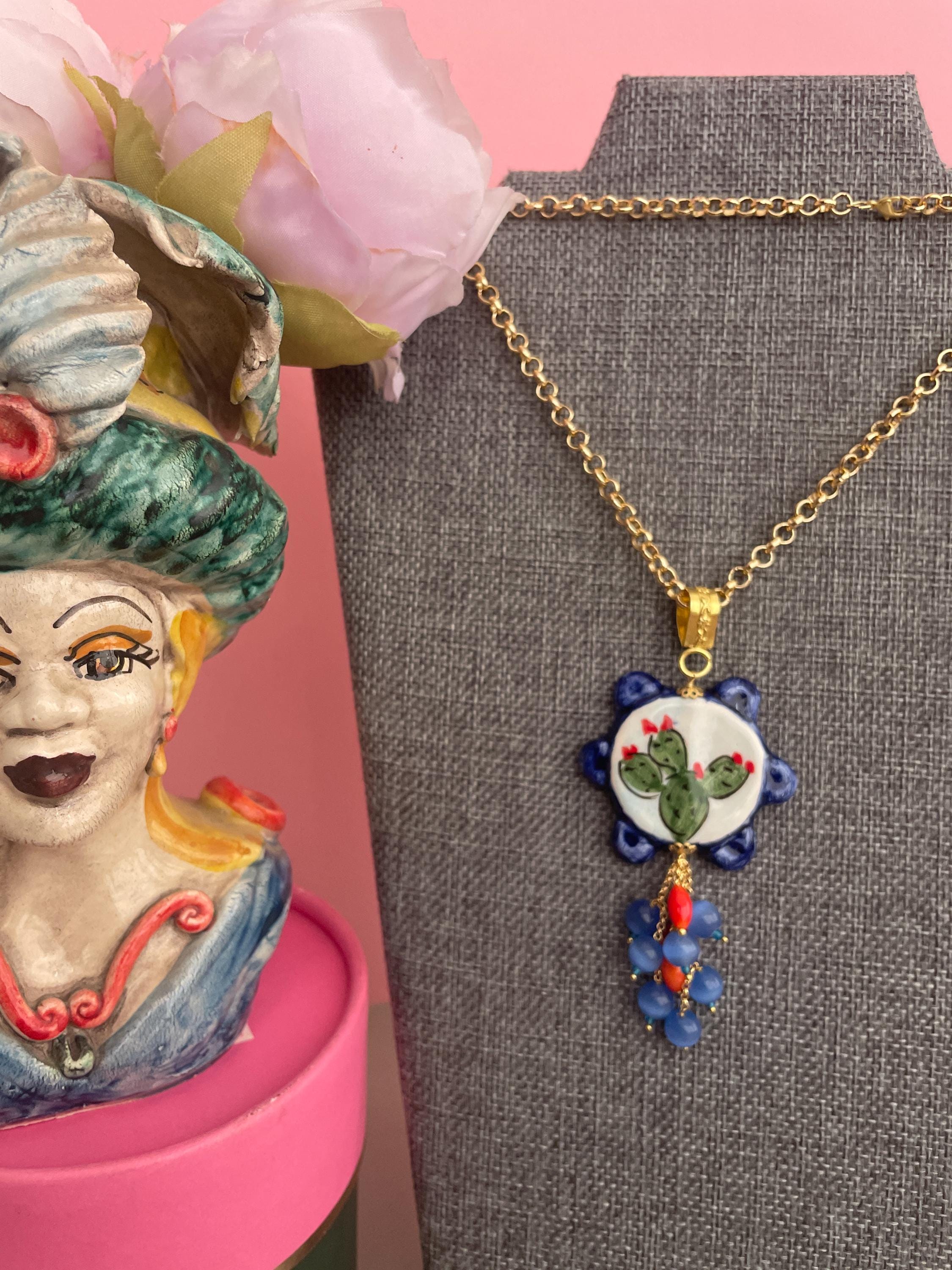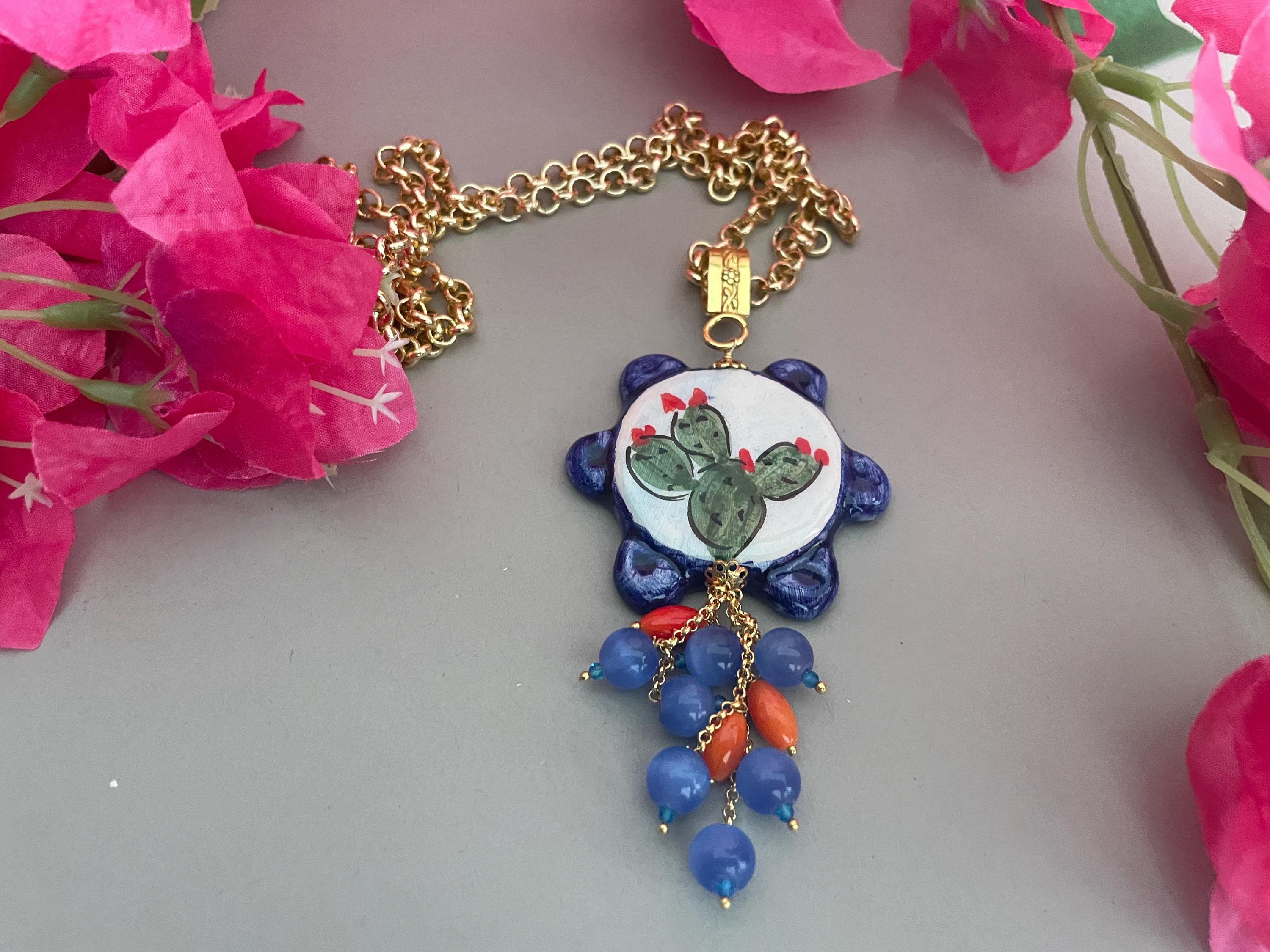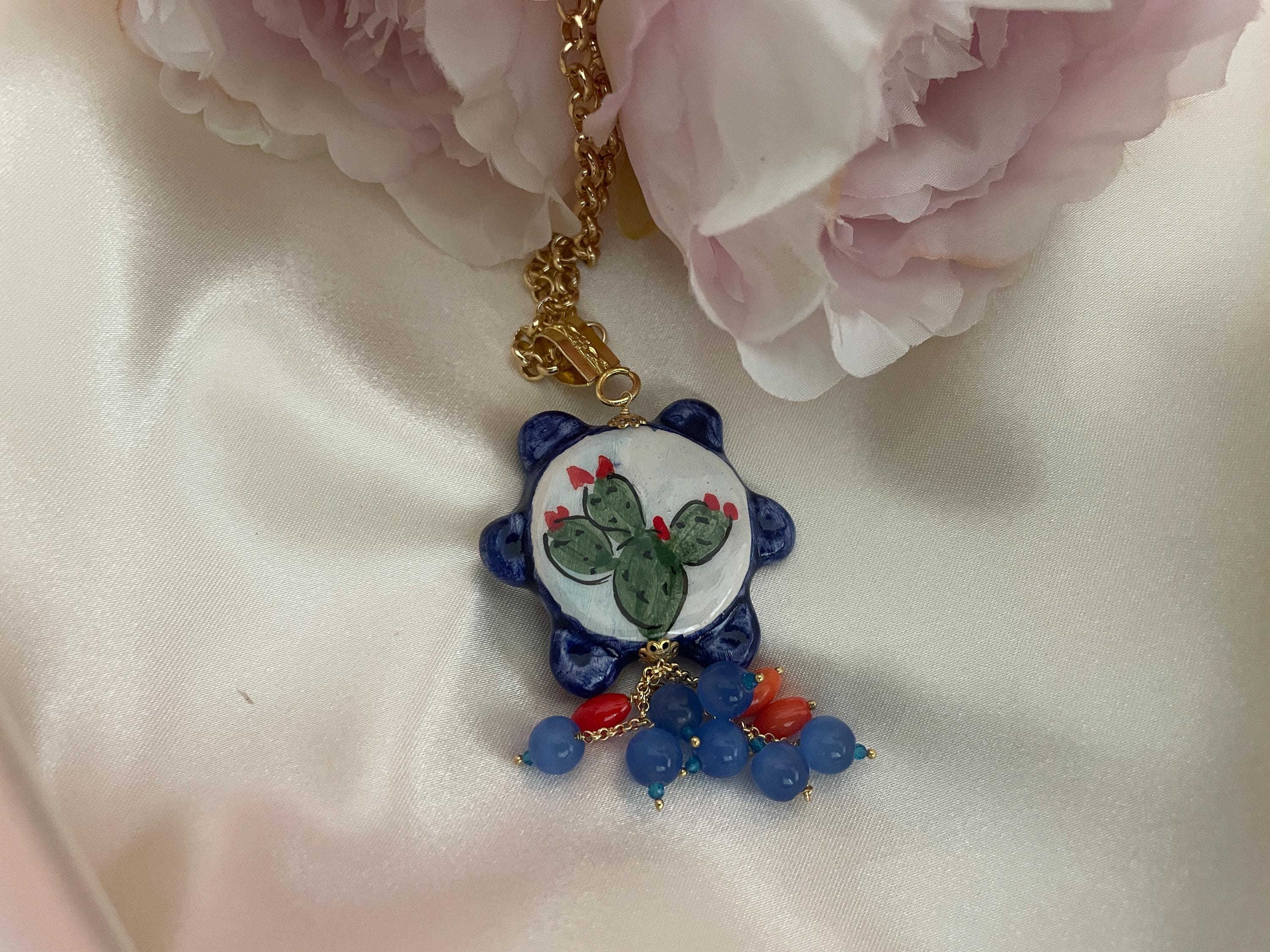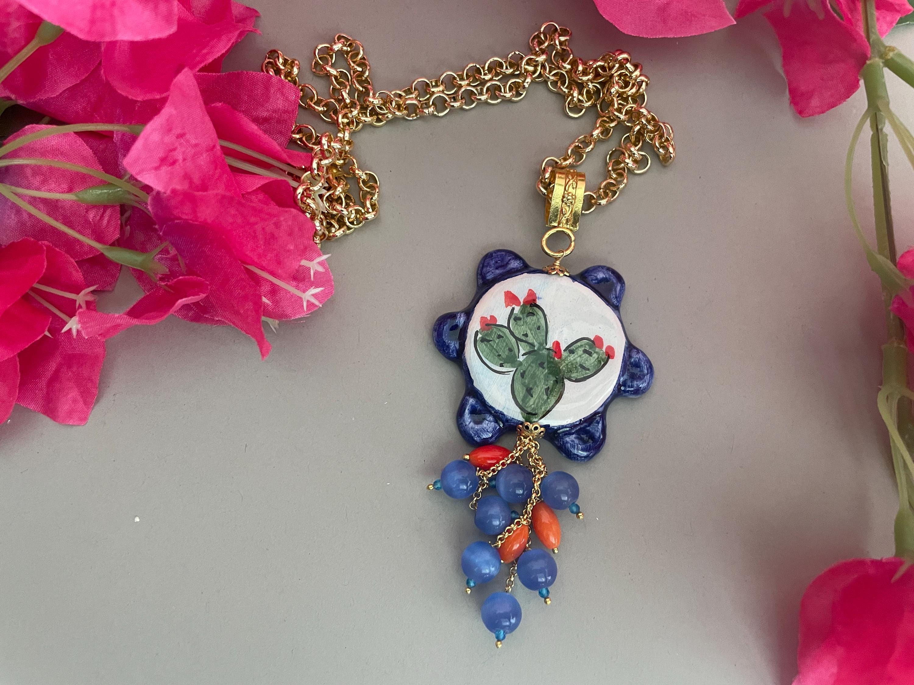 Ciondolo tamburello, ceramica di Caltagirone dipinta a mano, Fico d’India, pendenti perle di pietre dure e perle di fiume, vari colori.