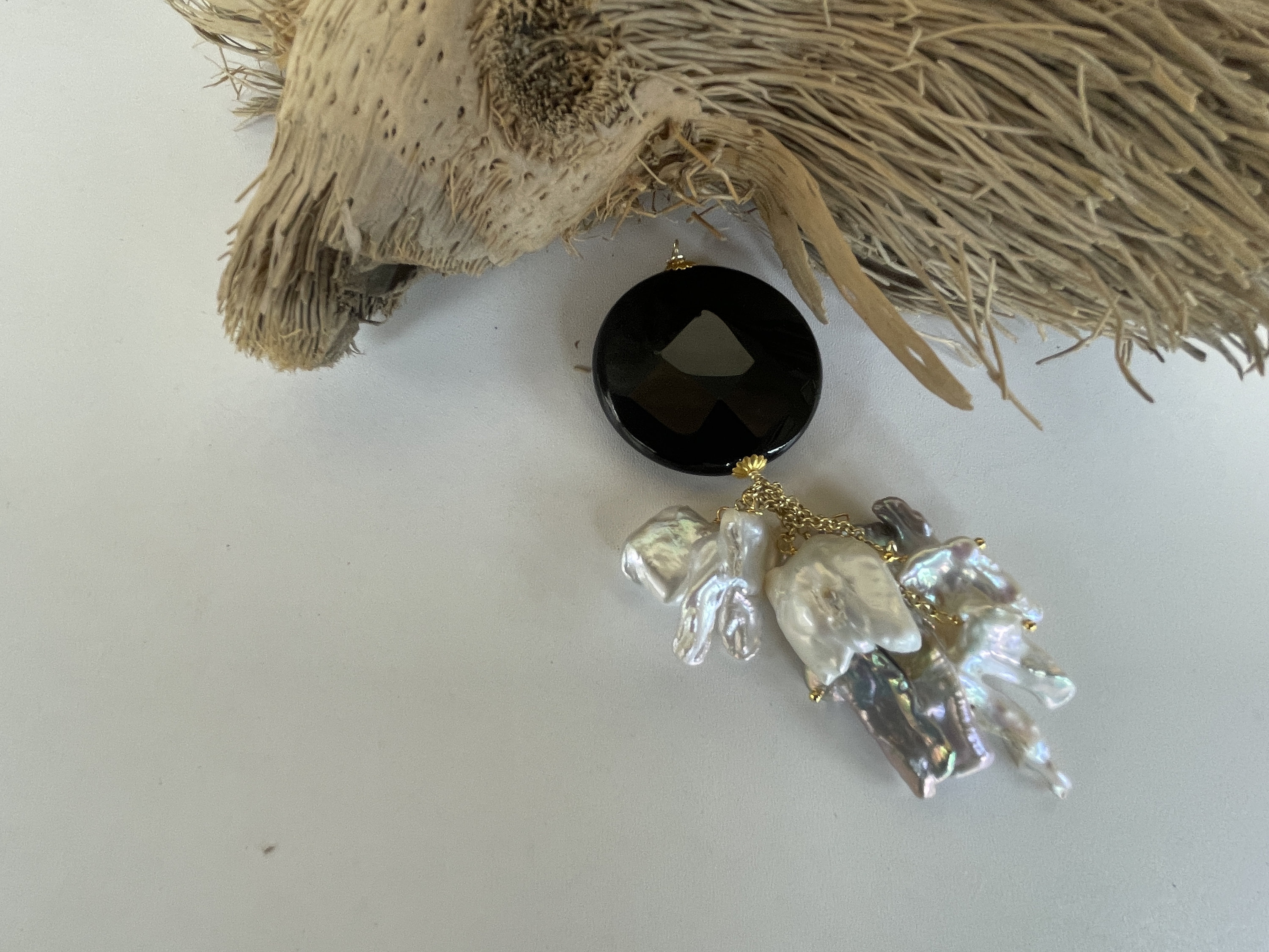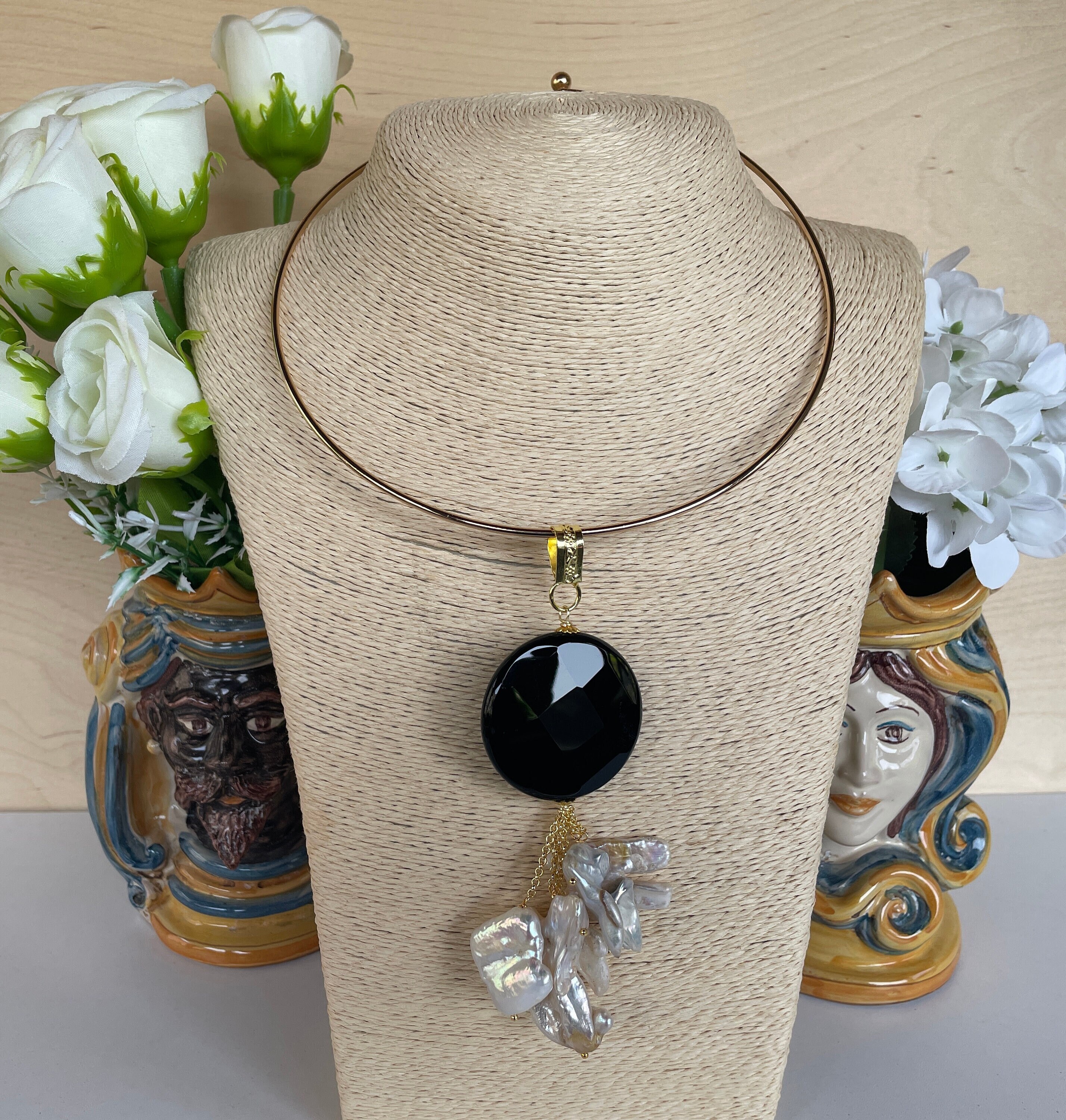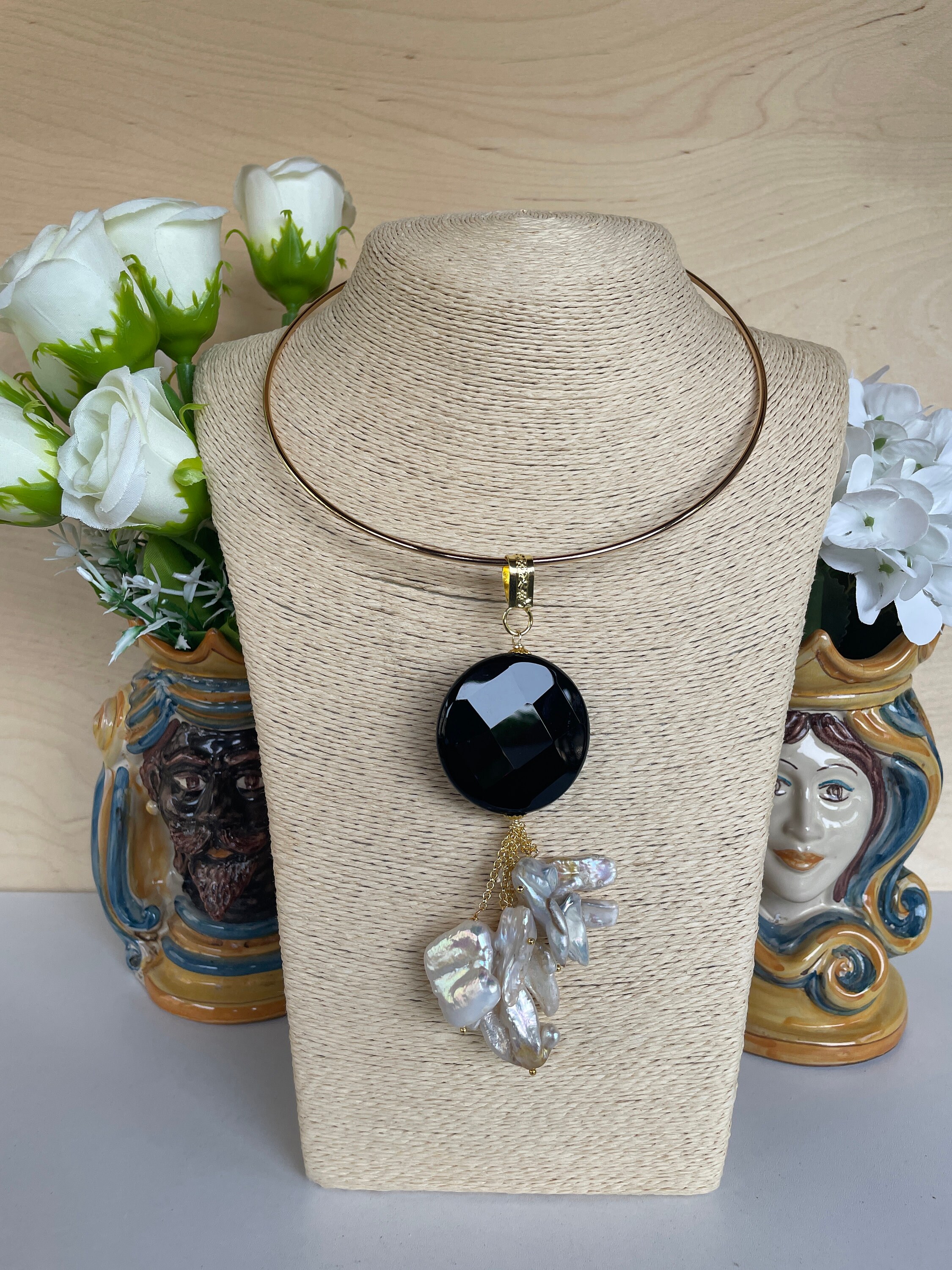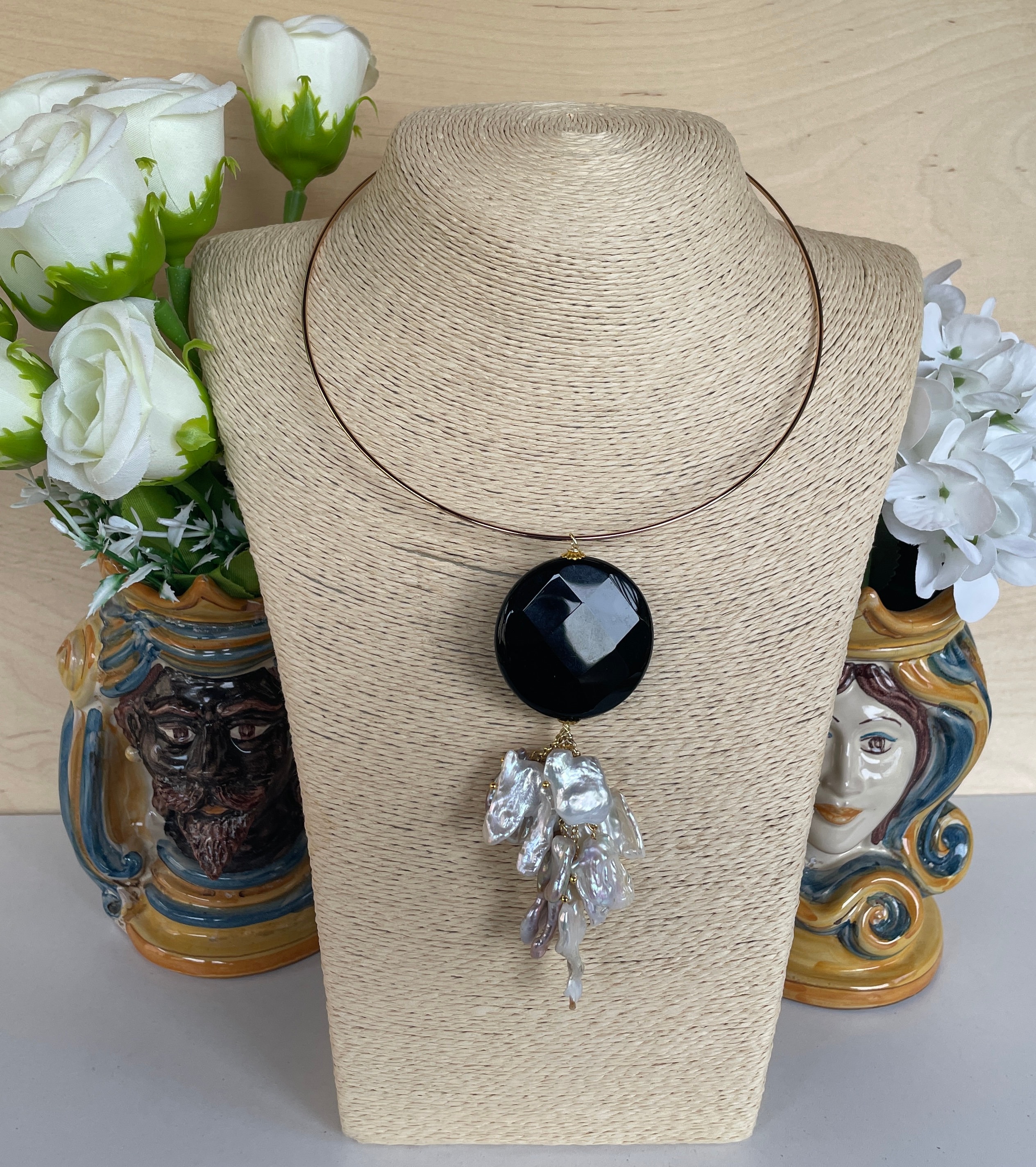 Il ciondolo, rigorosamente realizzato artigianalmente, si compone di una grande perla piatta e tonda sfaccettata di Onice lucido da cui pende uno splendido grappolo di perle scaramazze naturali.
