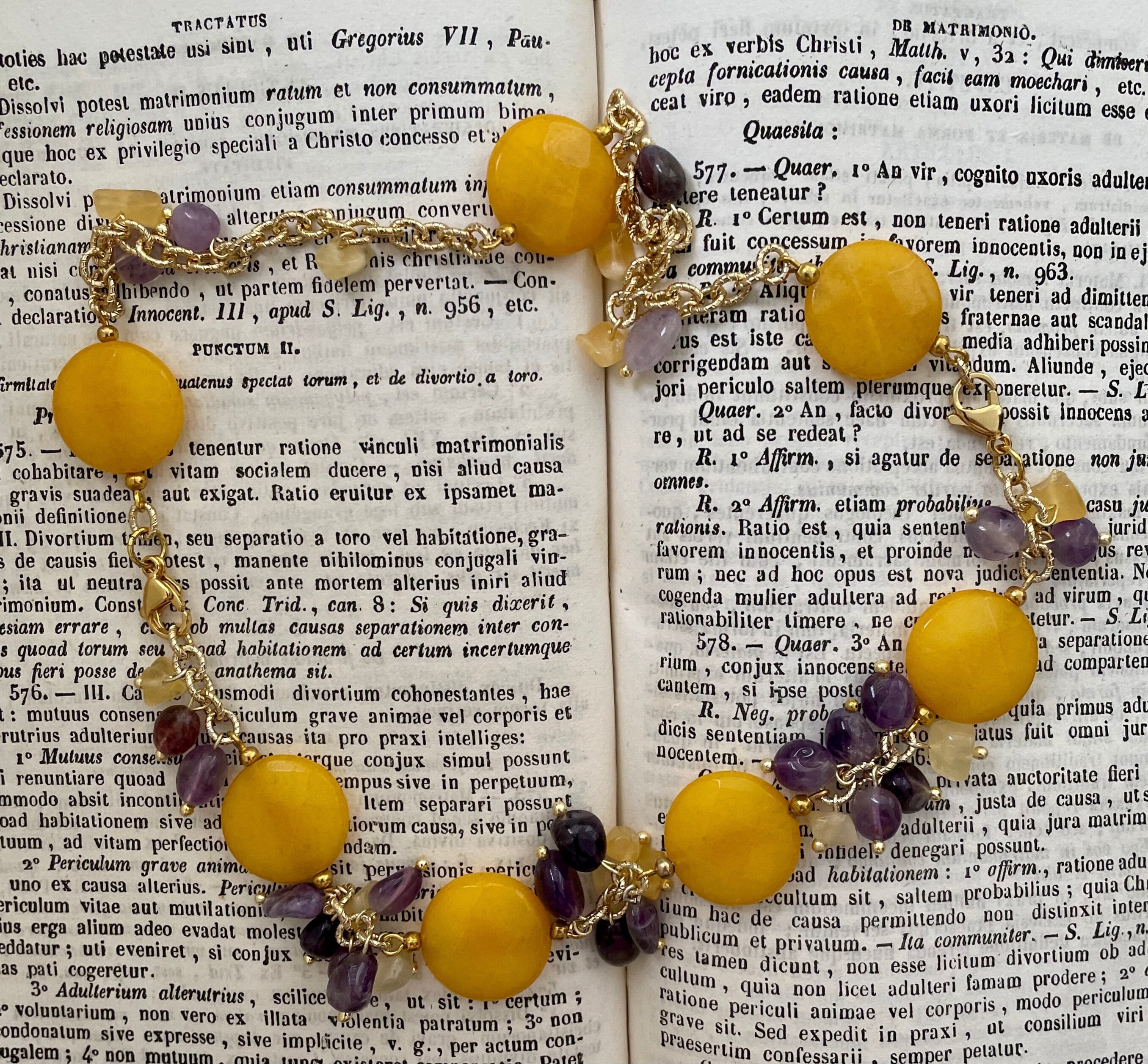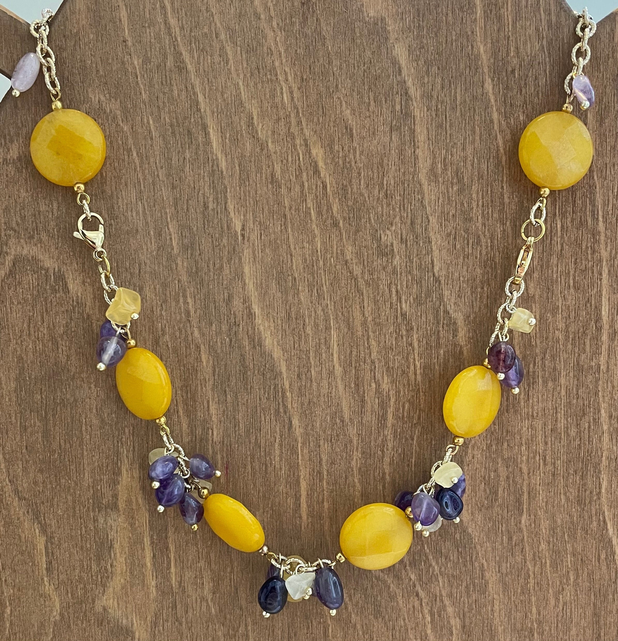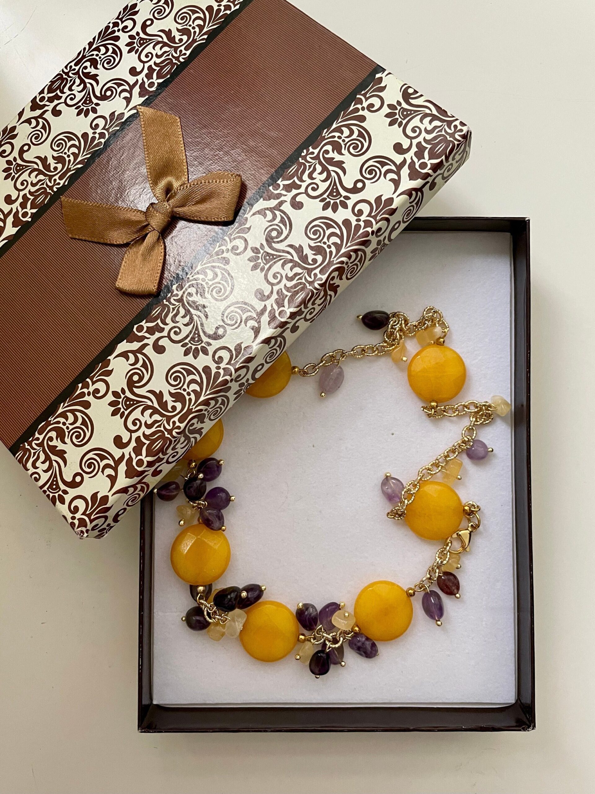 Composta da perle piatte grandi di agata gialla, grappoli di ametista e tormalina gialla, legate insieme da anellini dorati.