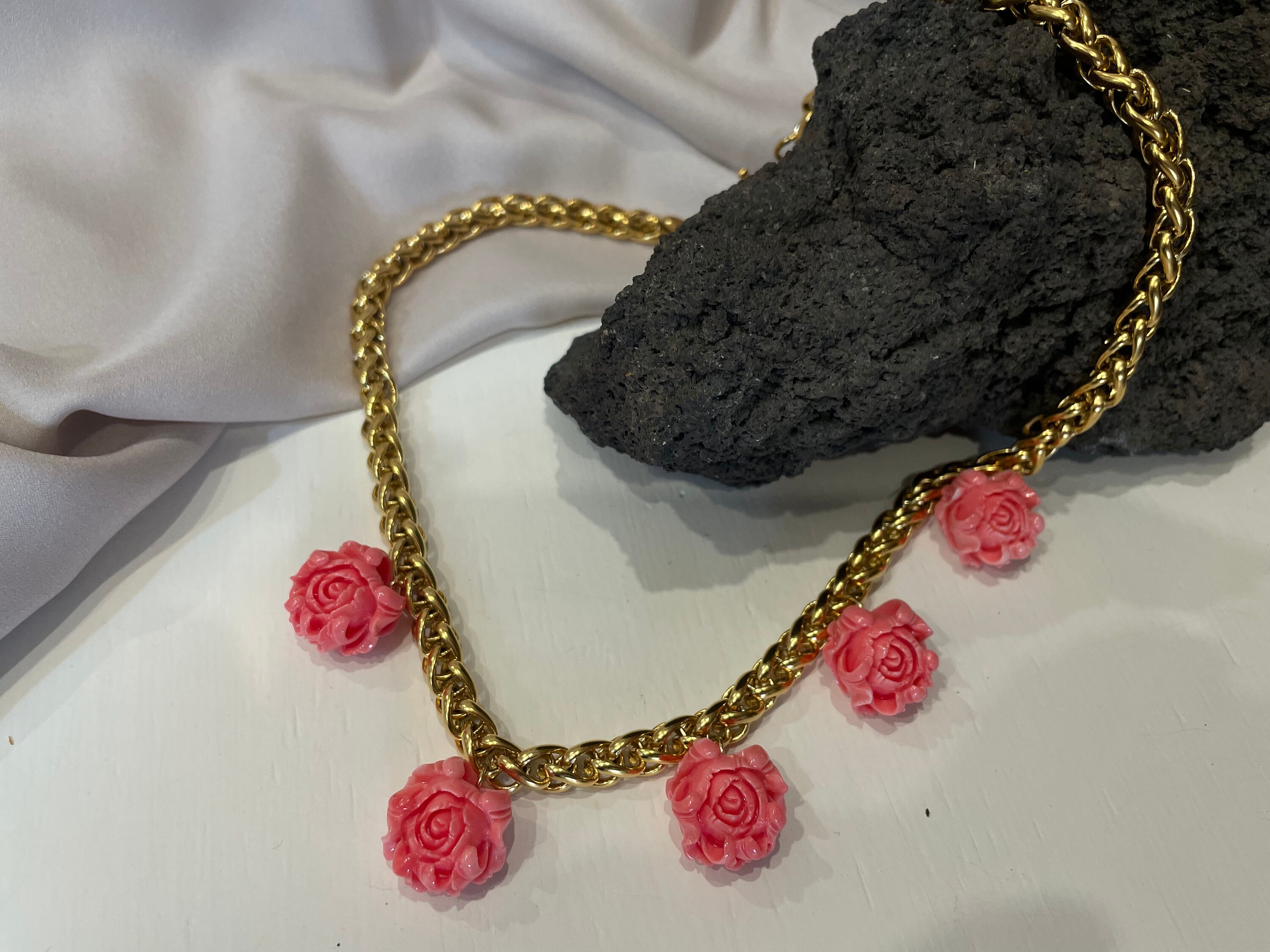 Collana a maglia grossa, con catena acciaio placcata oro 14k, collana girocollo, pendenti rose in pasta di Corallo, collana romantica.