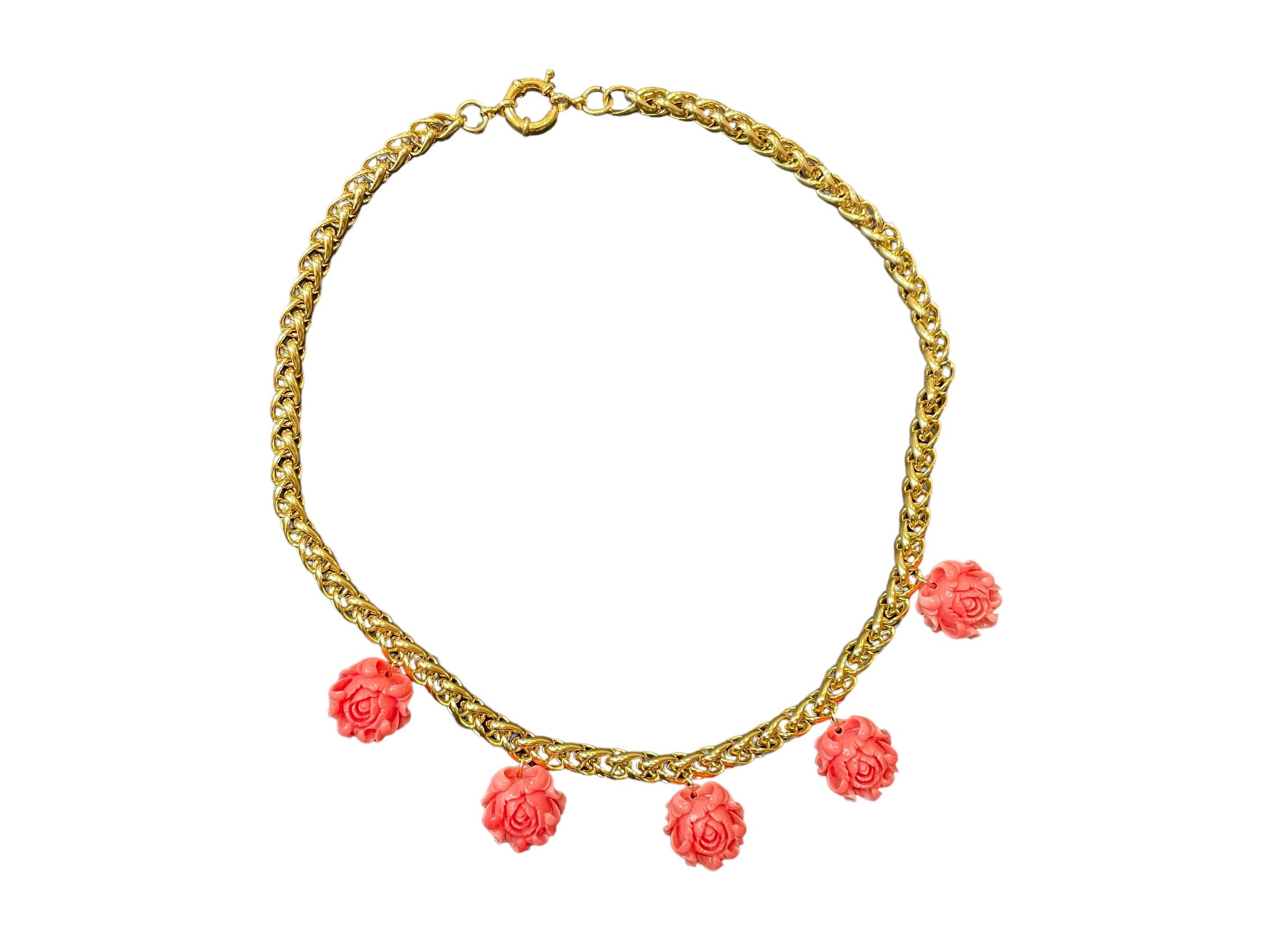 Deliziosa collana romantica con cinque pendenti a forma di rose in pasta di corallo.