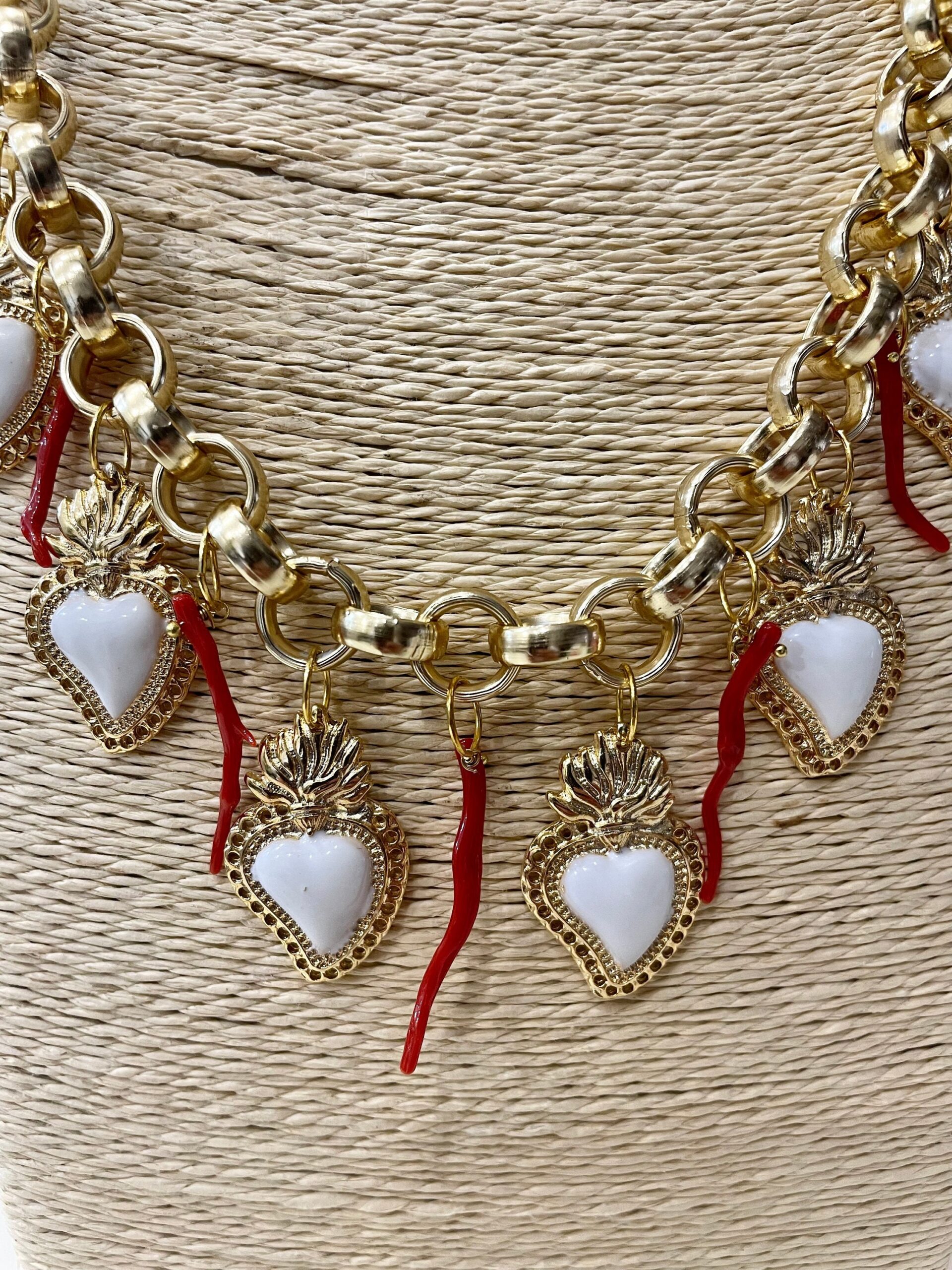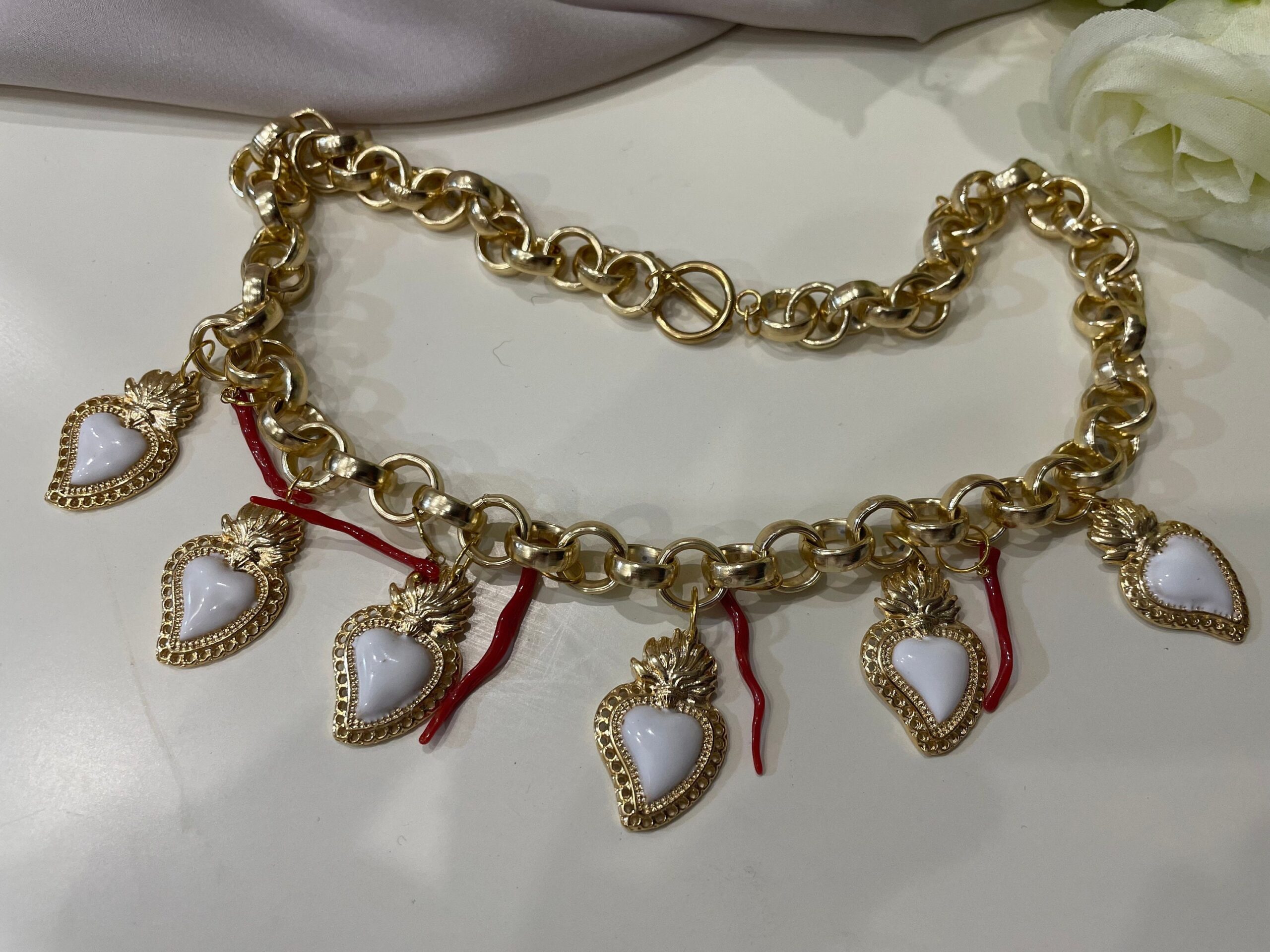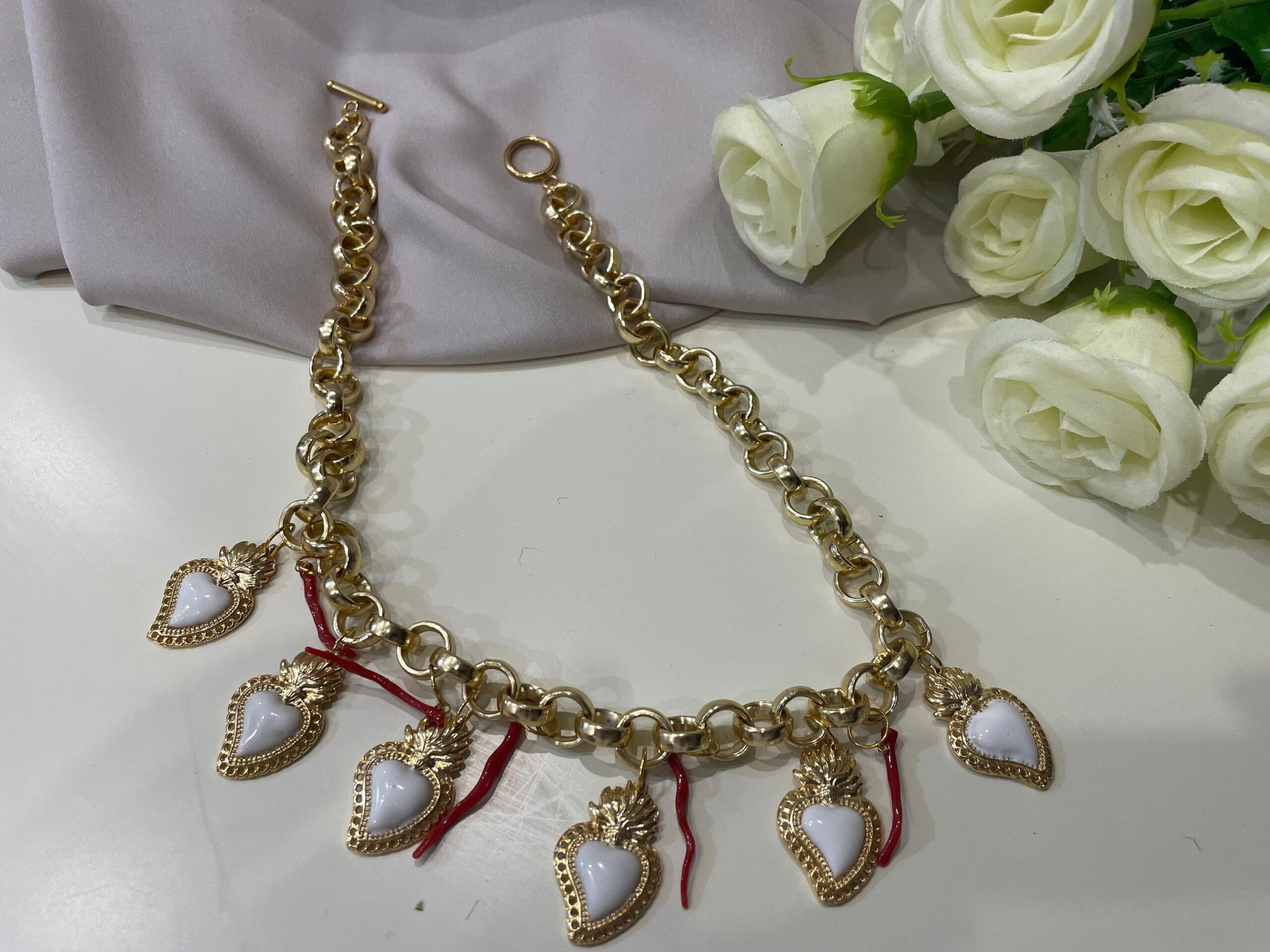 Composta da catena rolò a maglie larghe in Alluminio anallergico con sei Cuori sacri in Zama smaltati a fuoco di colore bianco e rami di Corallo rosso di Trapani.