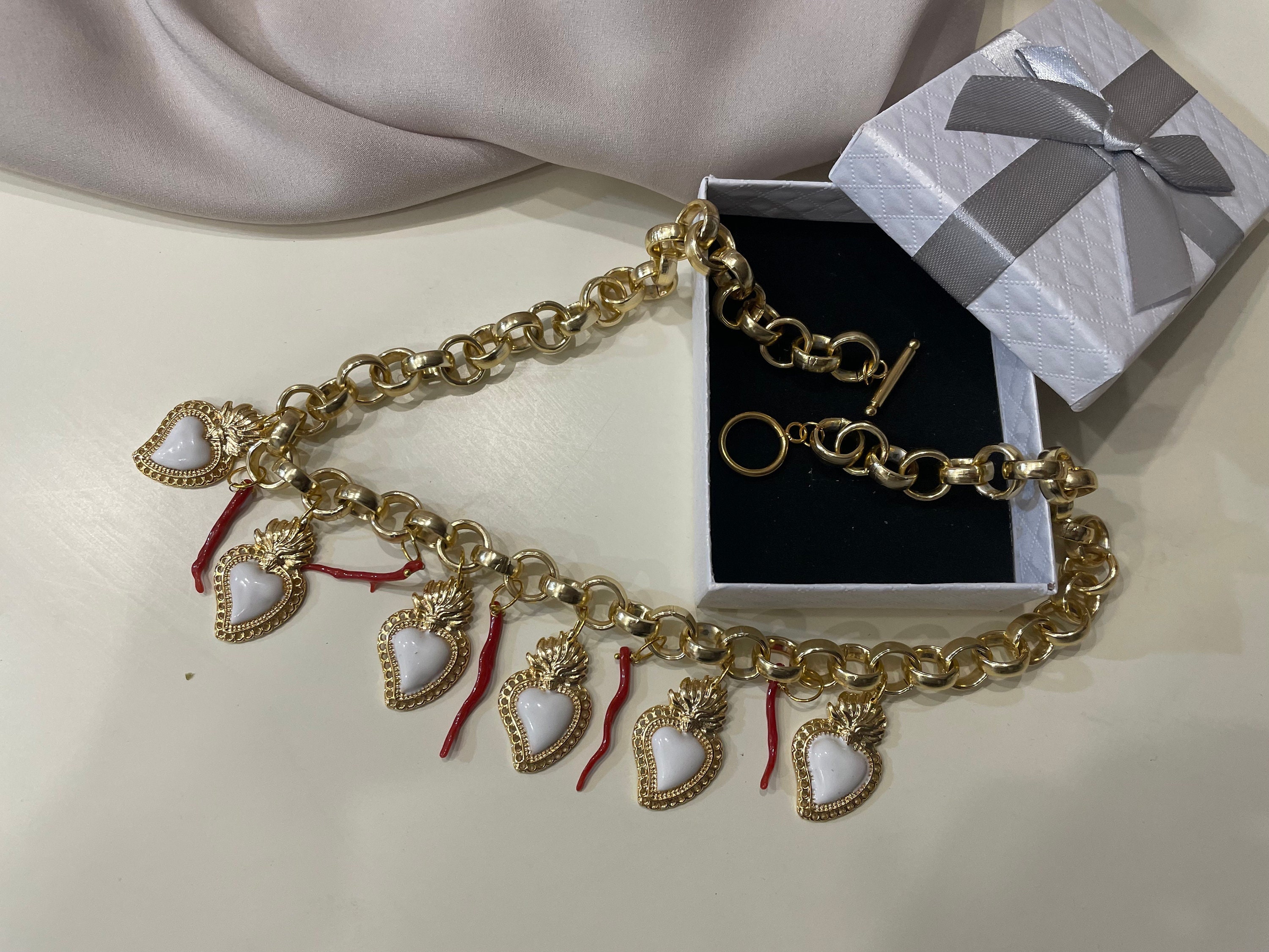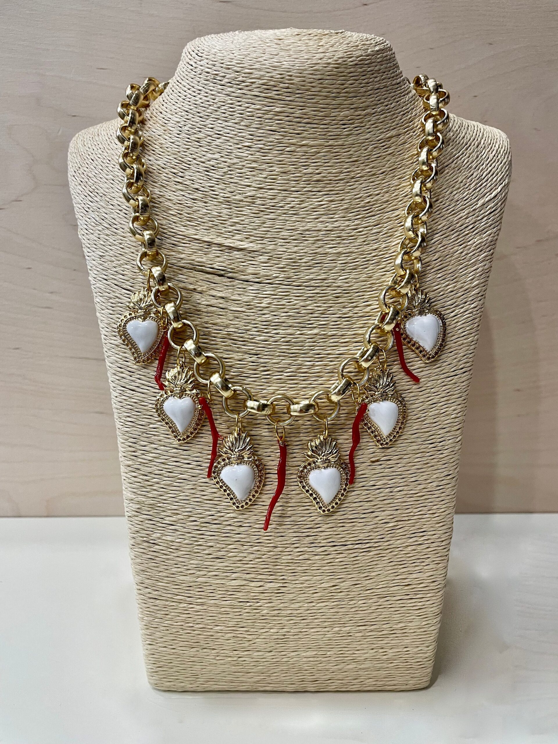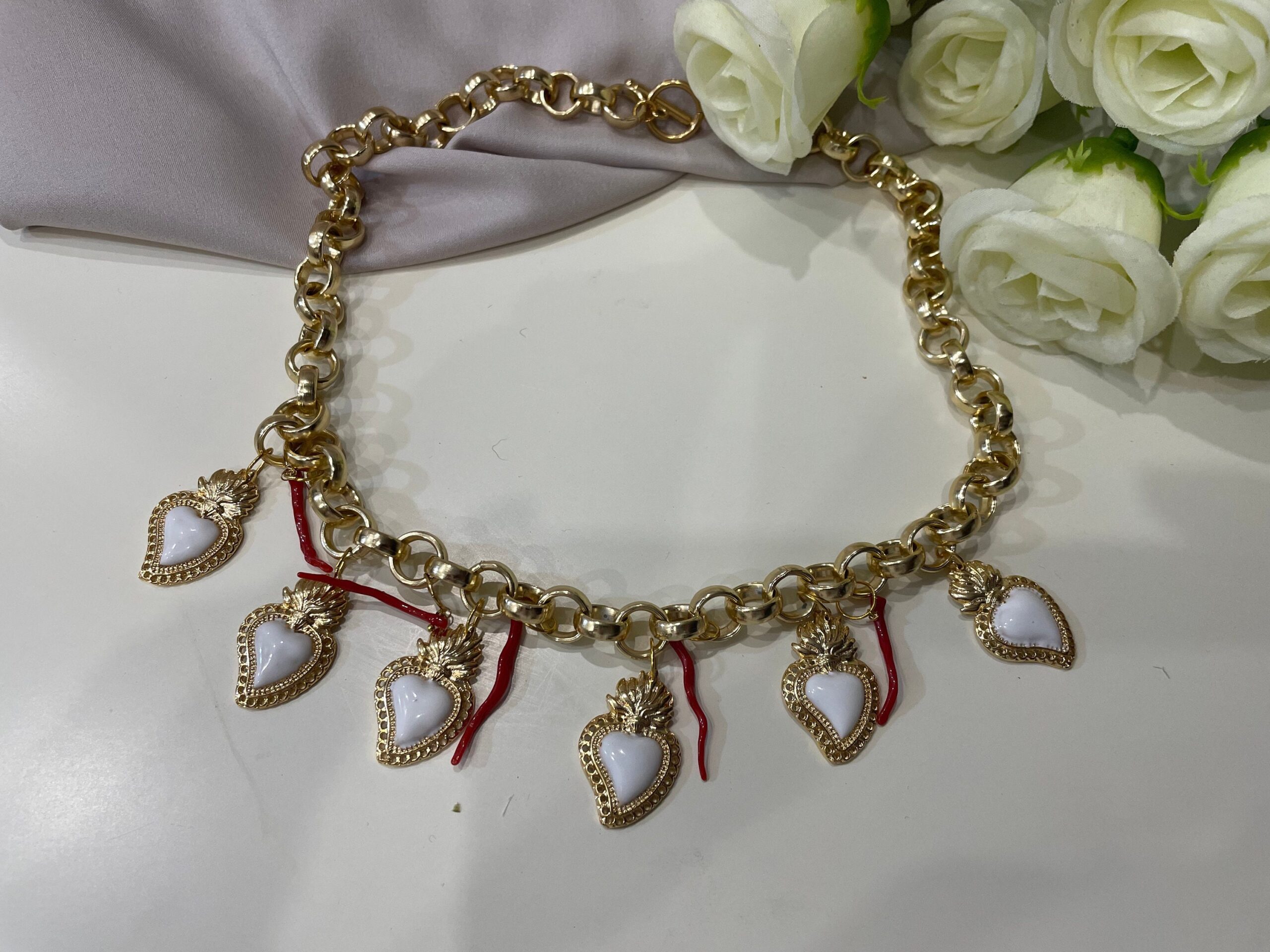 Composta da catena rolò a maglie larghe in Alluminio anallergico con sei Cuori sacri in Zama smaltati a fuoco di colore bianco e rami di Corallo rosso di Trapani.