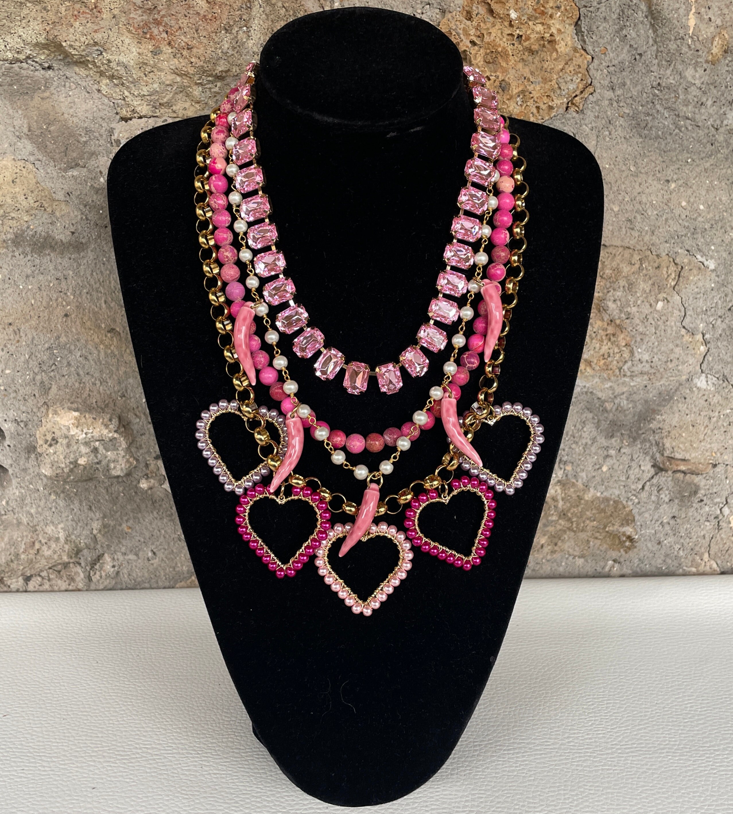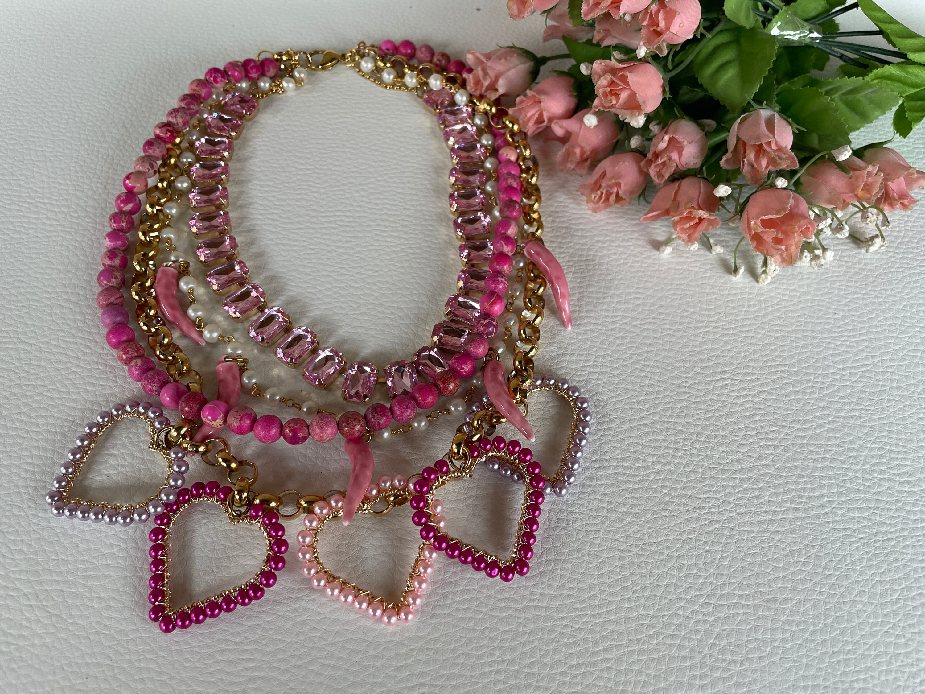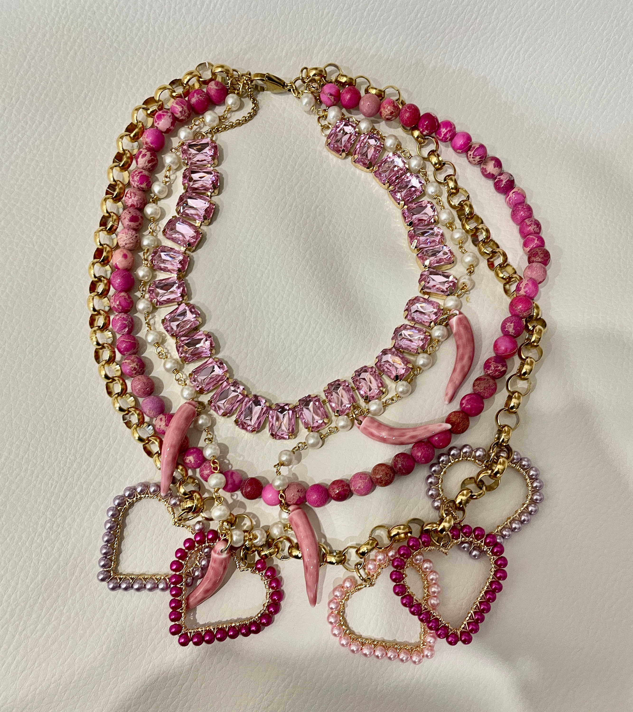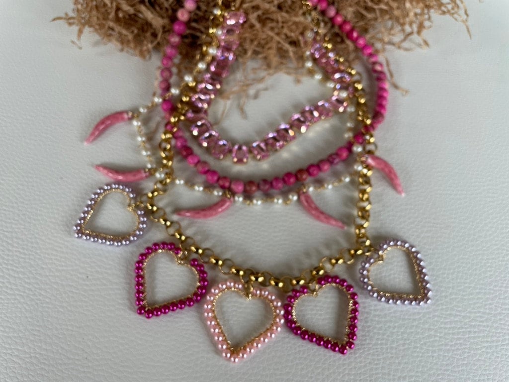 Cinque fili con cristalli rosa, acciaio inossidabile placcato oro, perle di diaspro rosa, catena rosario di perle maiorca bianche, corni rosa di ceramica di Caltagirone e cuori di perle sintetiche con colori assortiti.