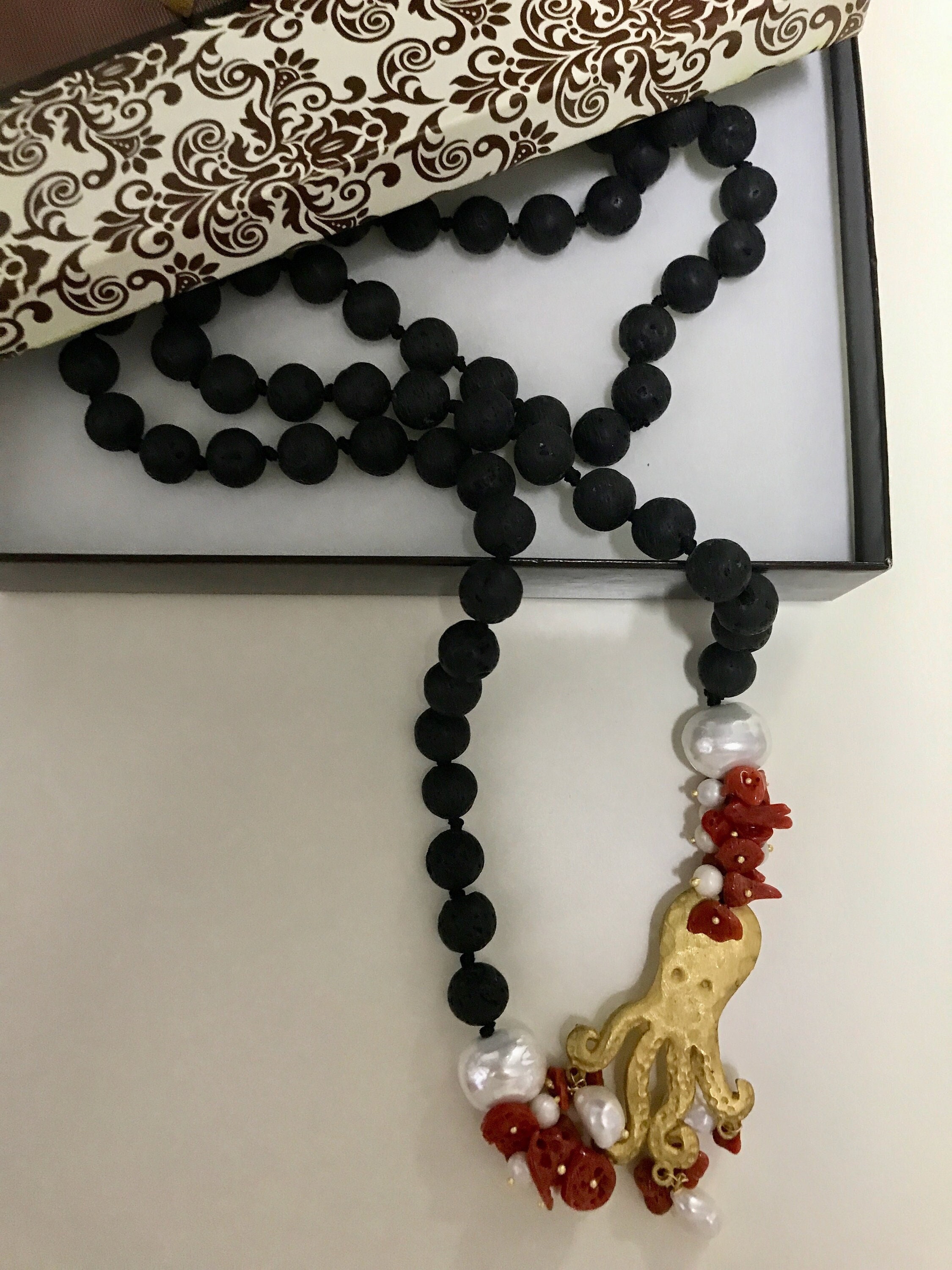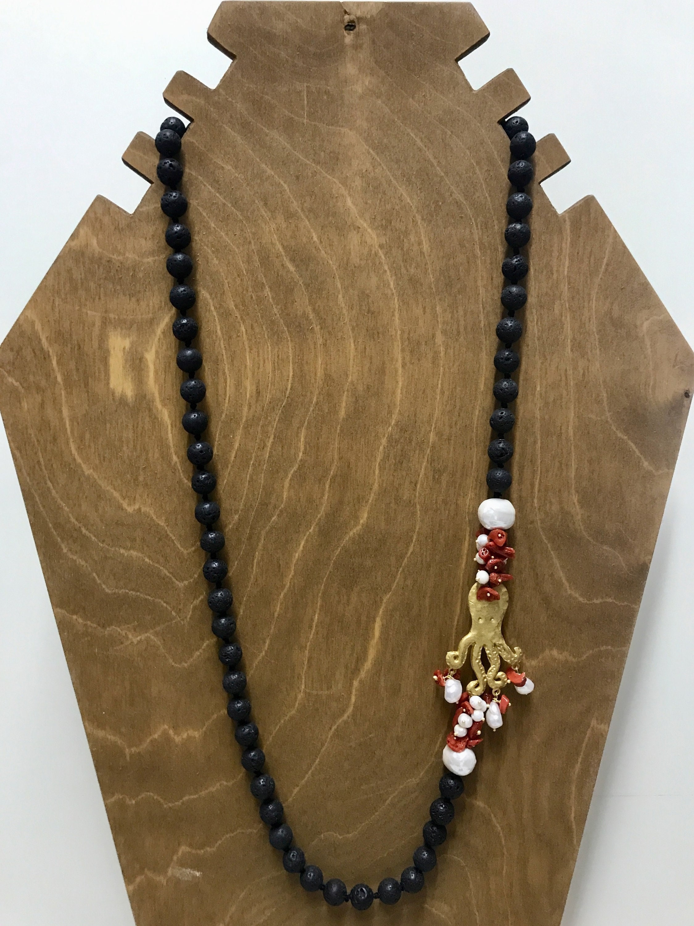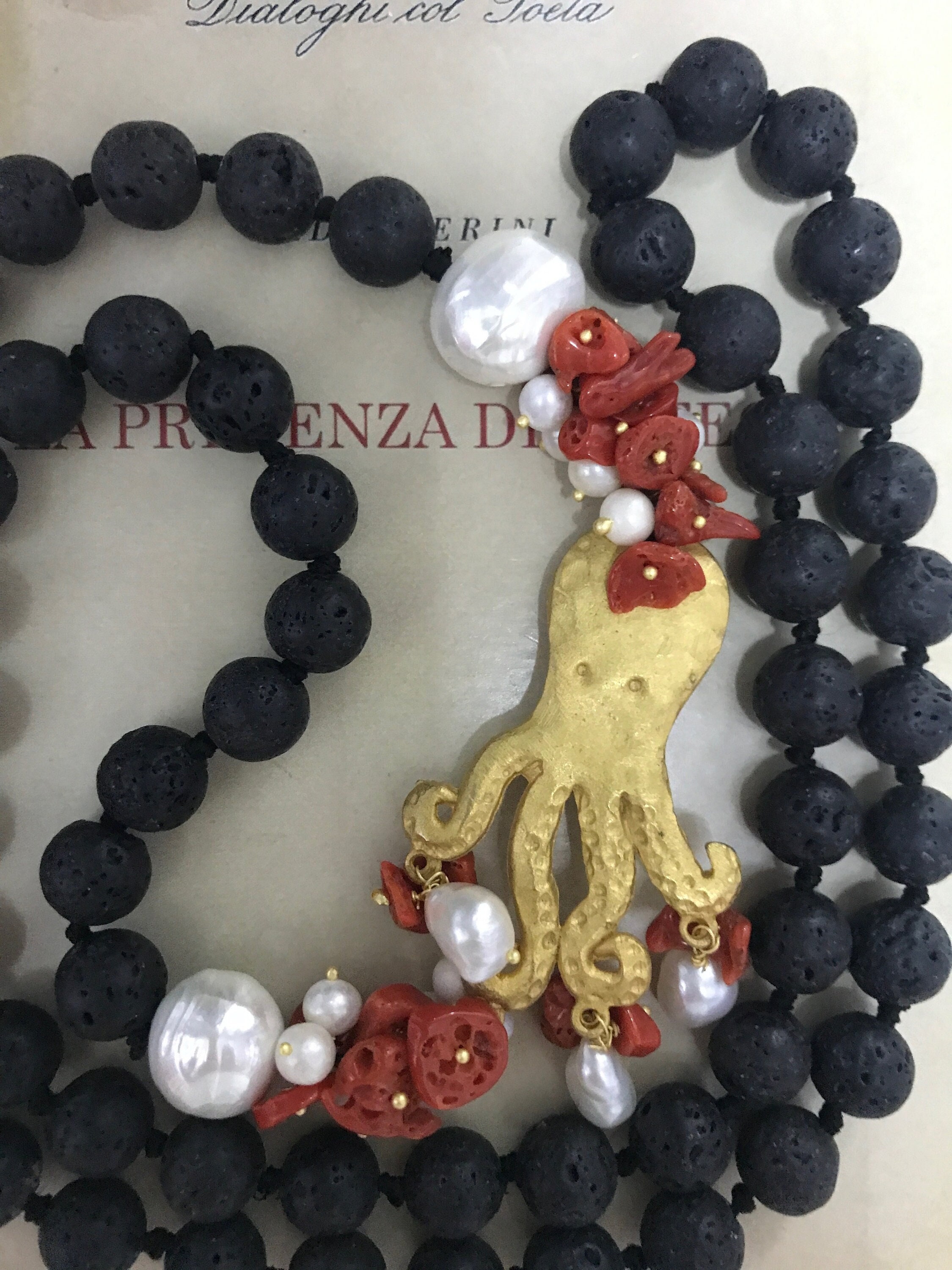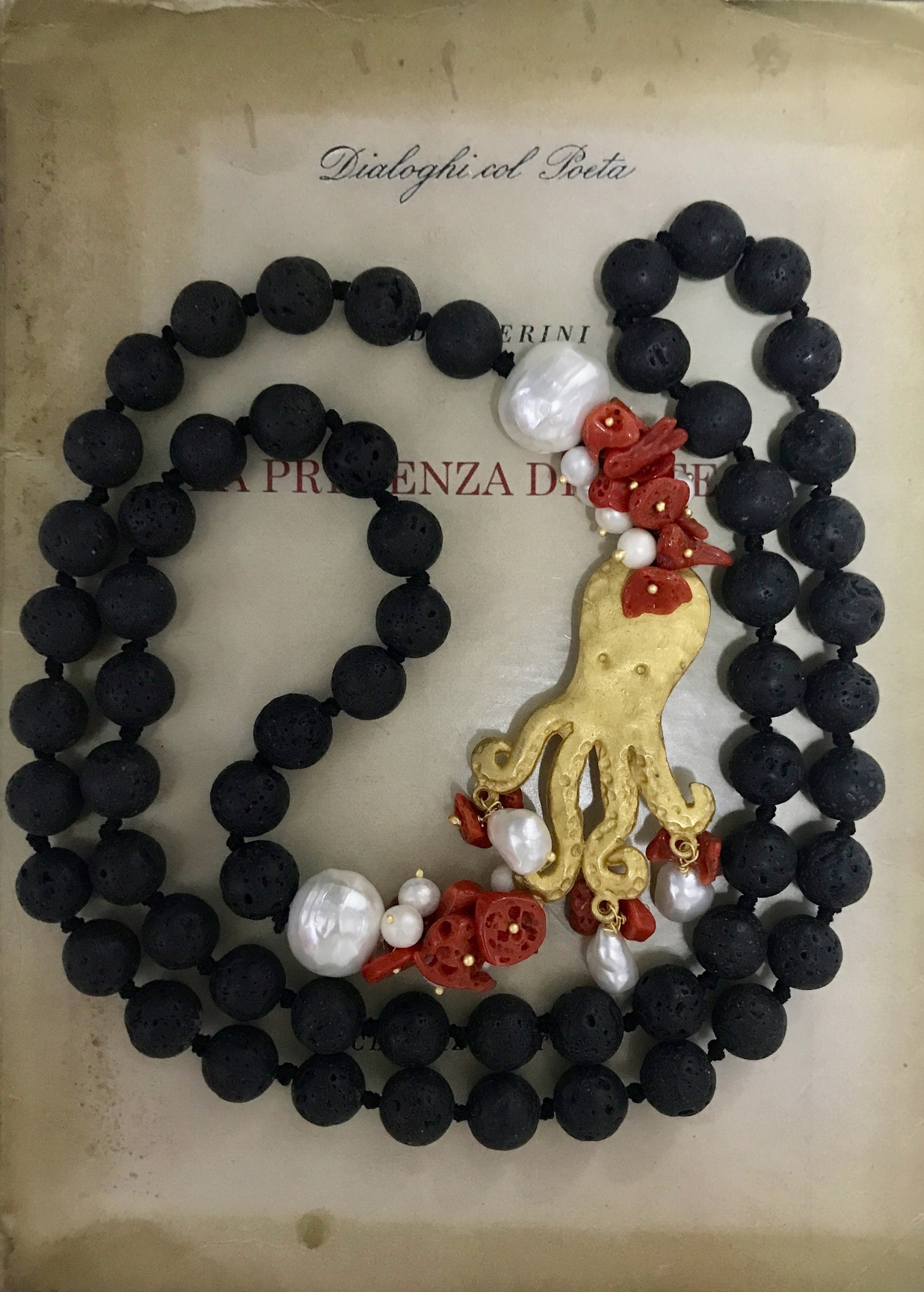 Realizzata con filo di perle di lava, singolarmente annodate, e interrotta da un intreccio di perle di fiume, chips di corallo con polipo in zama.