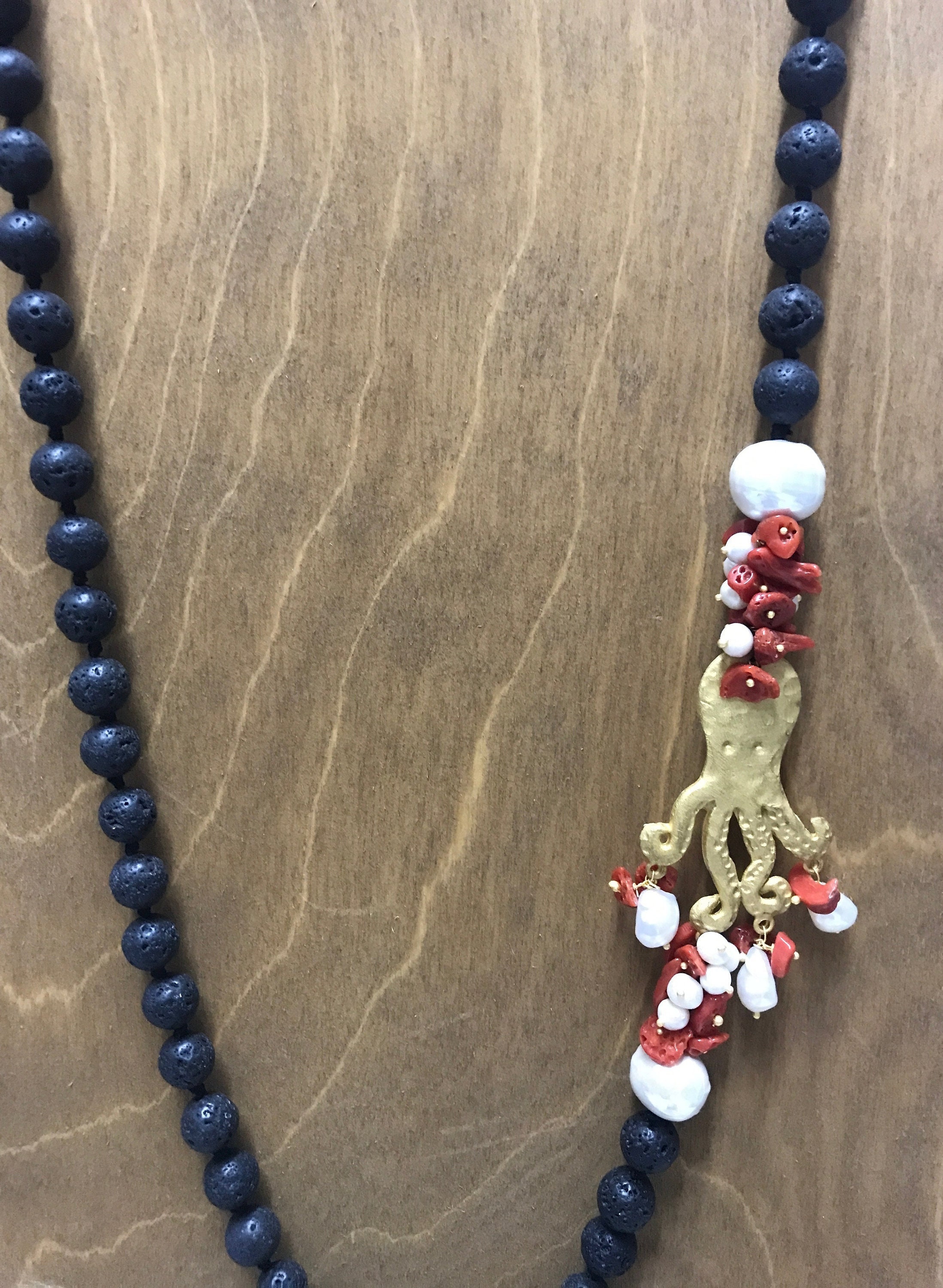 Collana composita con filo di perle di lava, perle di fiume, corallo e polipo in zama.