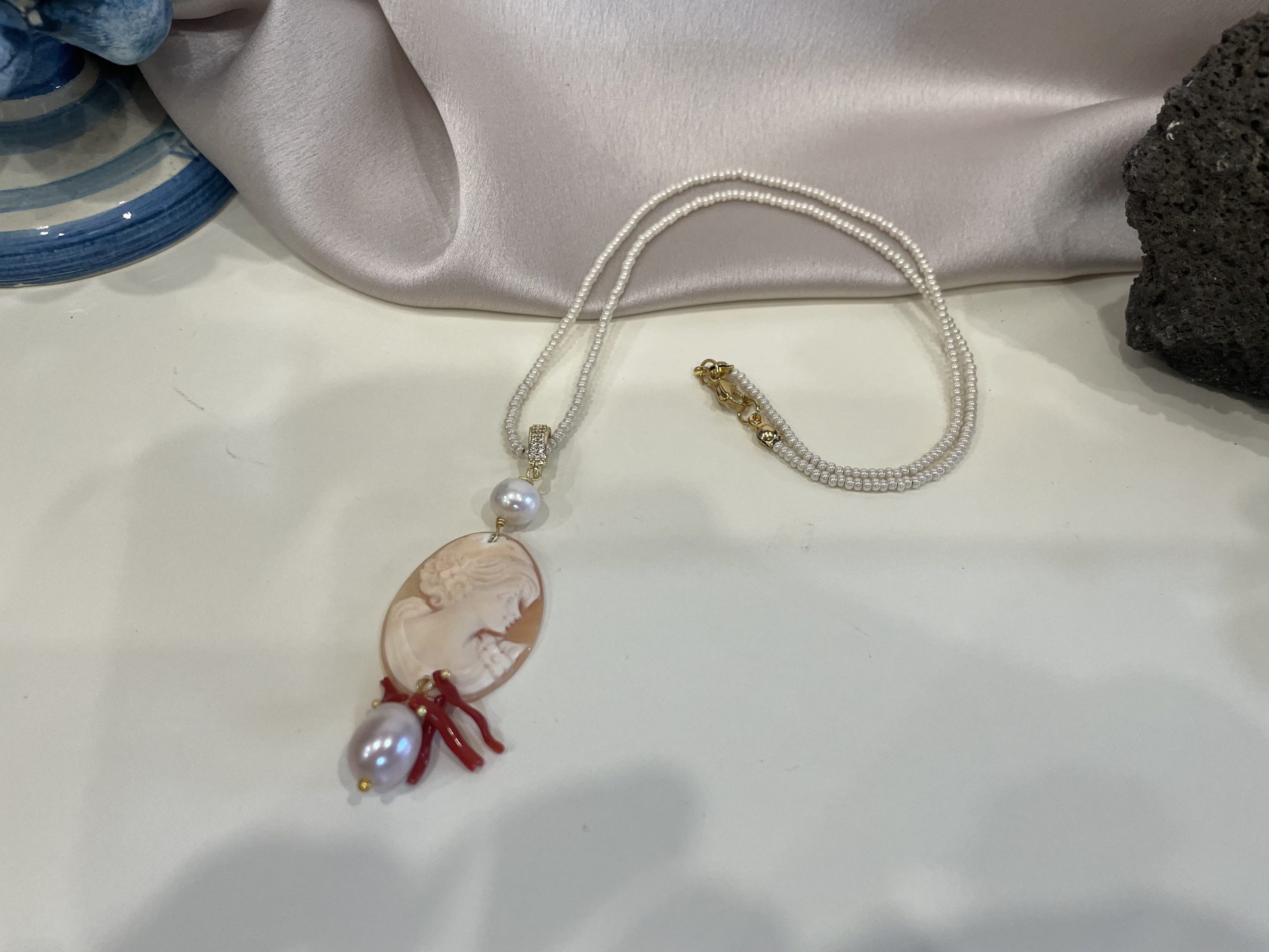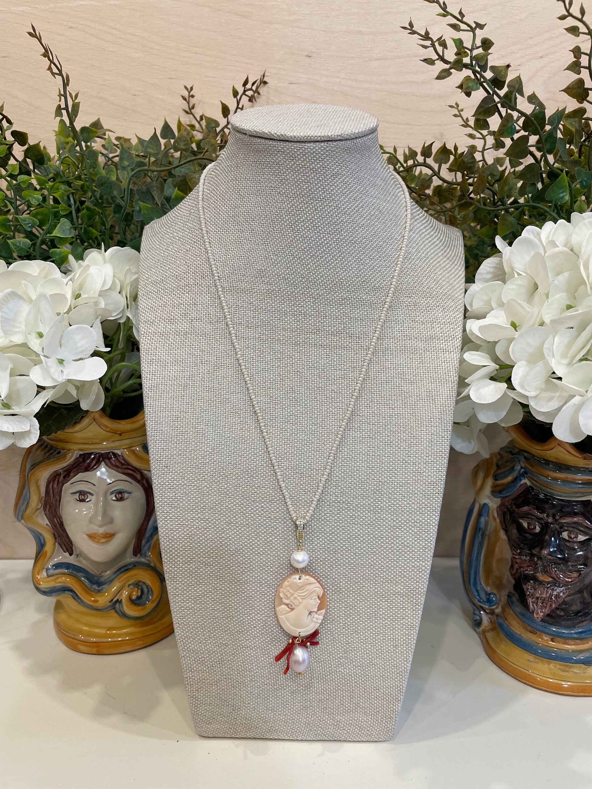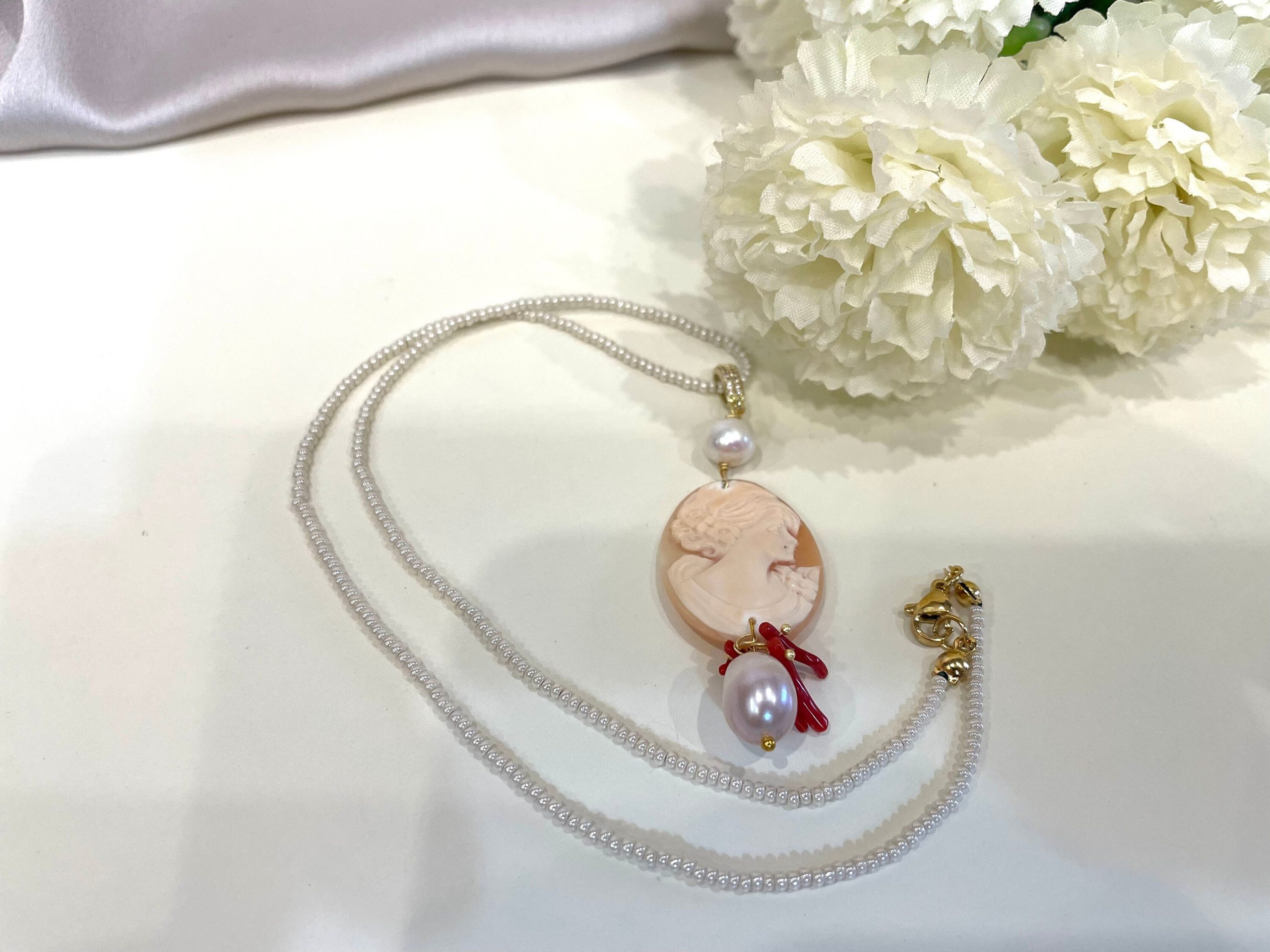 Un bel Cammeo ovale con volto femminile come pendente impreziosito da perle di fiume e rametti di corallo autentico.