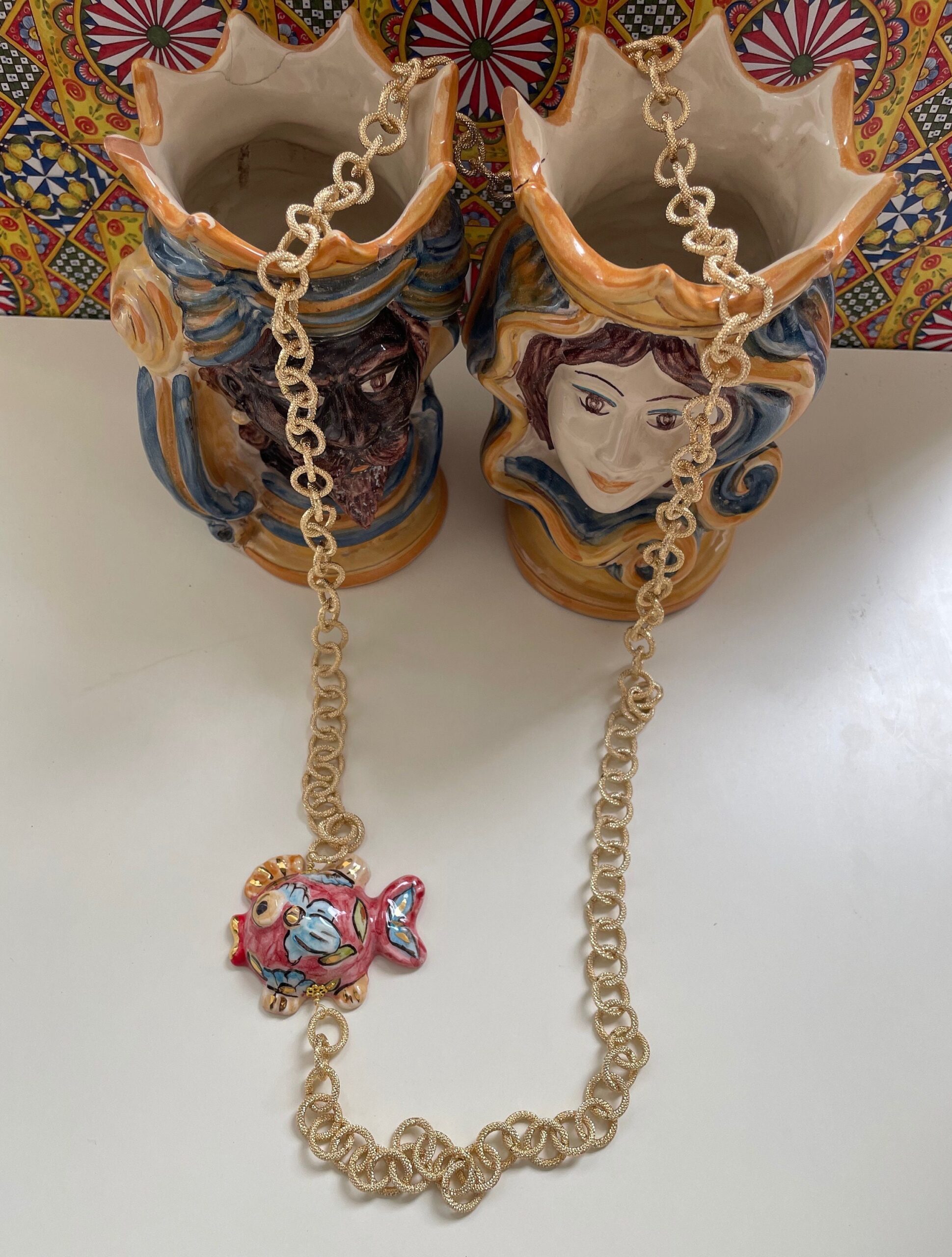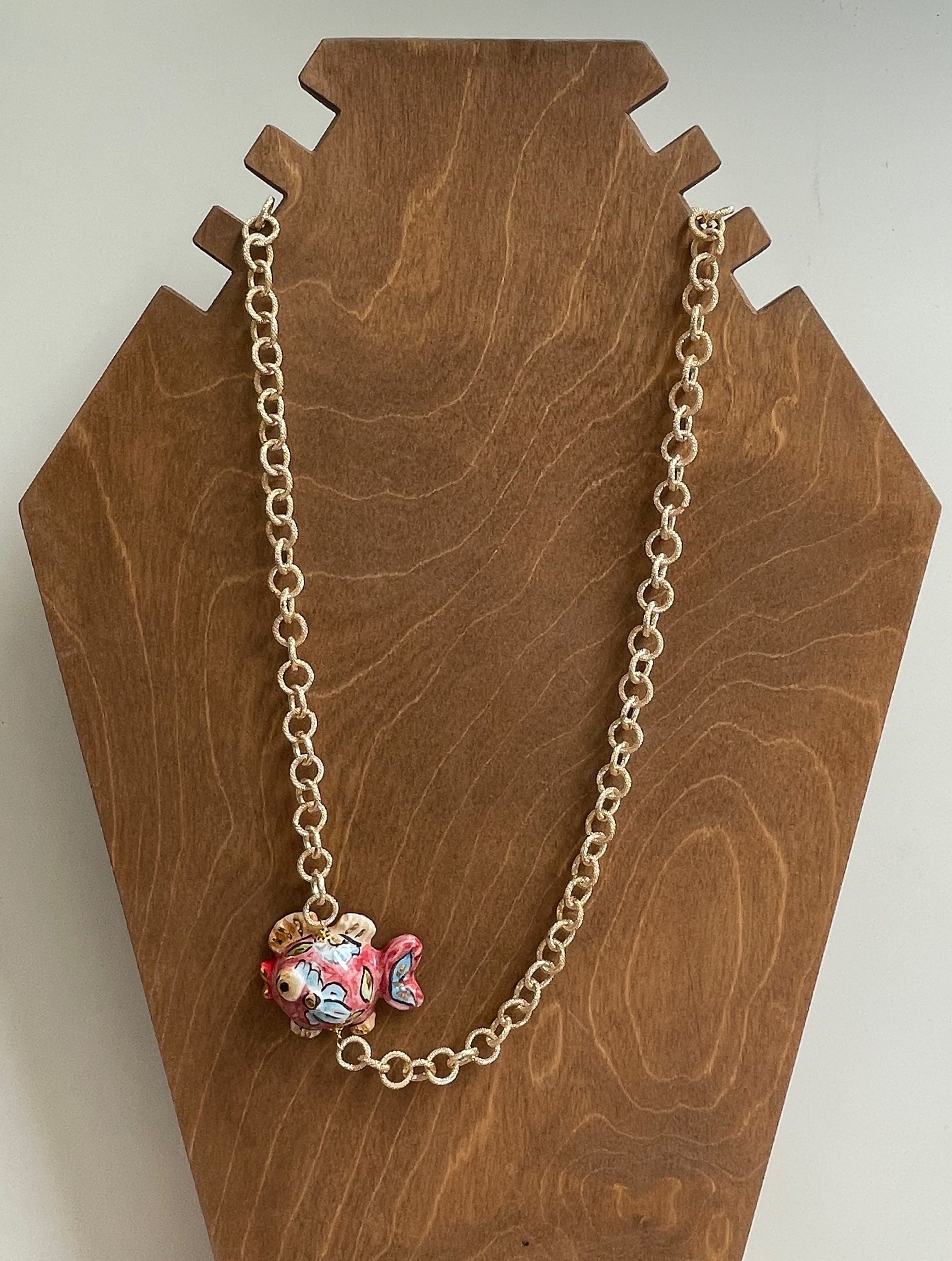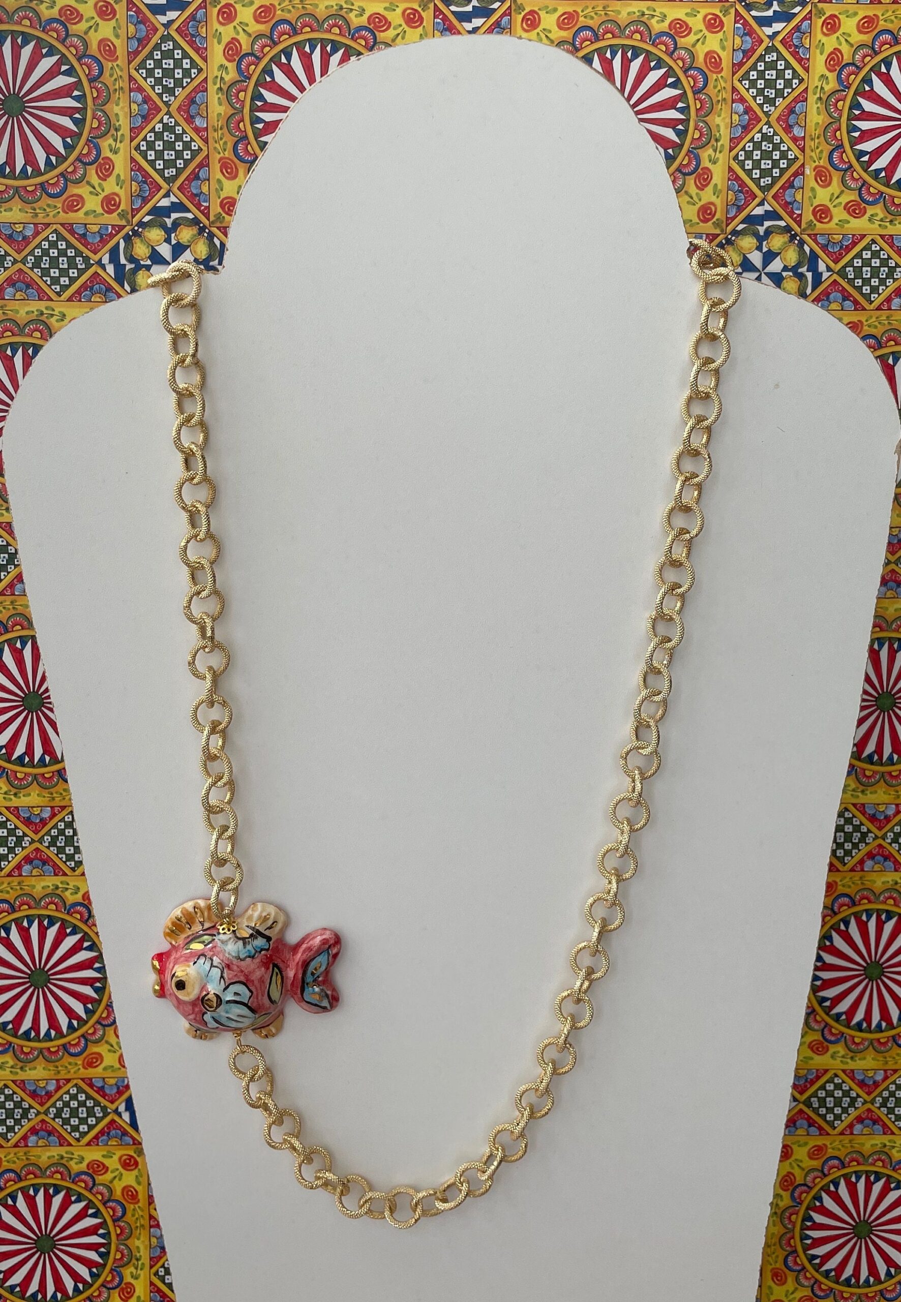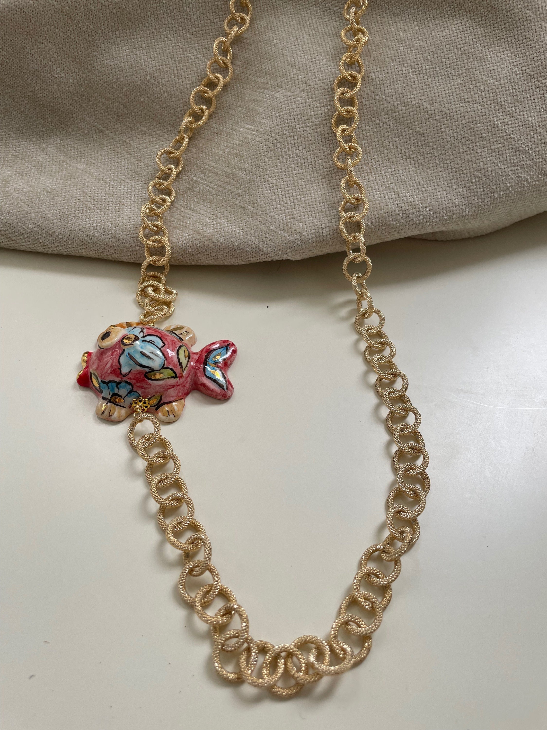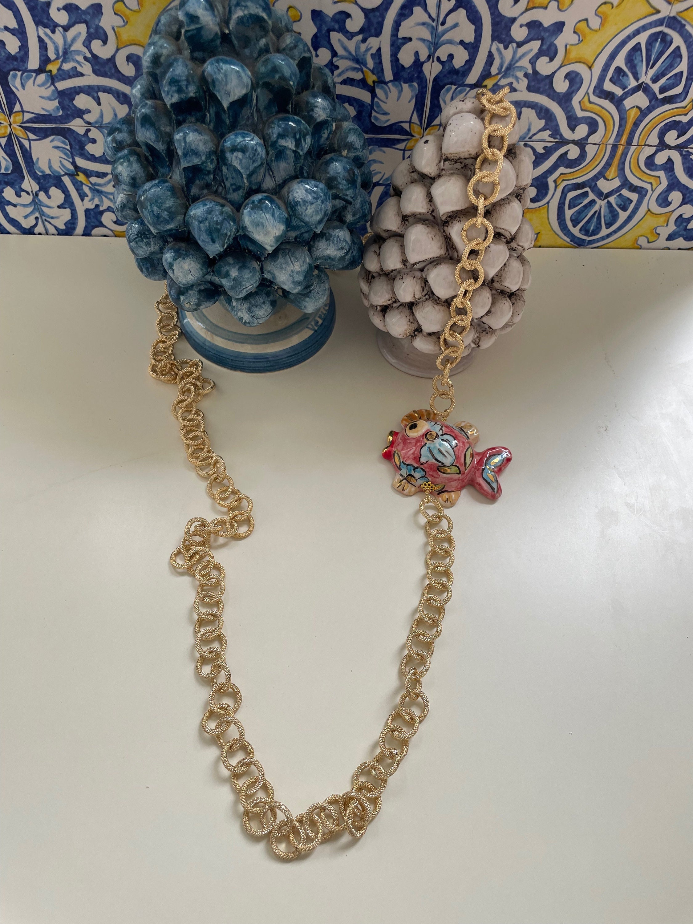 Realizzata con catena in alluminio anallergico satinato a maglia larga e Pesce in Ceramica di Caltagirone dipinto a mano.