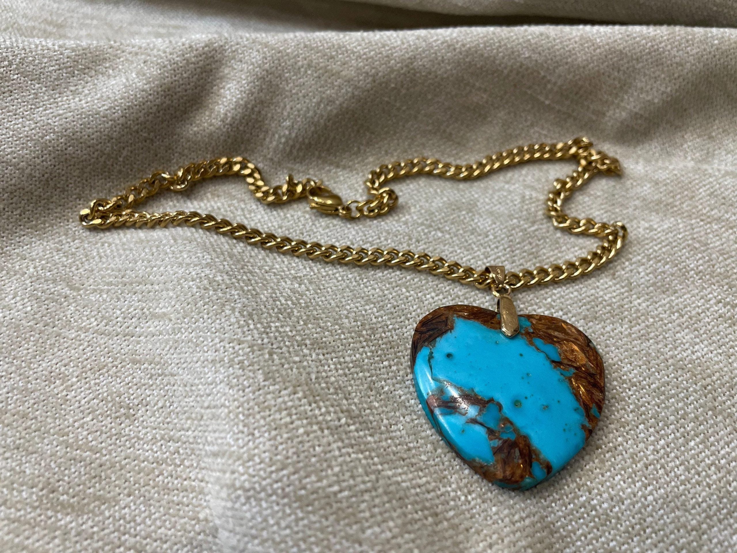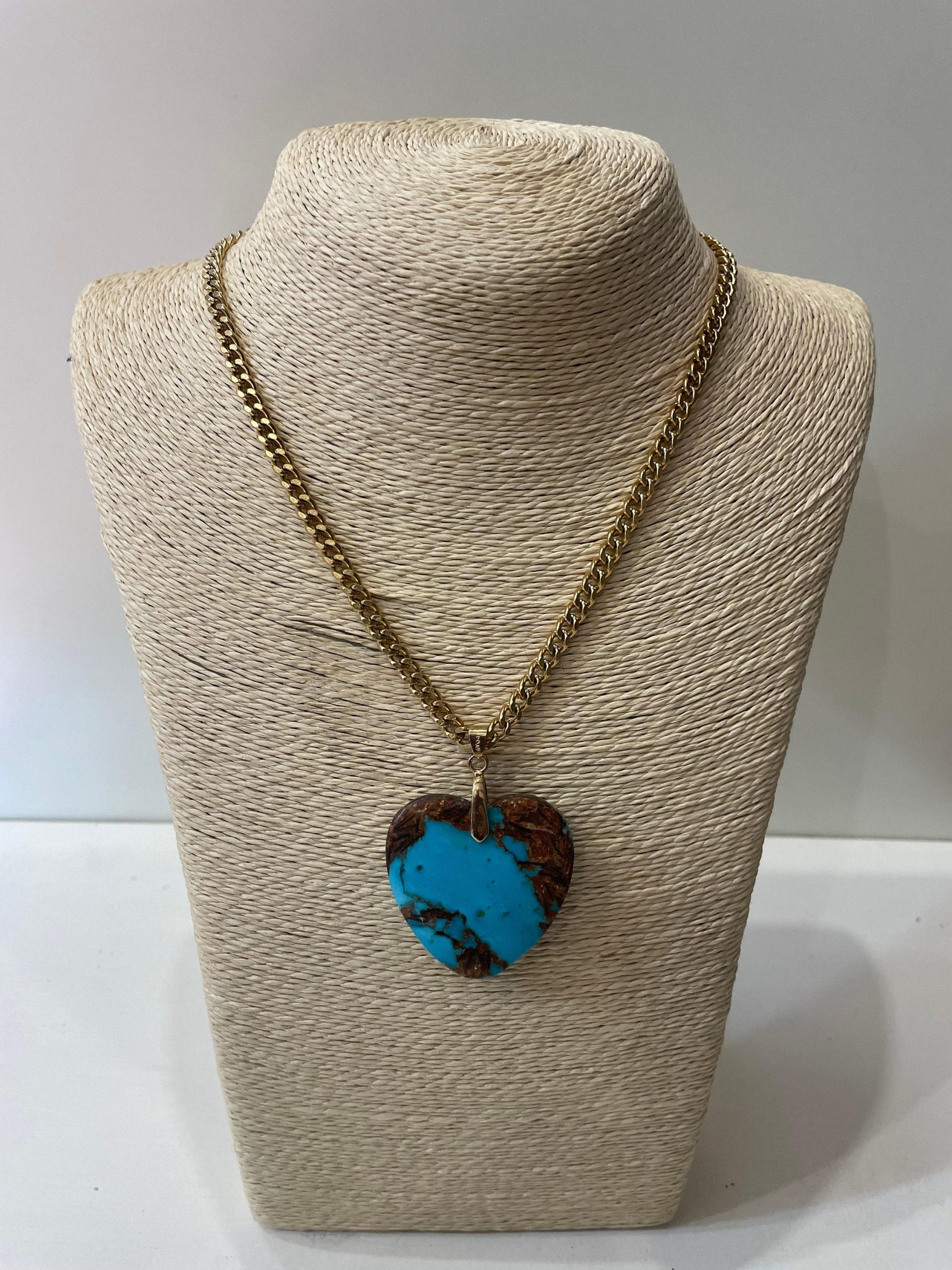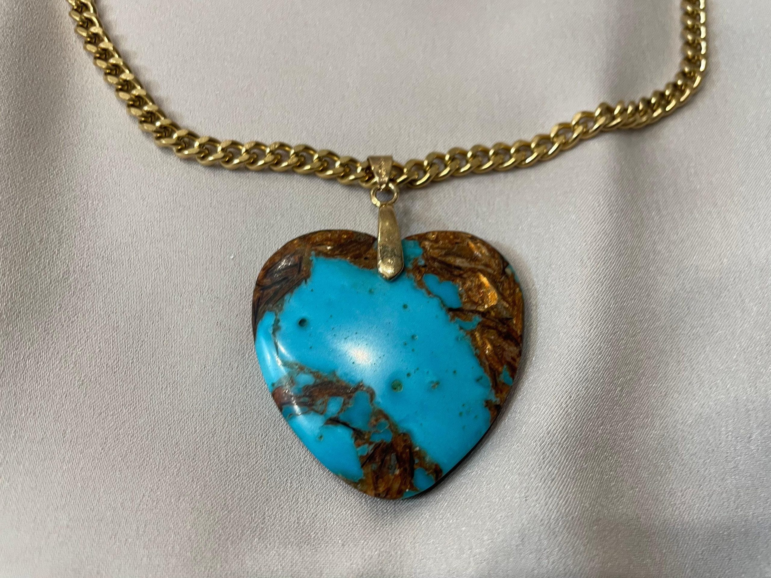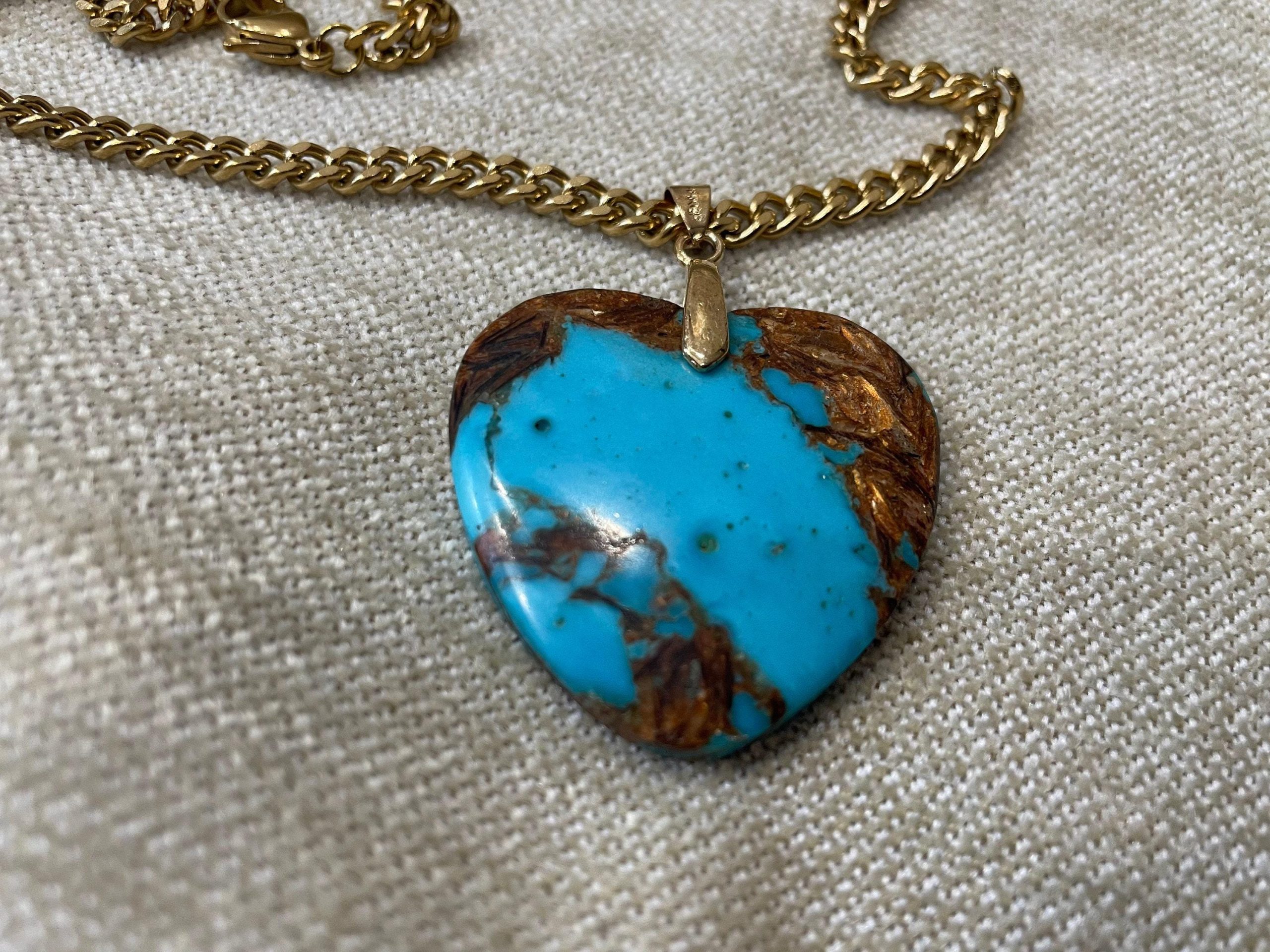 Realizzata a mano con catena di acciaio inossidabile placcato oro 14k e un grande pendente a forma di cuore realizzato con un mix di pasta di turchese e Bronzite.