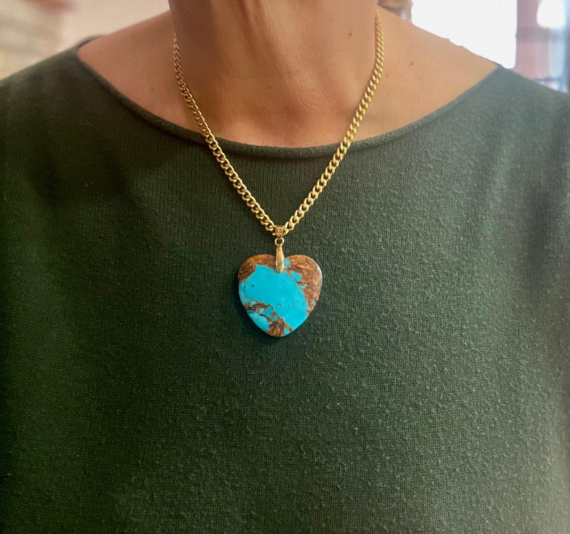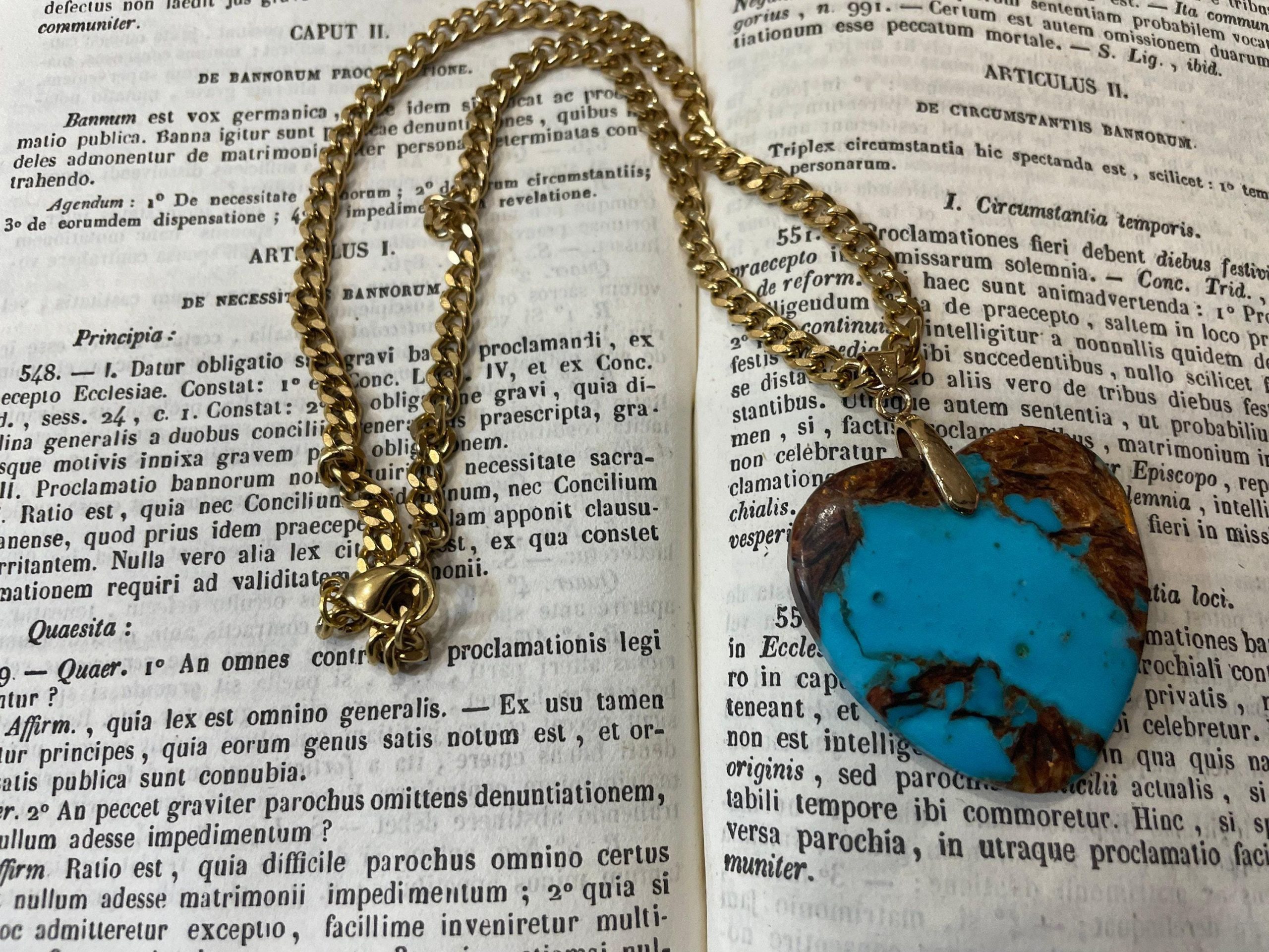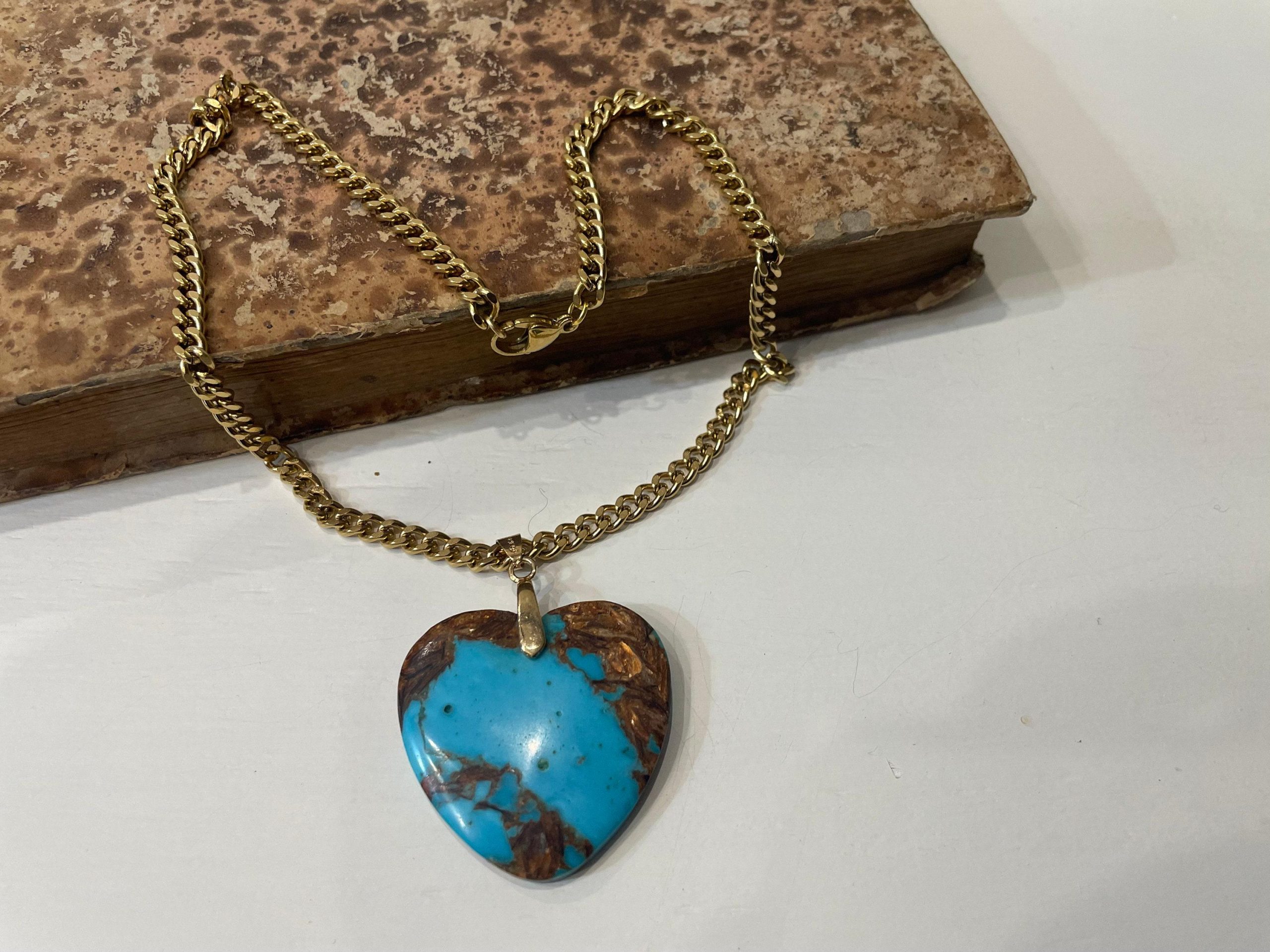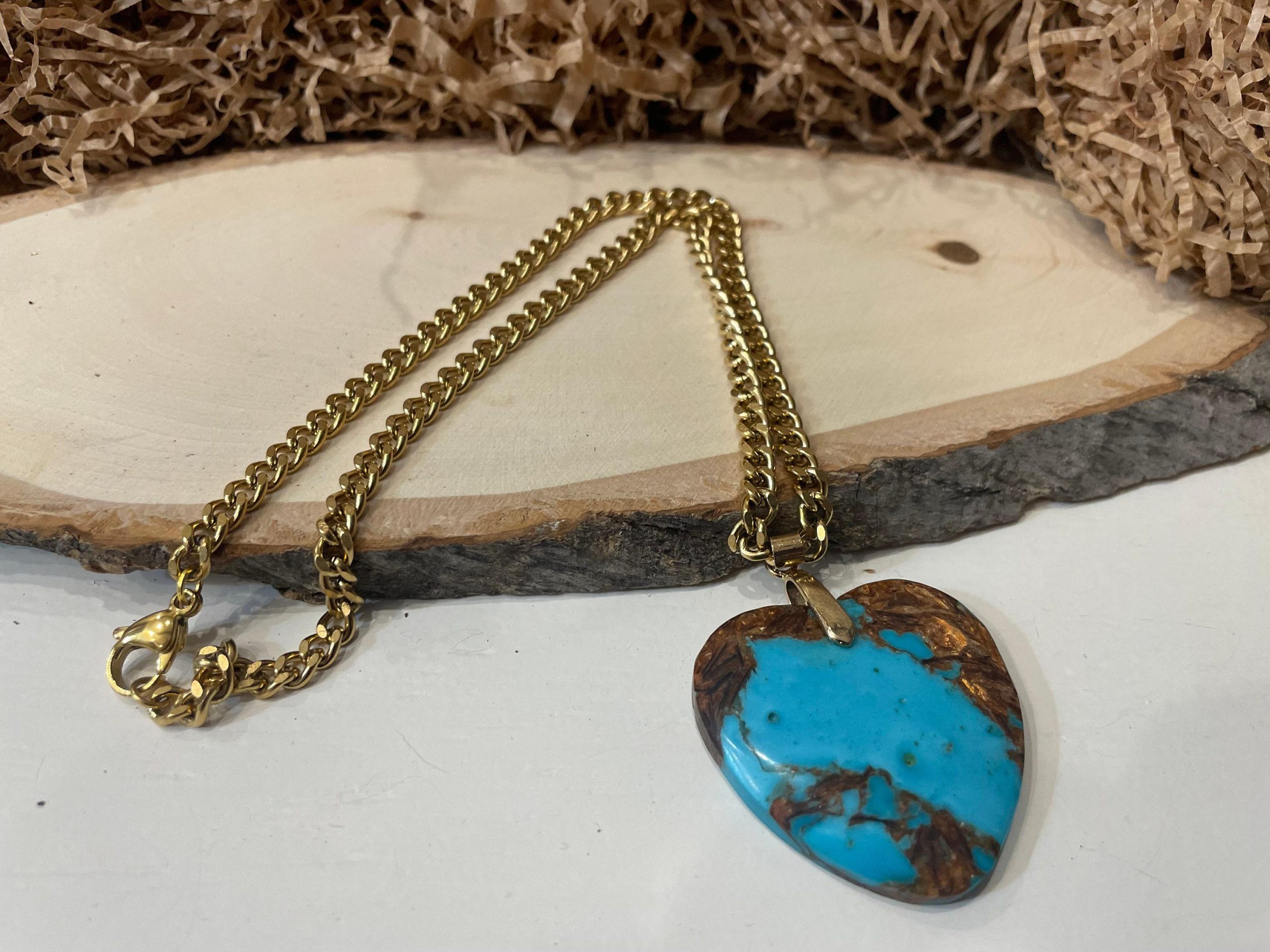 Realizzata a mano con catena di acciaio inossidabile placcato oro 14k e un grande pendente a forma di cuore realizzato con un mix di pasta di turchese e Bronzite.