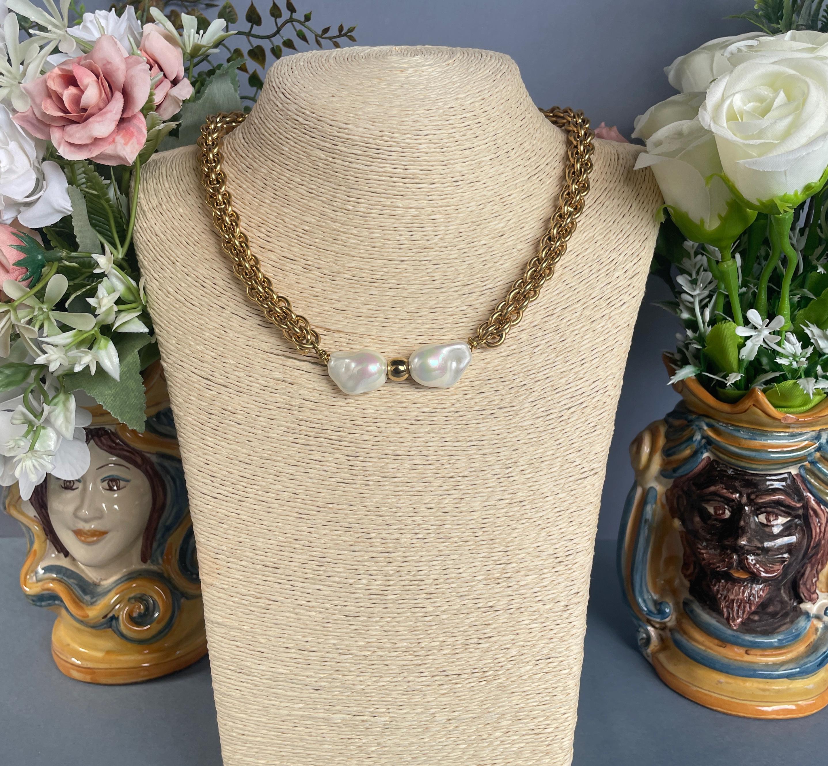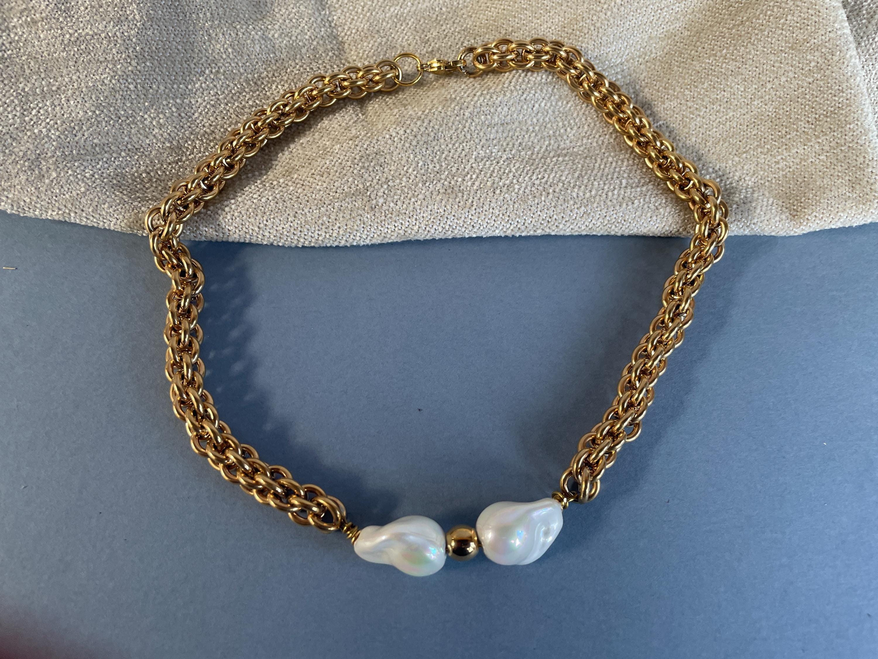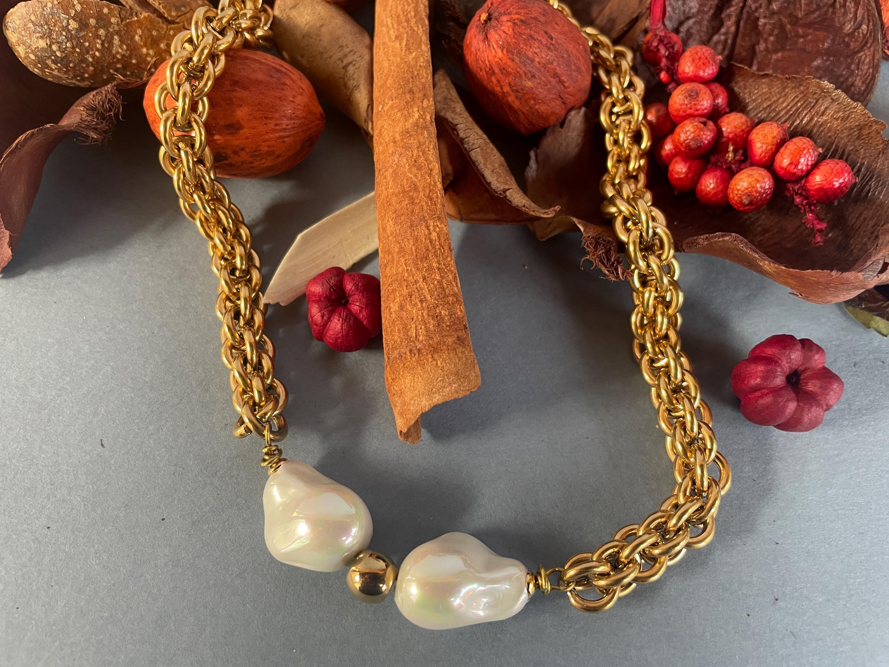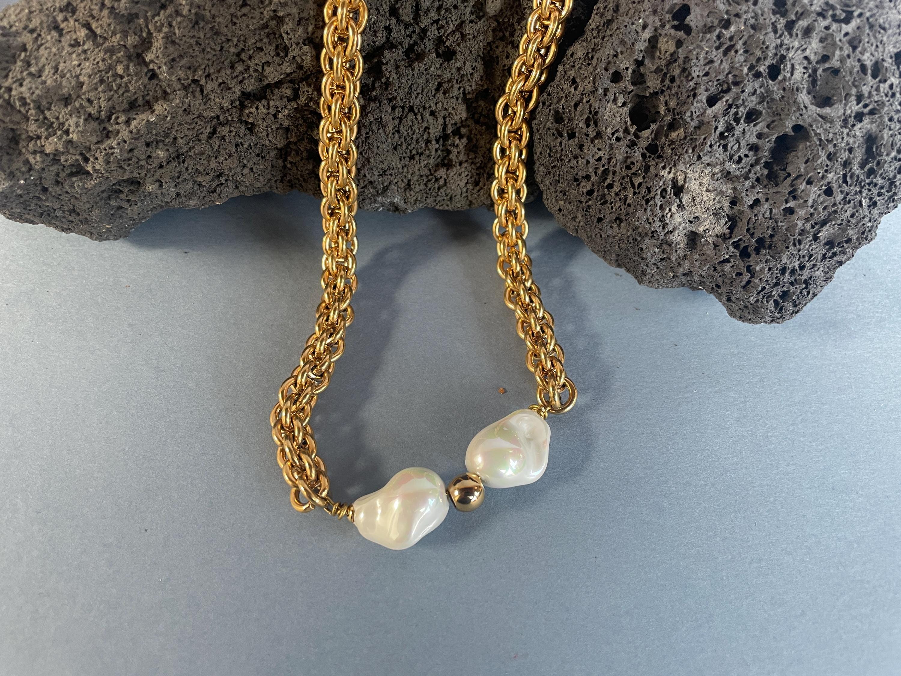 Collana con catena grossa di acciaio inox e oro, doppia perla Maiorca centrale, collana oro e perle scaramazza, regalo per lei.