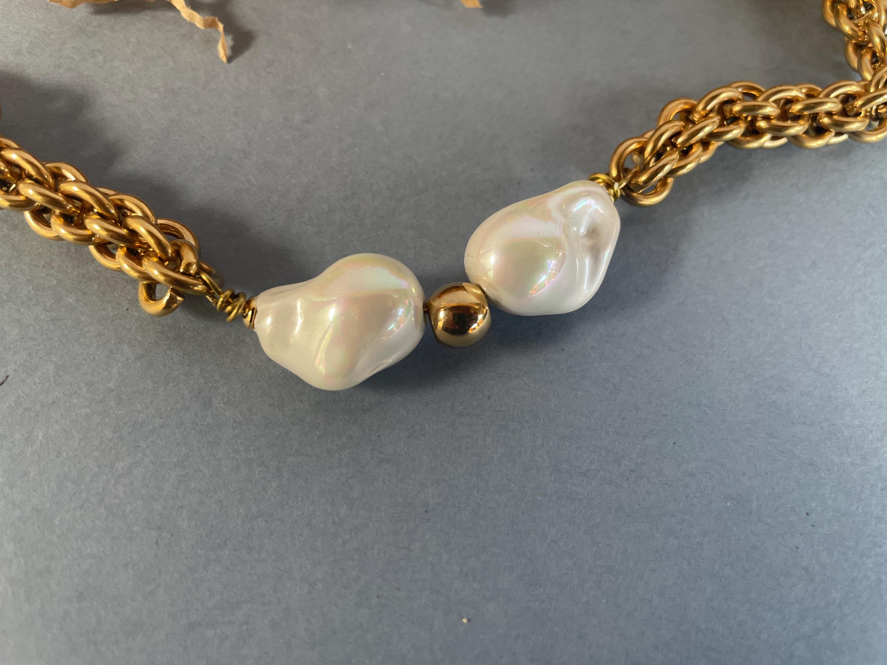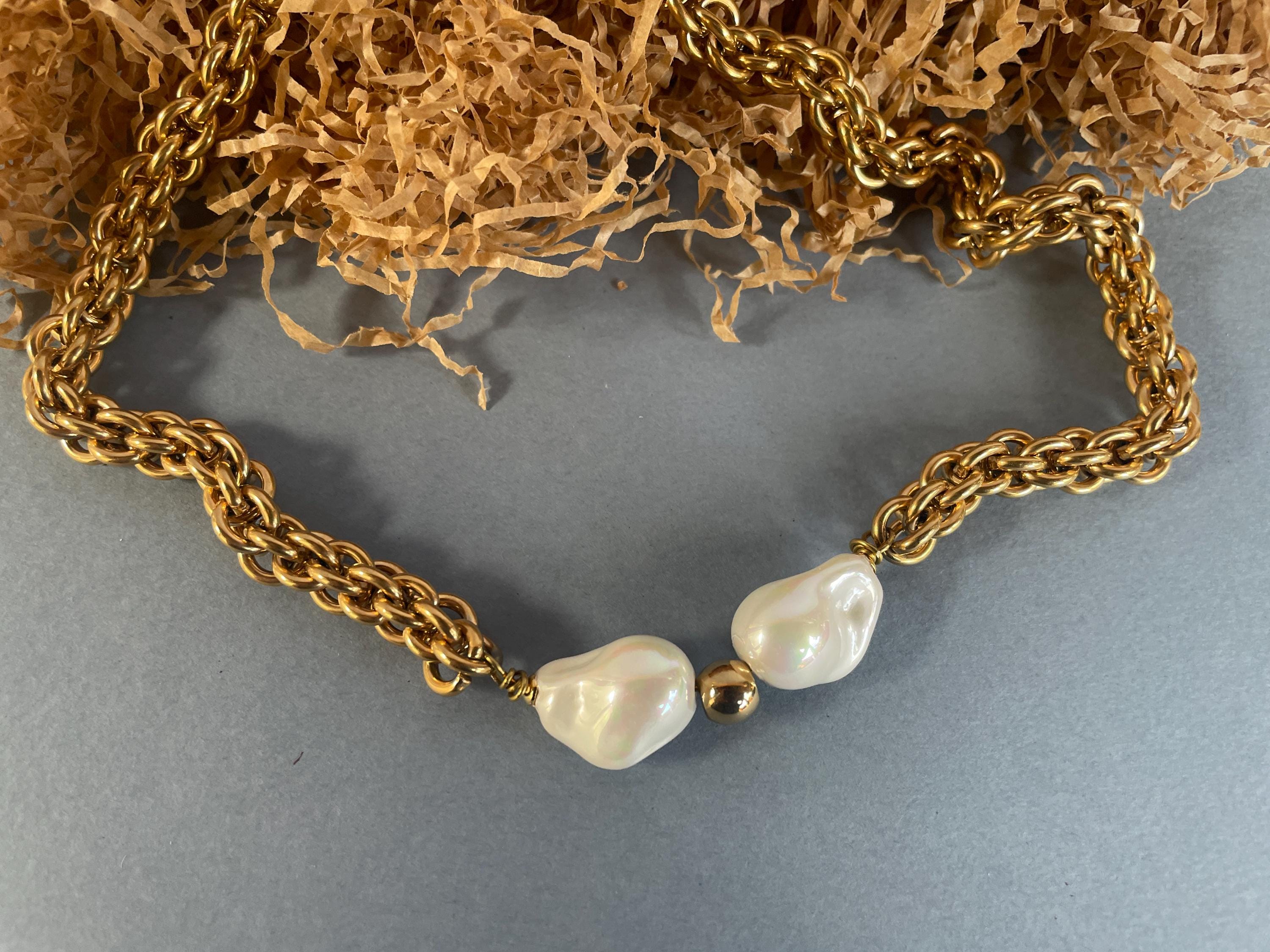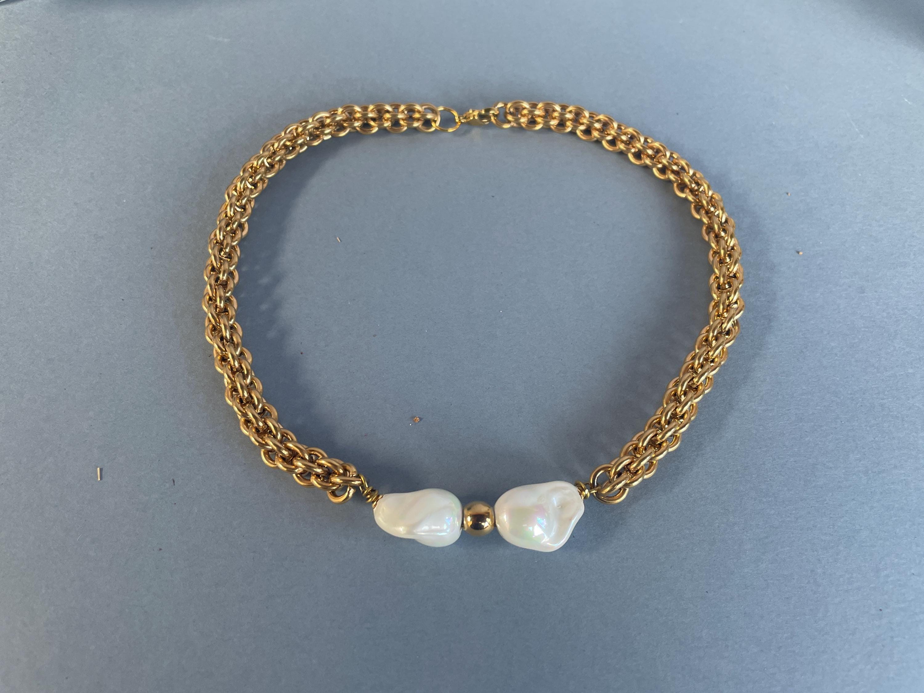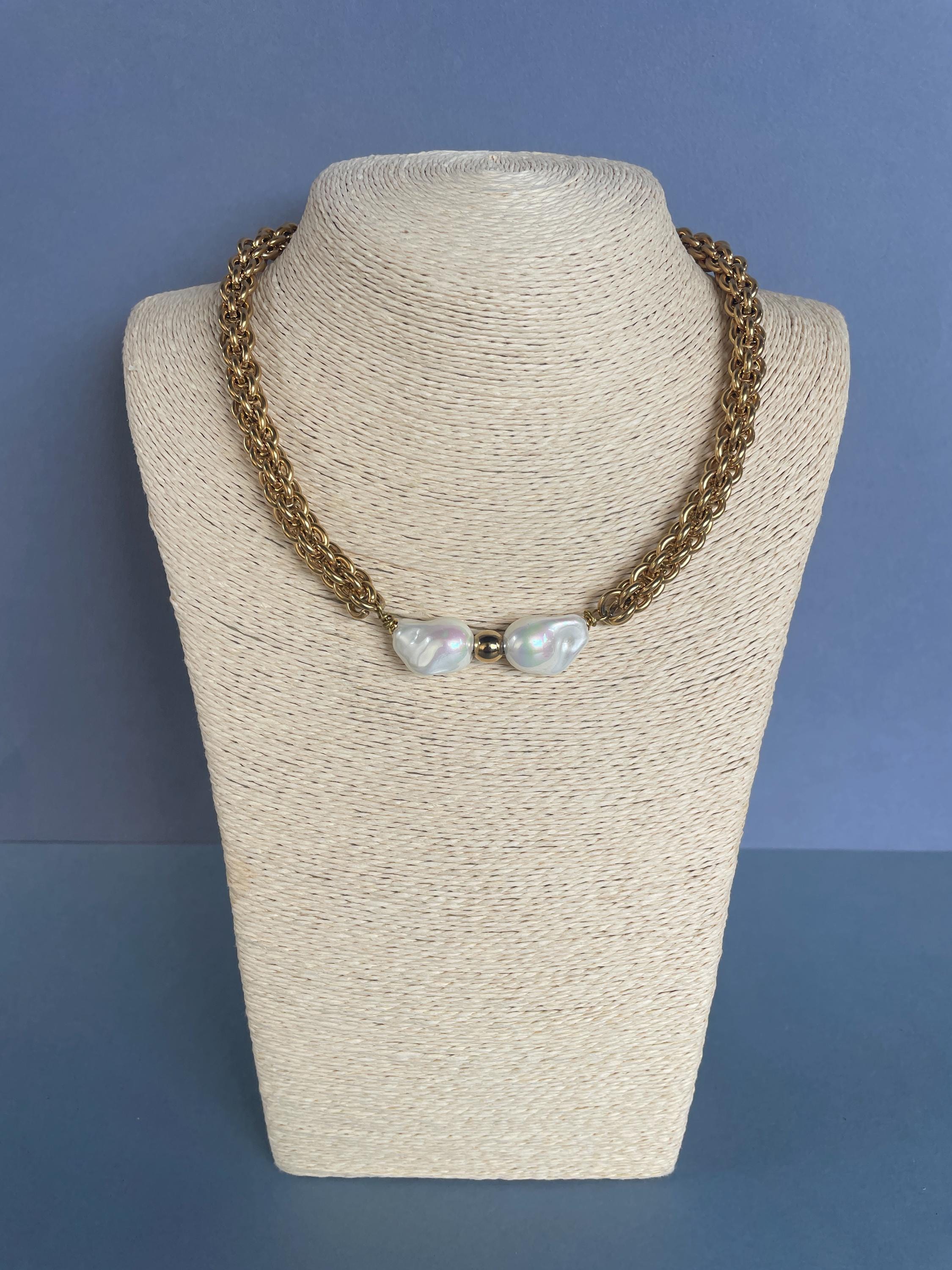 Collana con catena grossa di acciaio inox e oro, doppia perla Maiorca centrale, collana oro e perle scaramazza, regalo per lei.