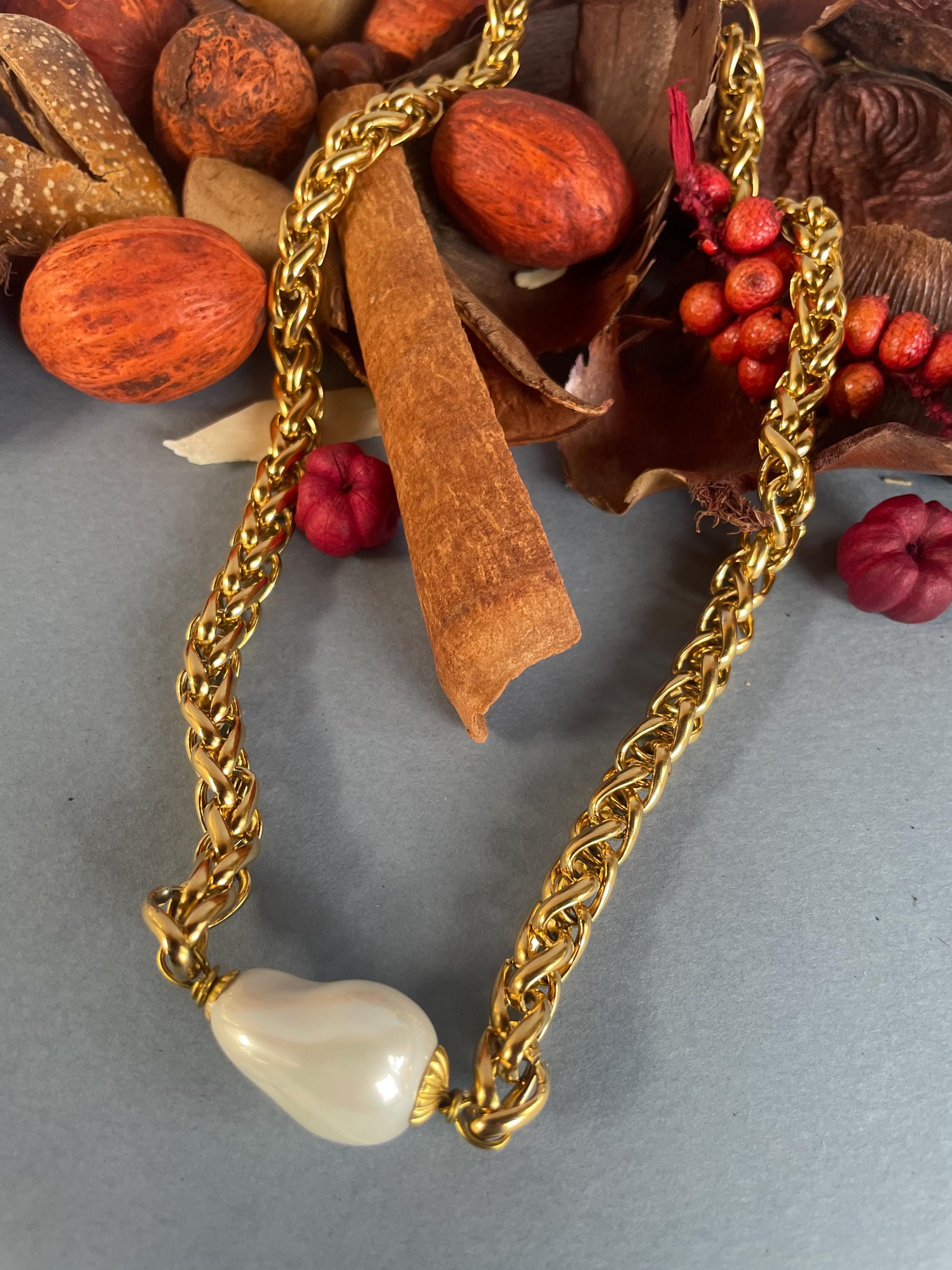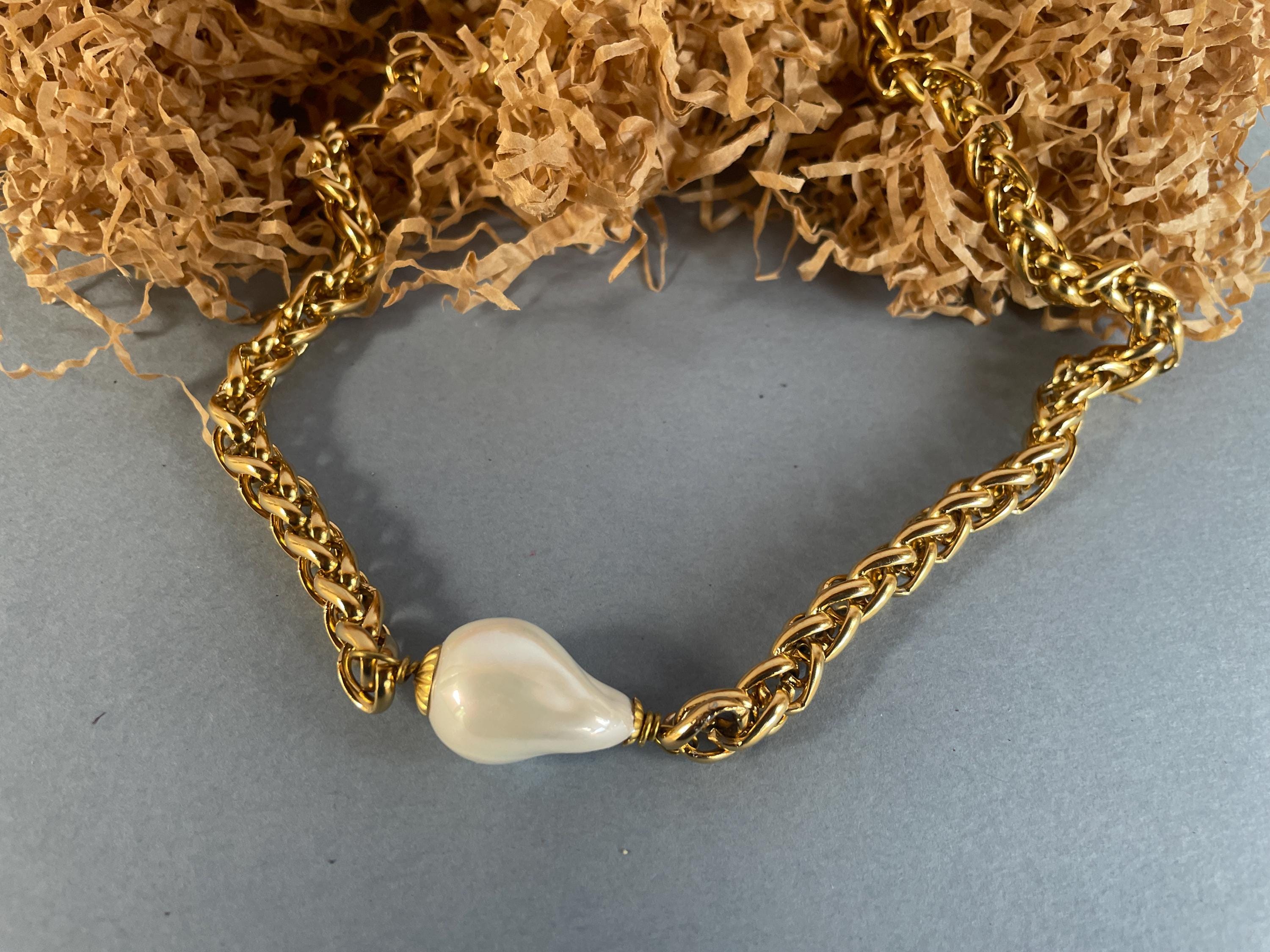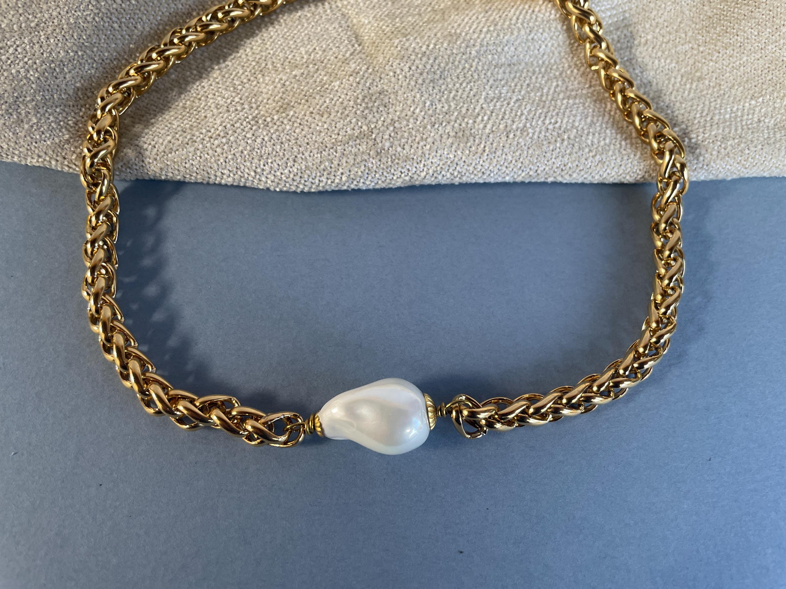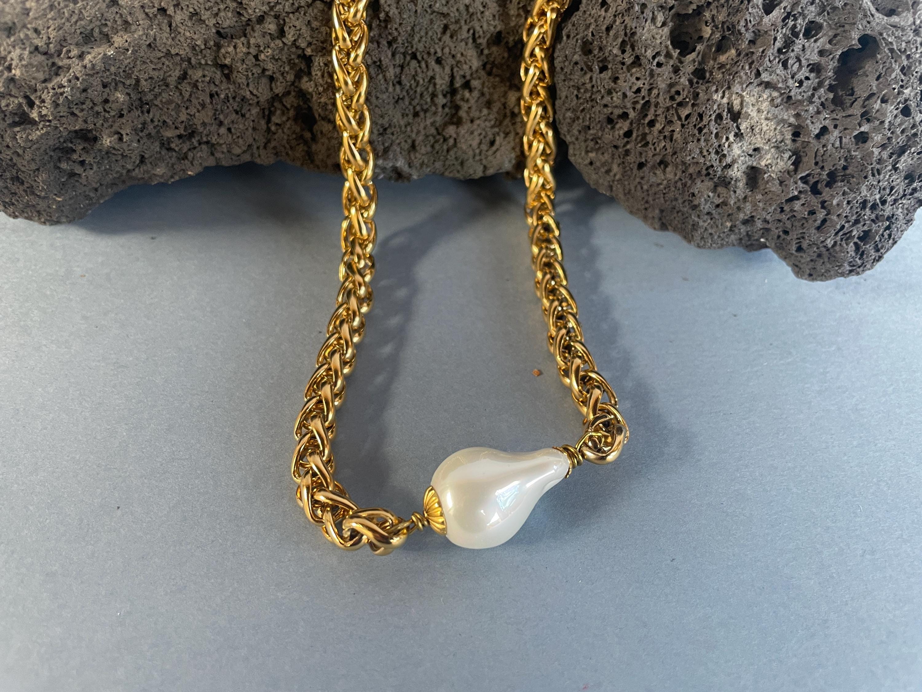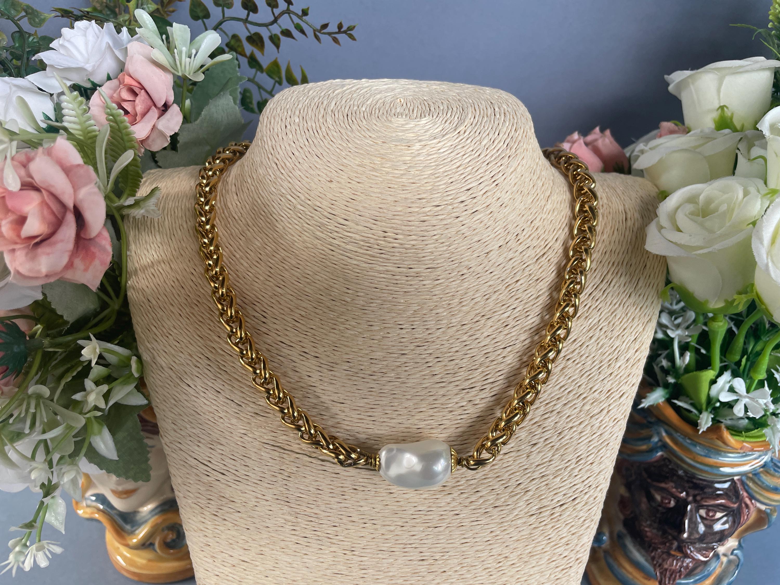 Collana con catena grossa di acciaio inox e oro, grande perla Maiorca centrale, collana oro e perla scaramazza, regalo sposa.