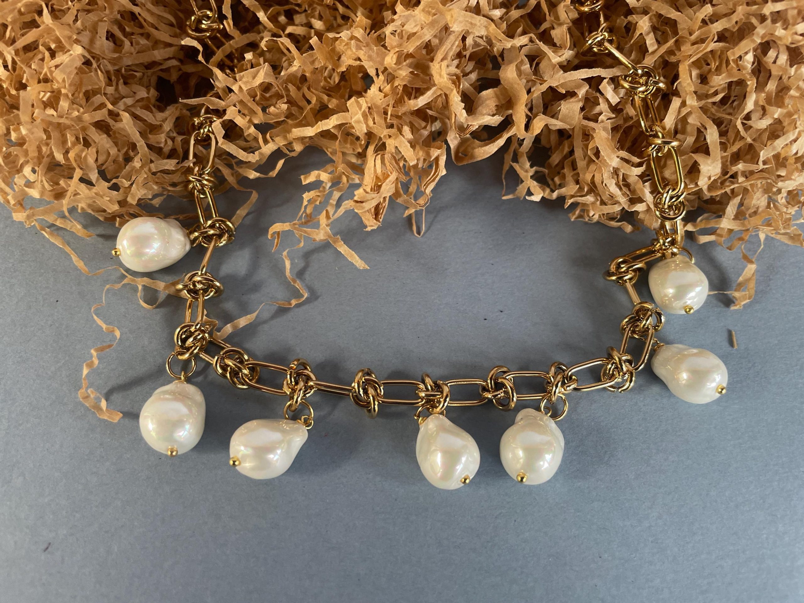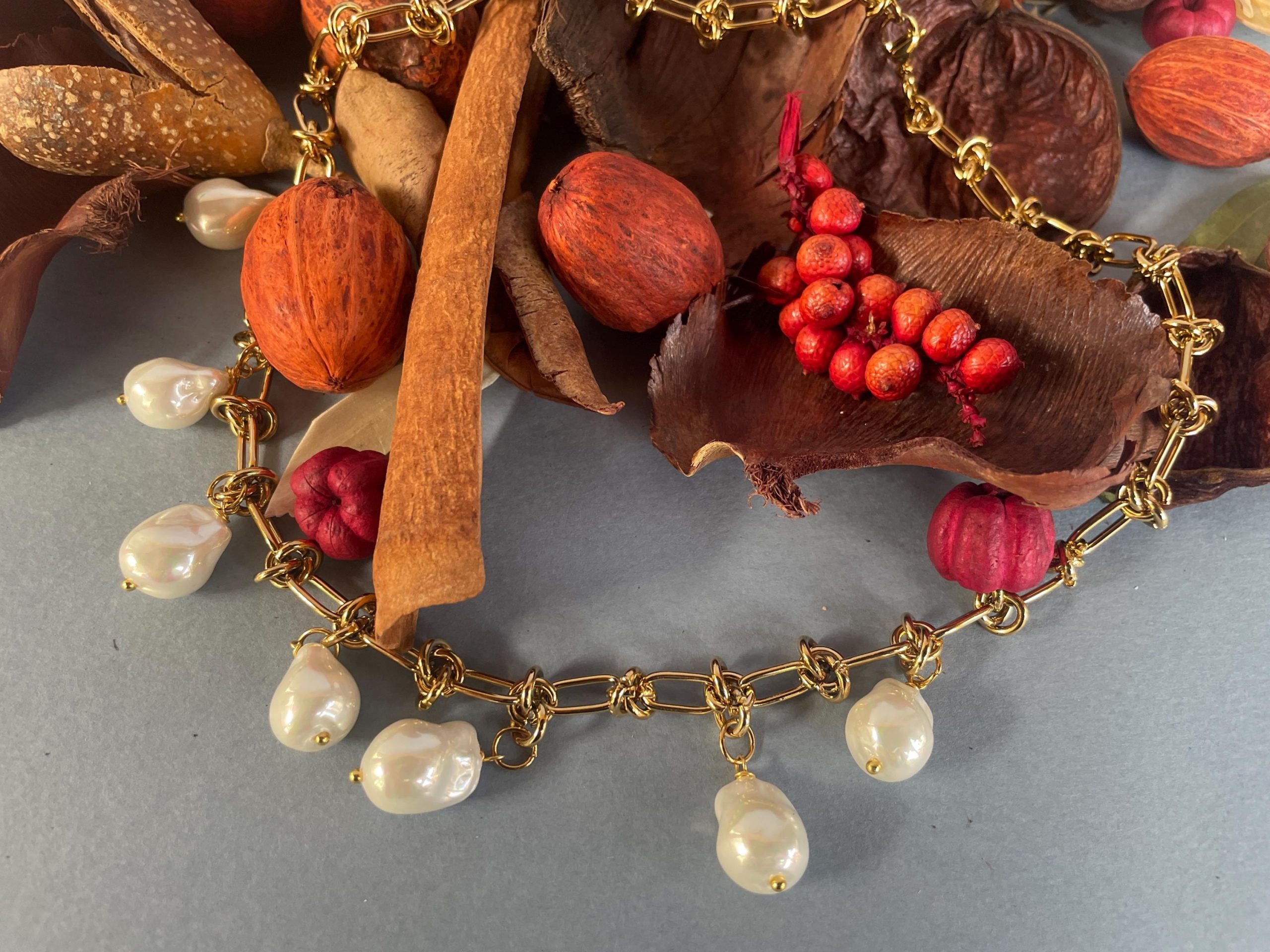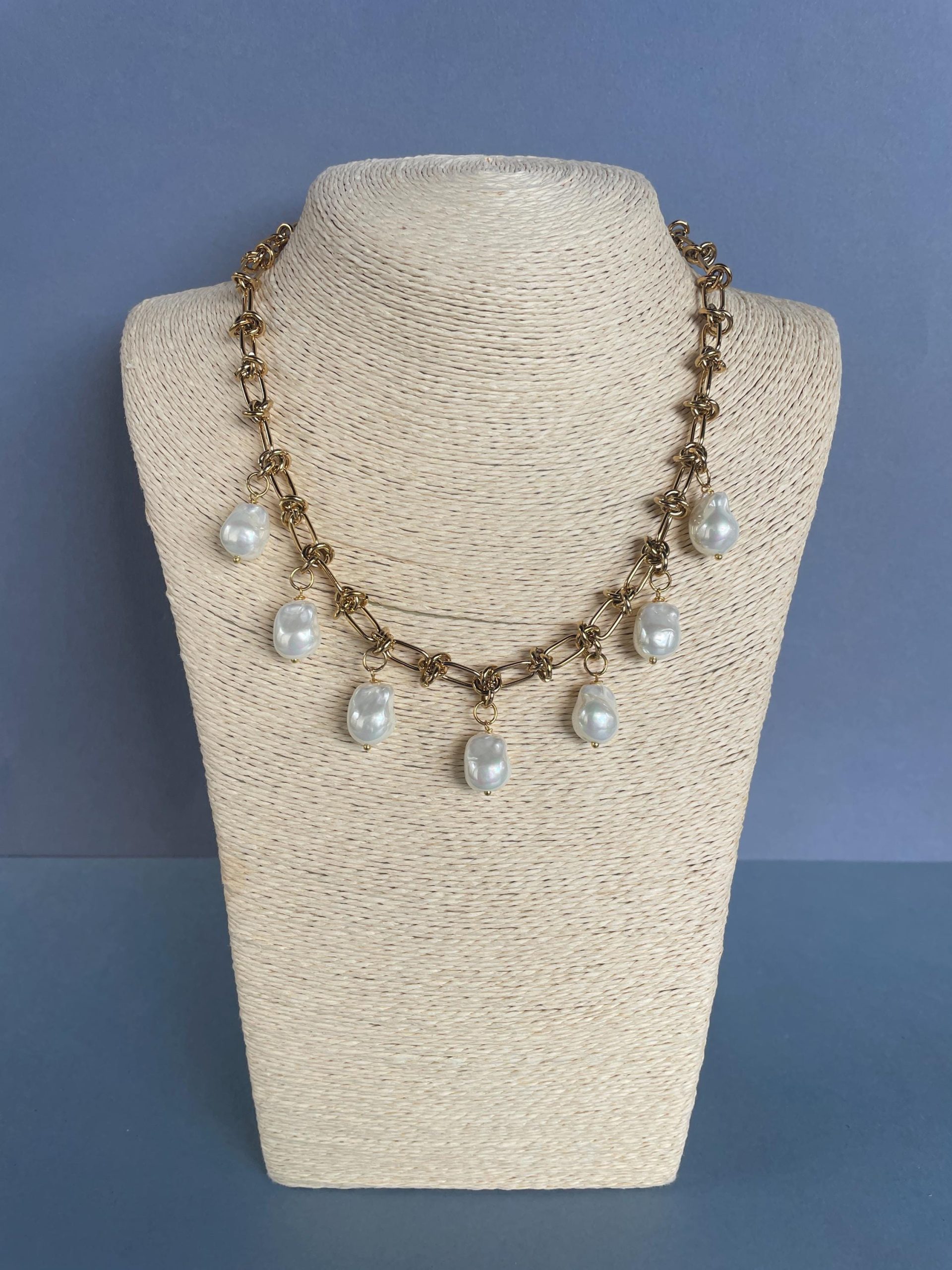 Da essa pendono 7 perle Maiorca dalla forma irregolare (tipo scaramazze).