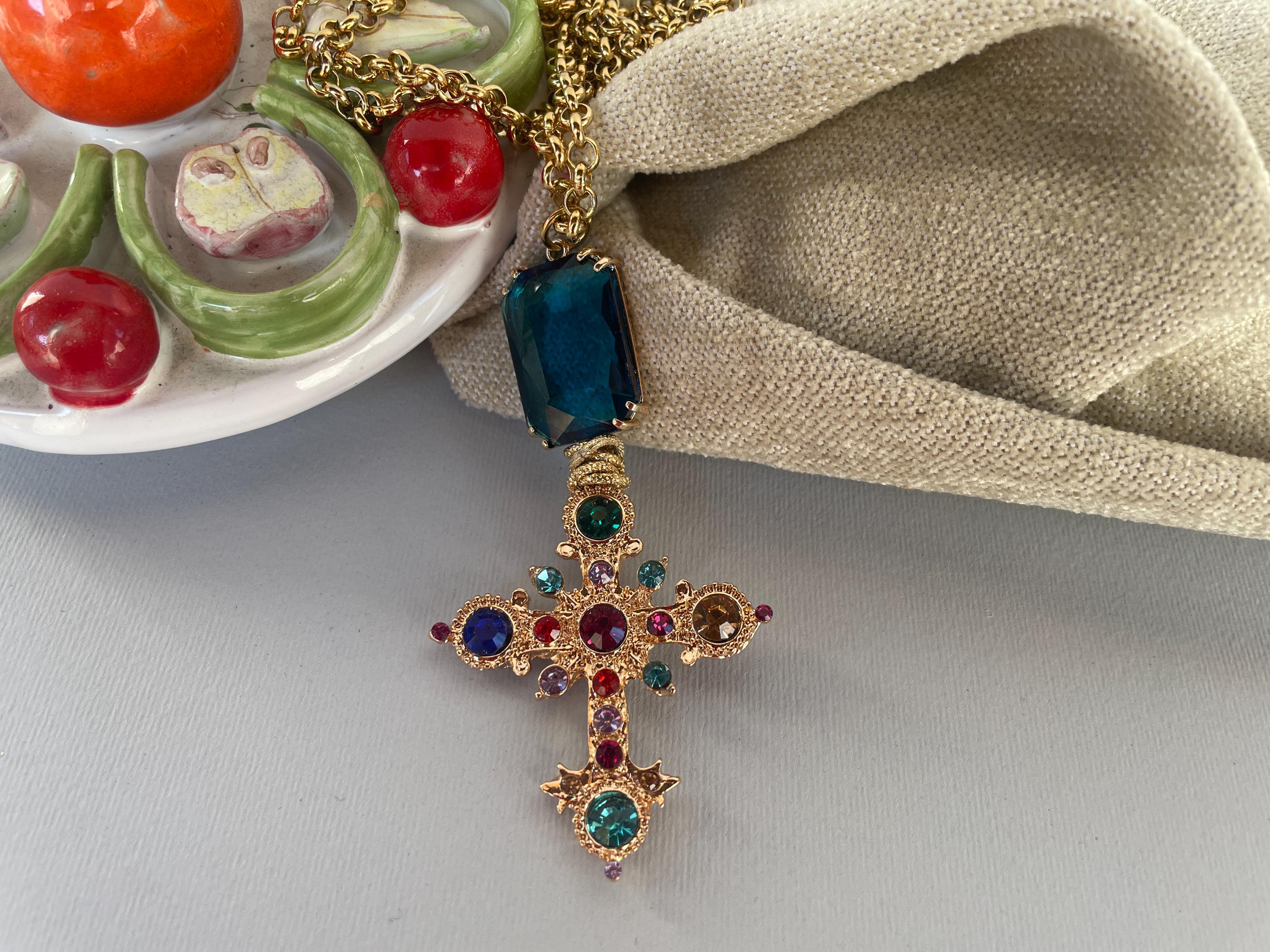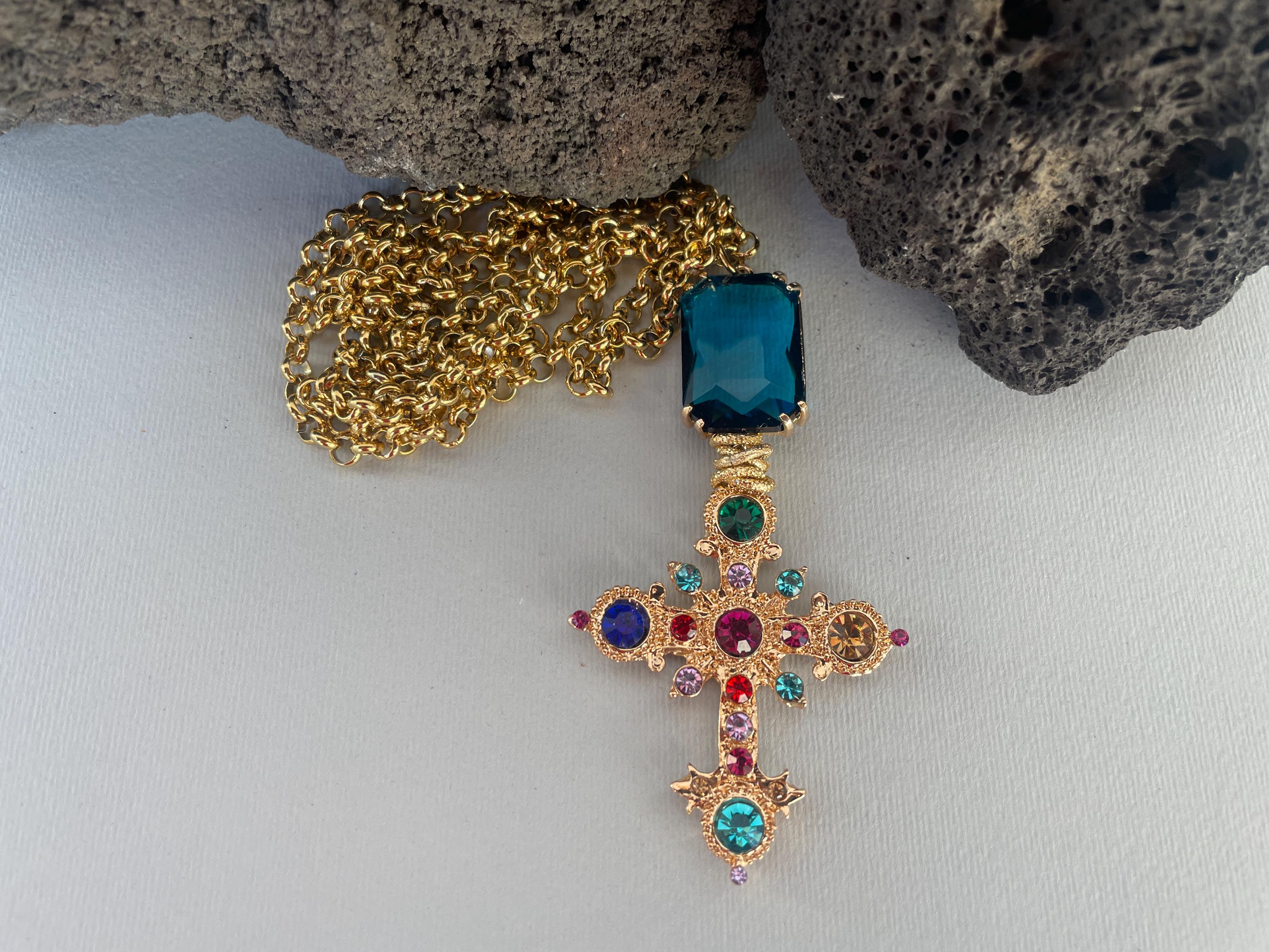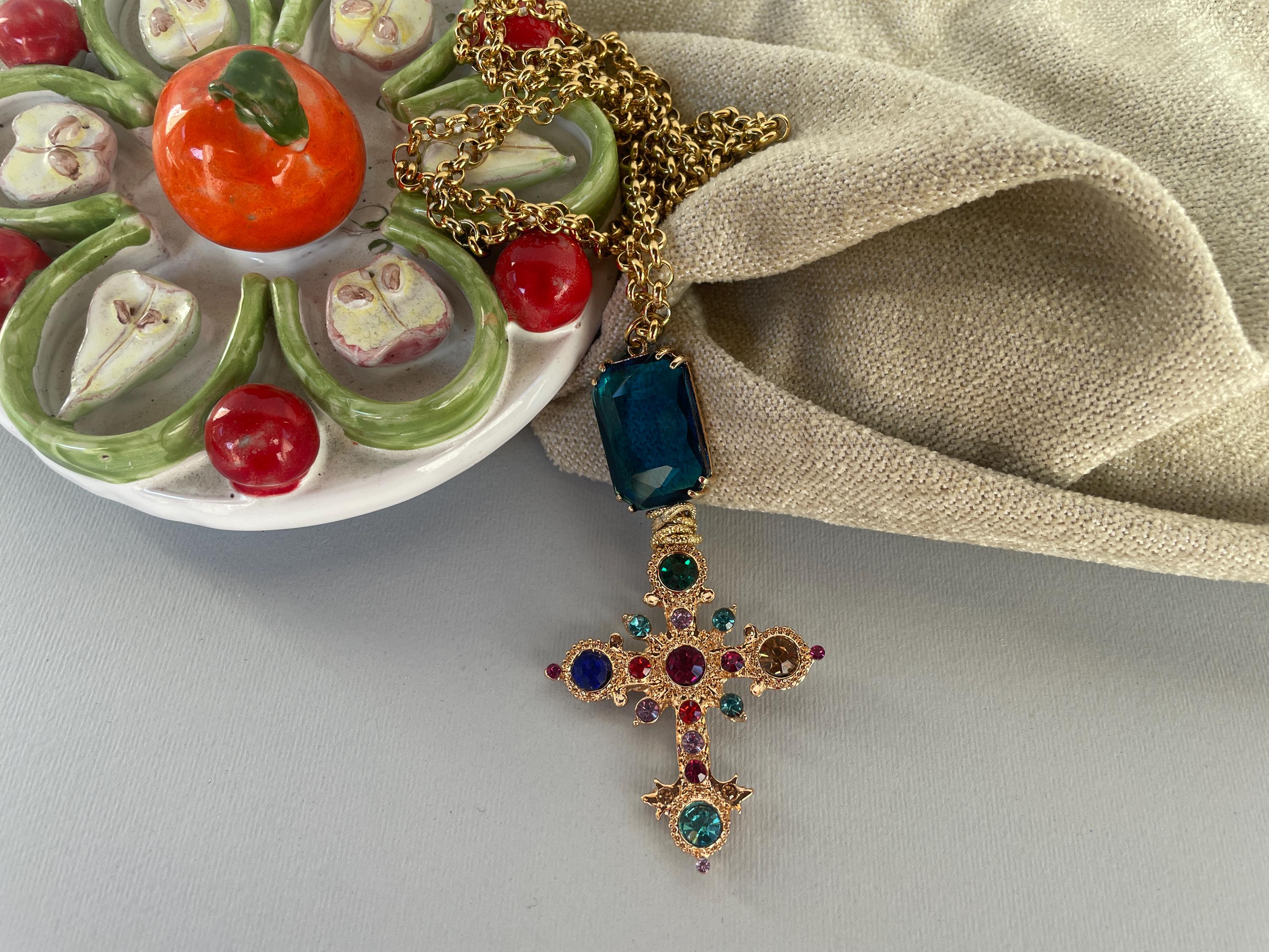 Collana dallo stile moderno con una lunga catena (cm 100/40″) in acciaio inossidabile placcato oro e un maxi ciondolo realizzato dalla combinazione di un cristallo rettangolare di colore blu incastonato su una base di ottone e una Croce dorata con cristalli multicolor.
