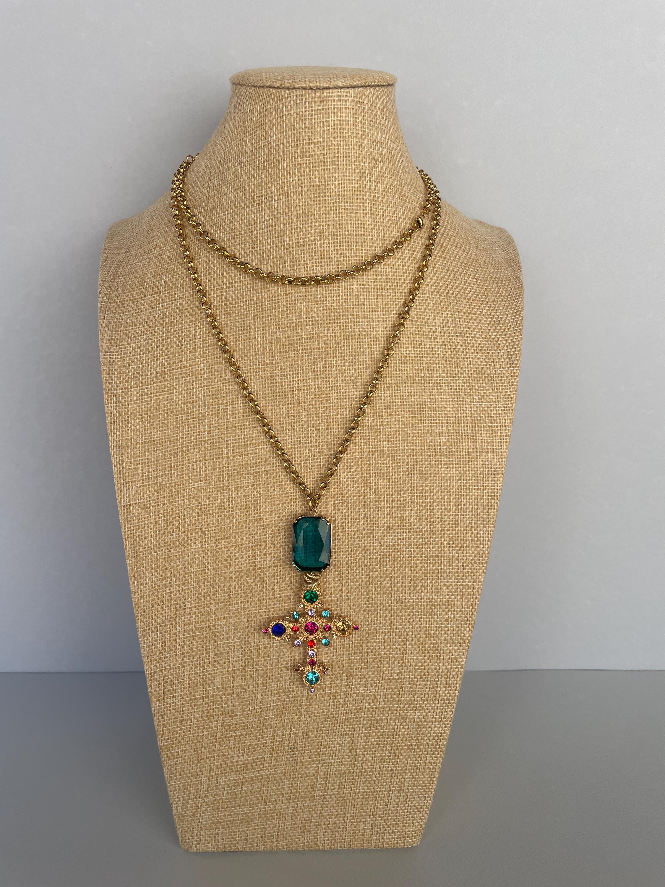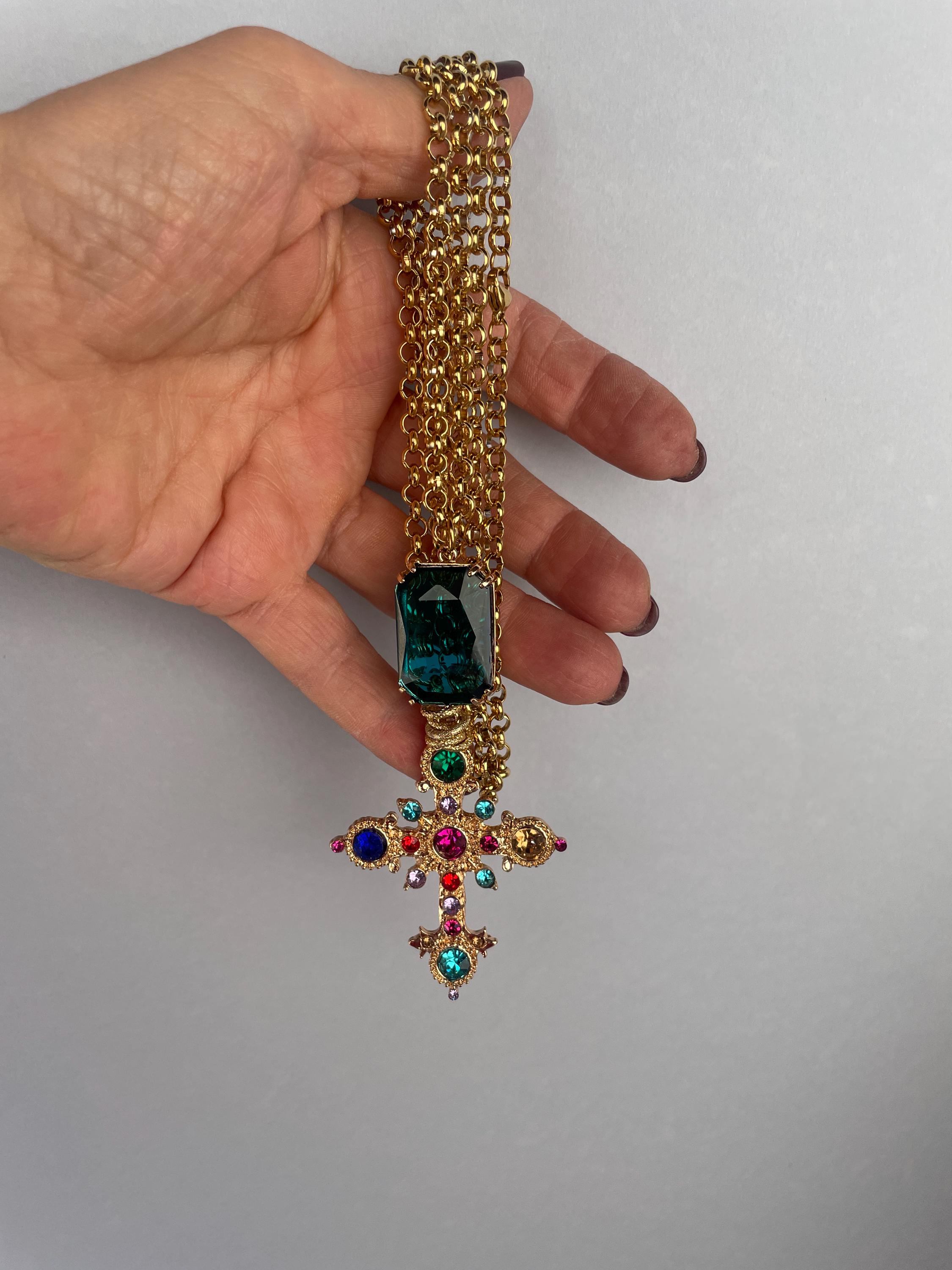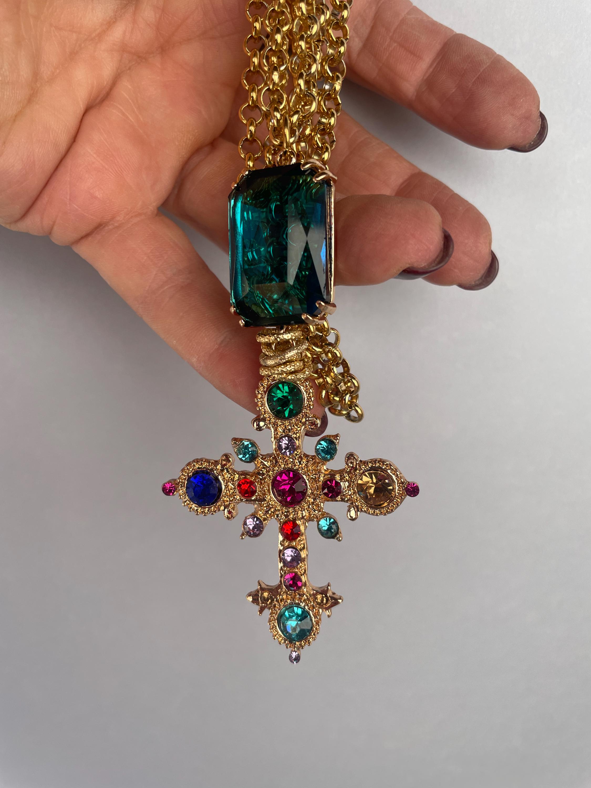 Collana dallo stile moderno con una lunga catena (cm 100/40″) in acciaio inossidabile placcato oro e un maxi ciondolo realizzato dalla combinazione di un cristallo rettangolare di colore blu incastonato su una base di ottone e una Croce dorata con cristalli multicolor.
